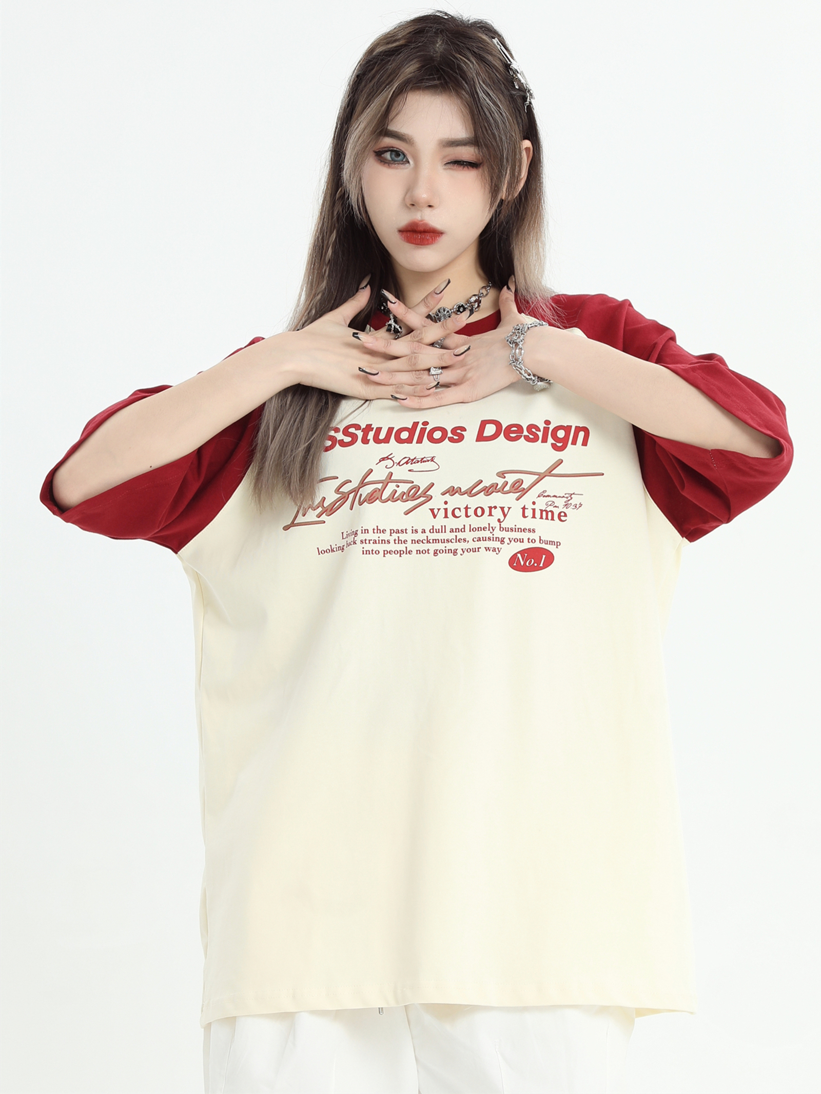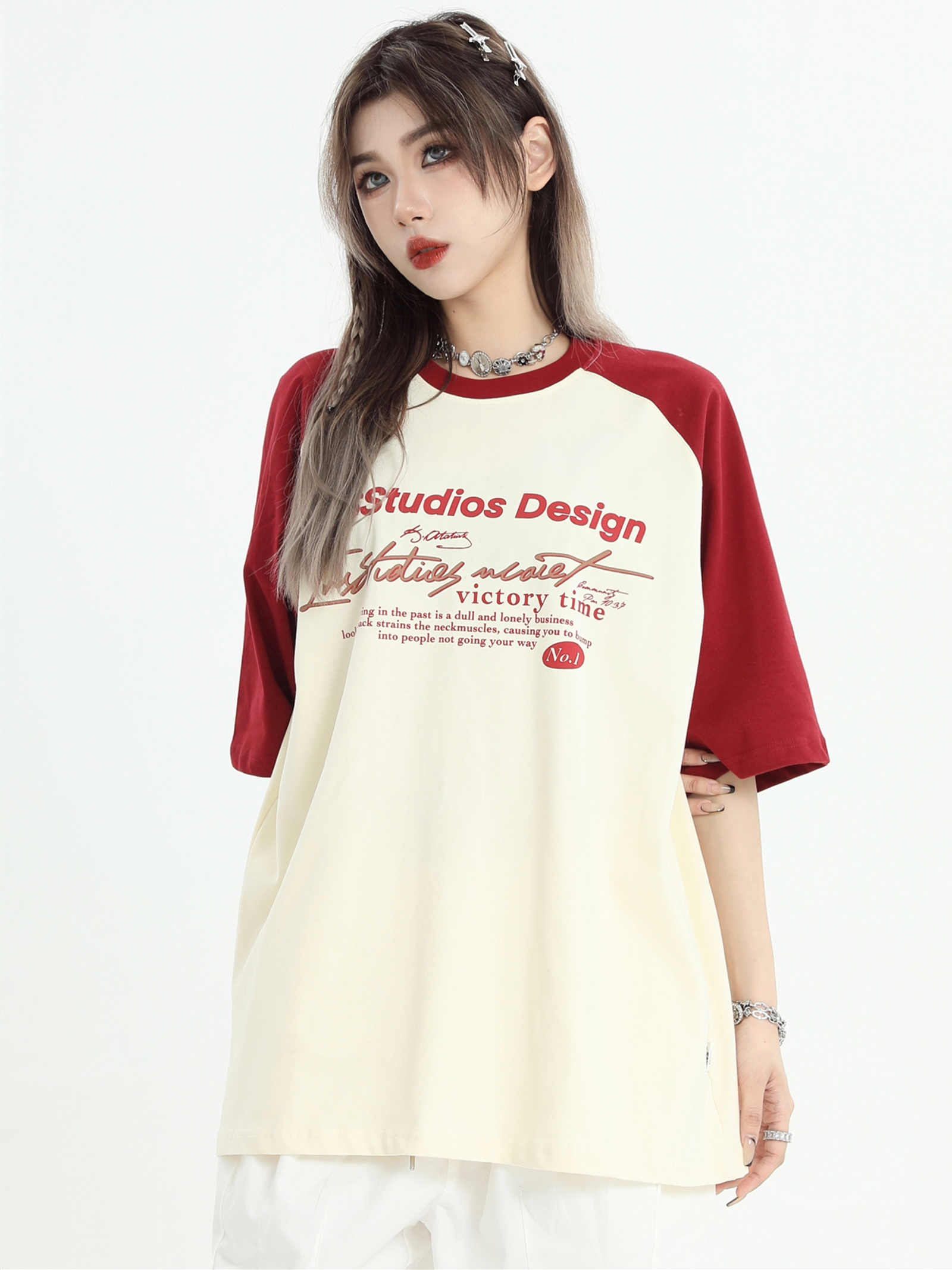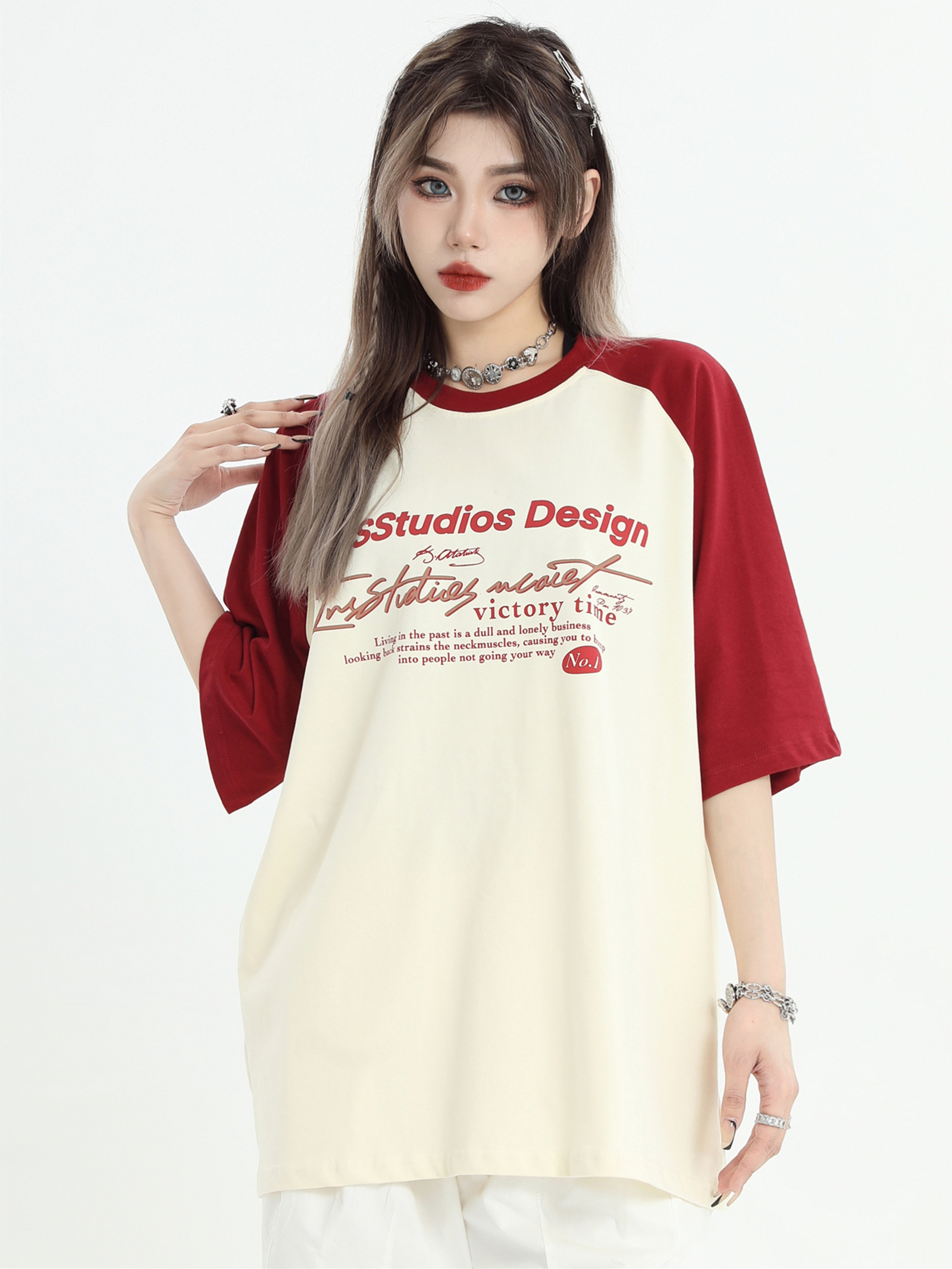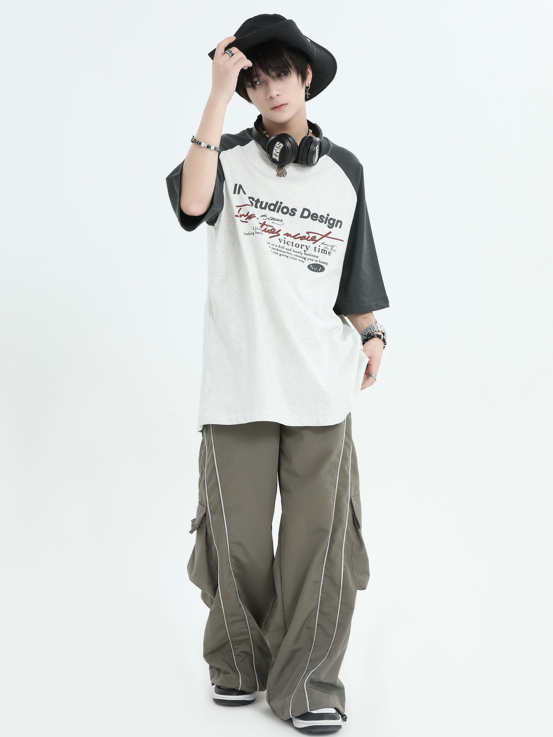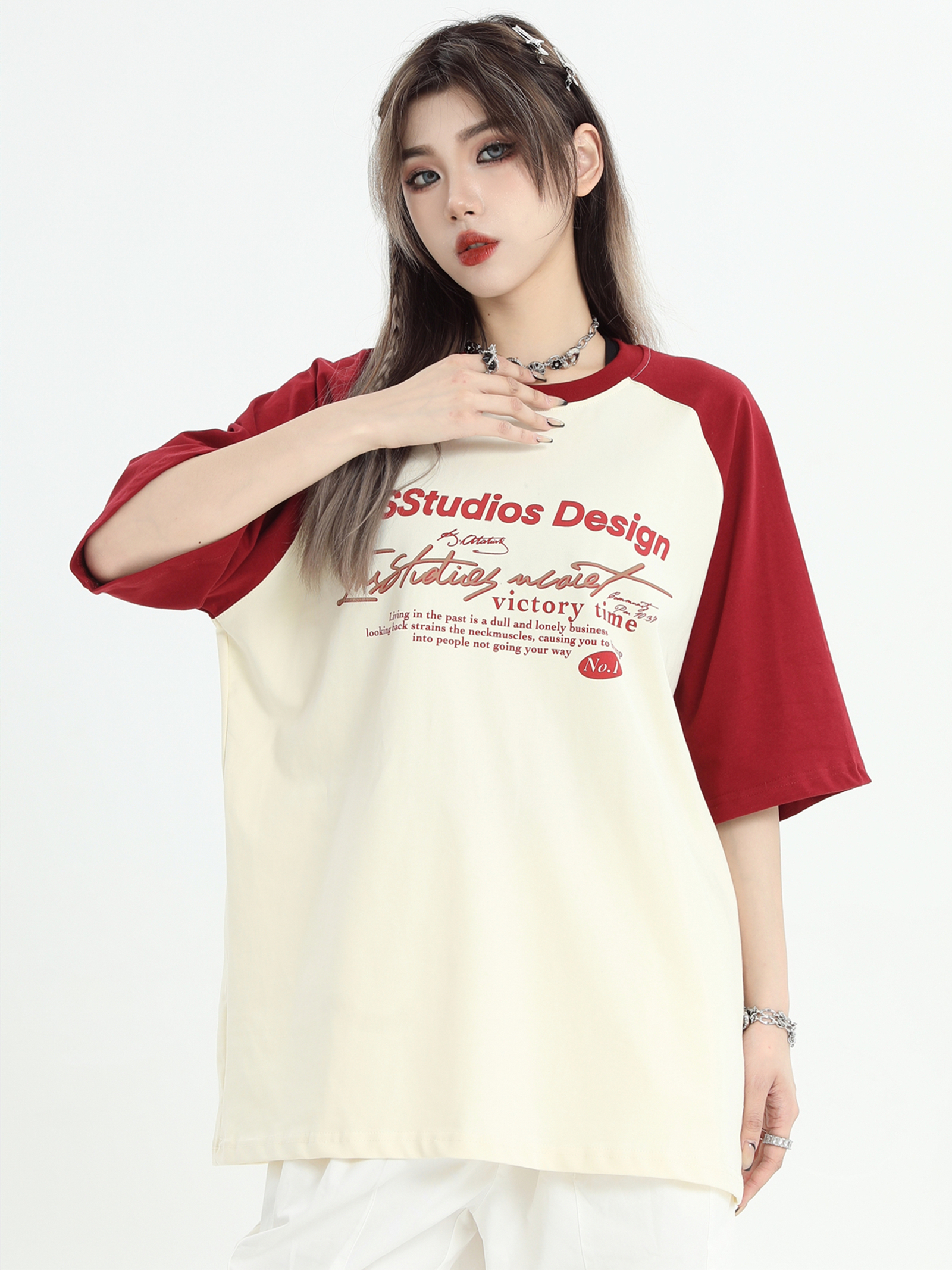 INSstudios 國潮牌情侶美式插肩袖LOGO印花撞色短袖寬鬆半袖T恤男