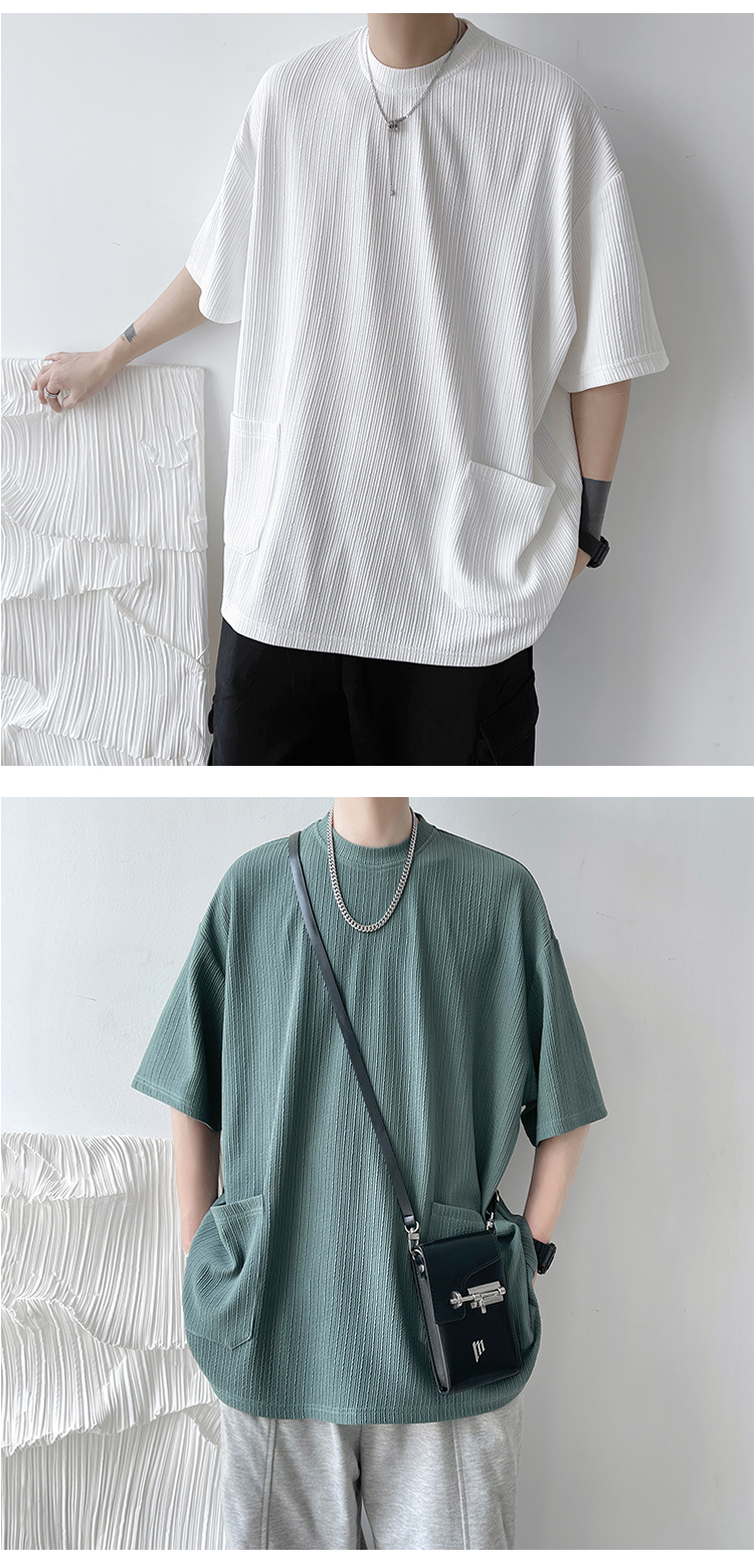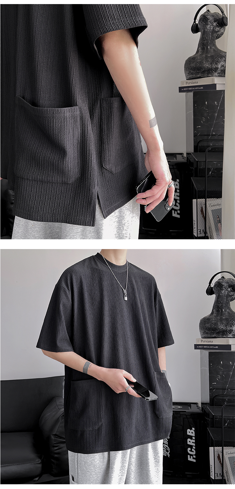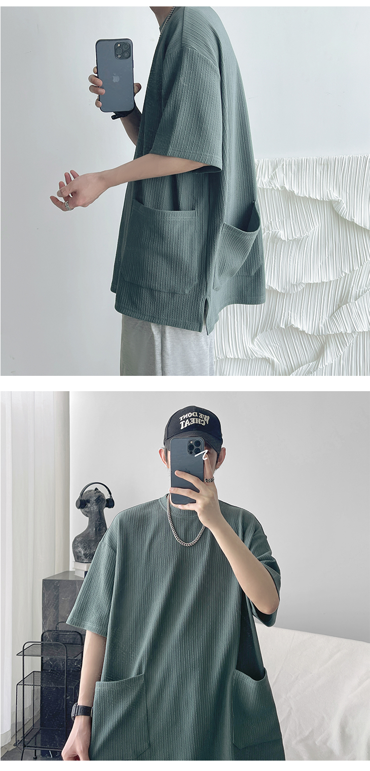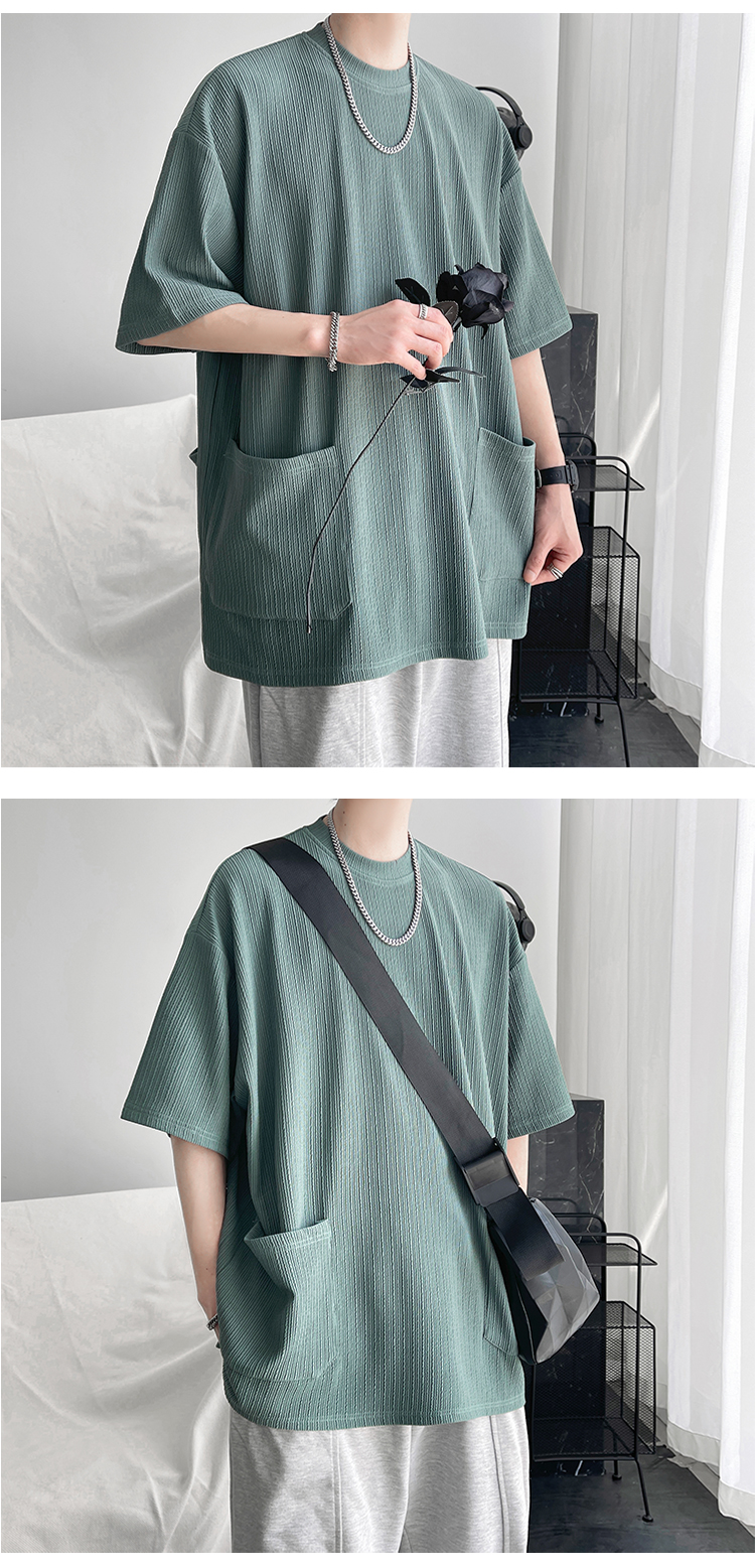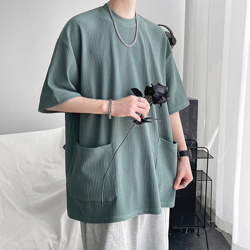 墨綠色冰絲短袖t恤男士夏季潮牌多口袋半袖上衣大尺碼寬鬆速乾T恤T
