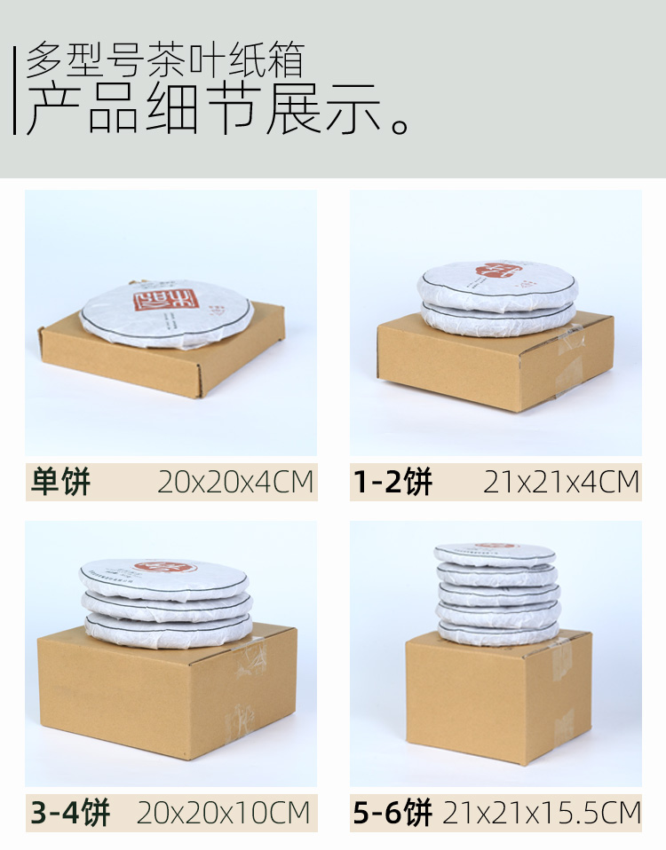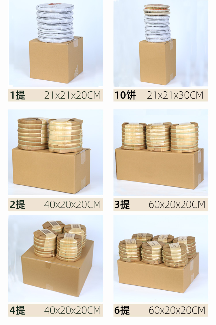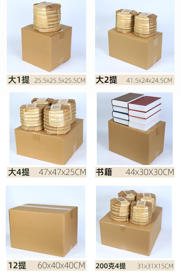 瓦楞 7饼/1提21*21*21,5饼21*21*16,3饼21*21*10,2饼21*21*7,单饼21*21*4,2提40*20*20,4提40*40*20,6提60*40*20,12提60*40*40,3提60*20*20,10饼21*21*30,12提加高60*40*50,15KG散茶箱70*44*45,200克4提装31*31*15,200克6提装47*32*15,200克12提装45*30*25,大1提装25*25*25,大2提装41*24*24,大4提装47*47*25,大6提装62*45*22,大单饼装33*33*12,大双饼装33*33*20,书箱44*30*30,中箱52*34*39