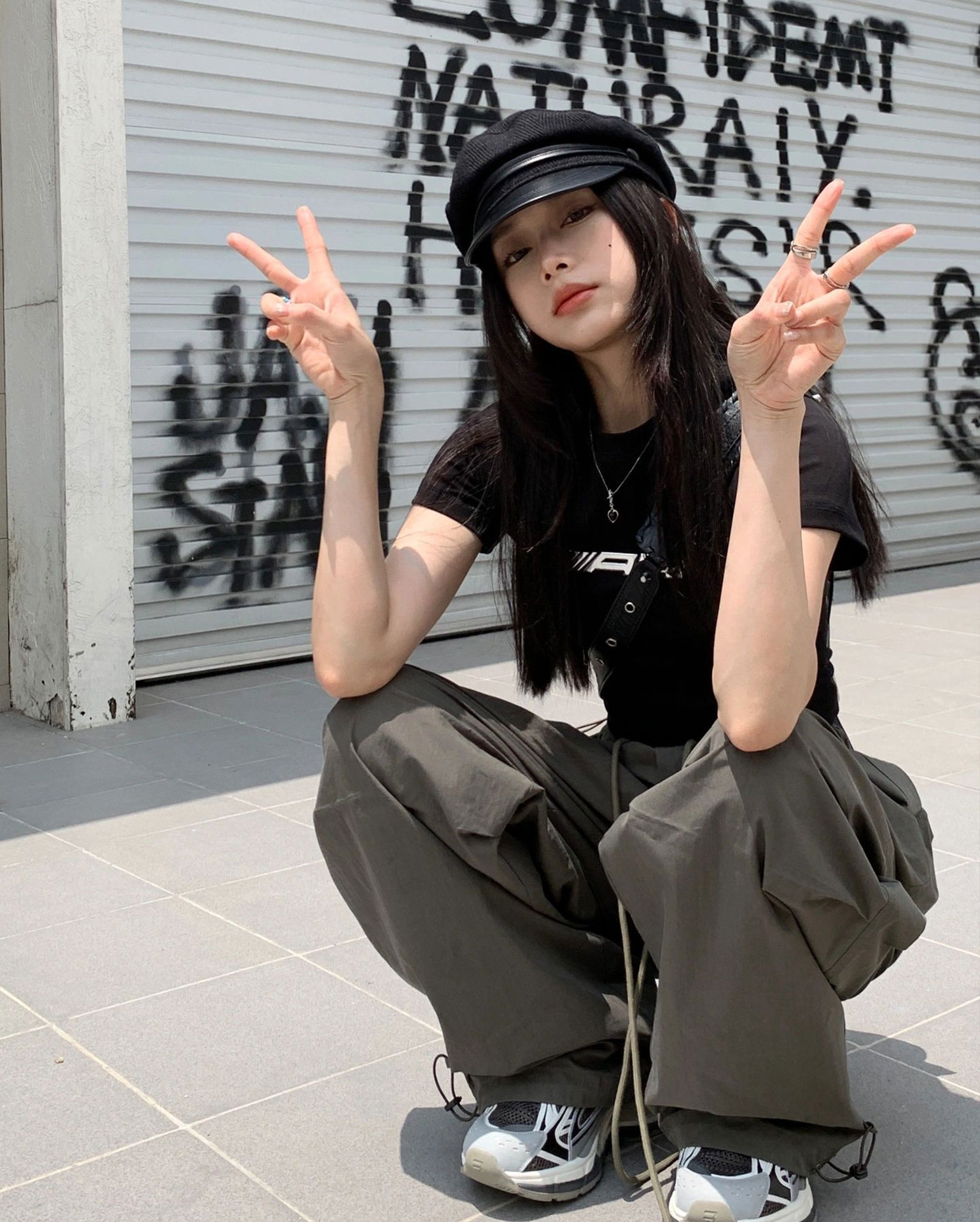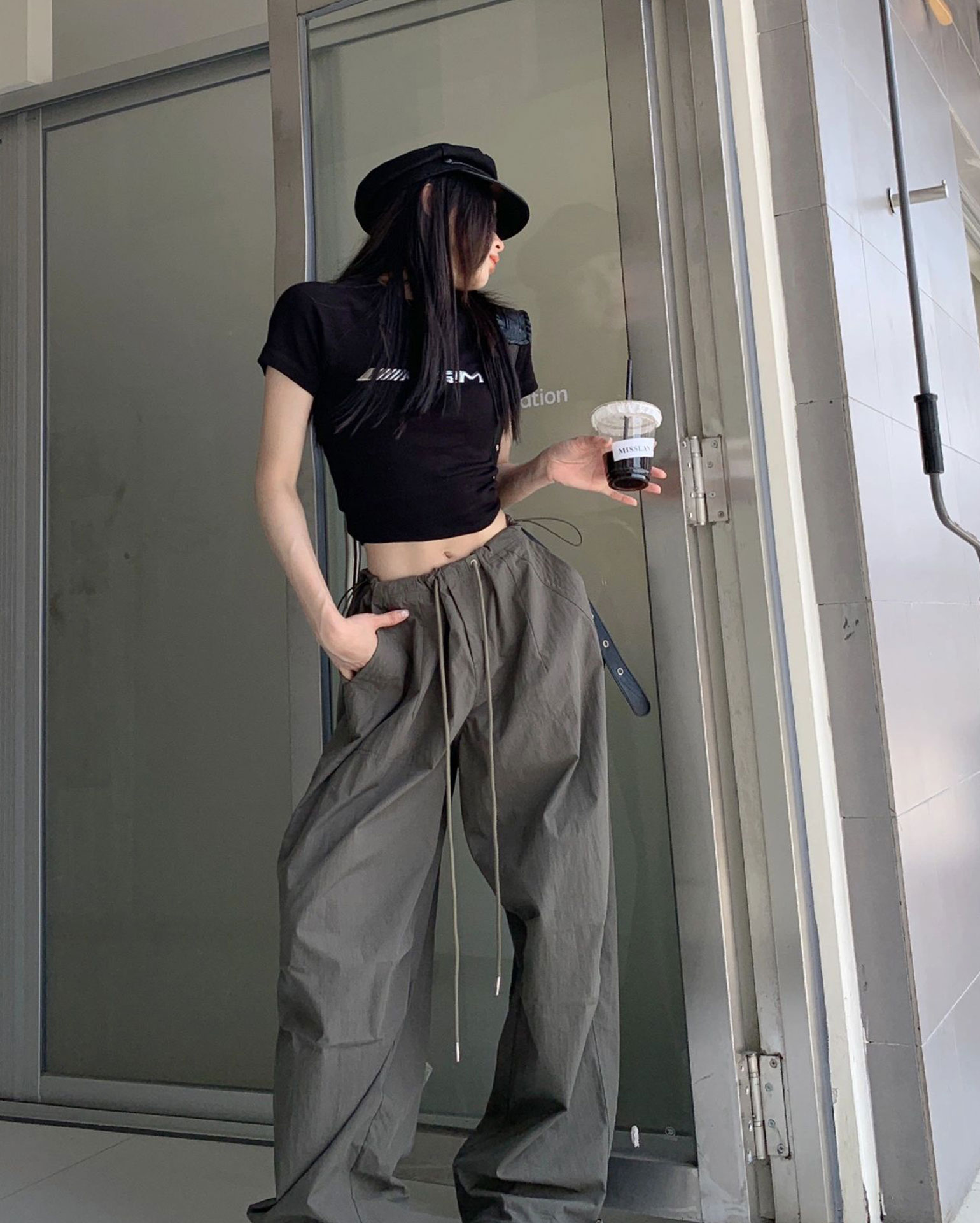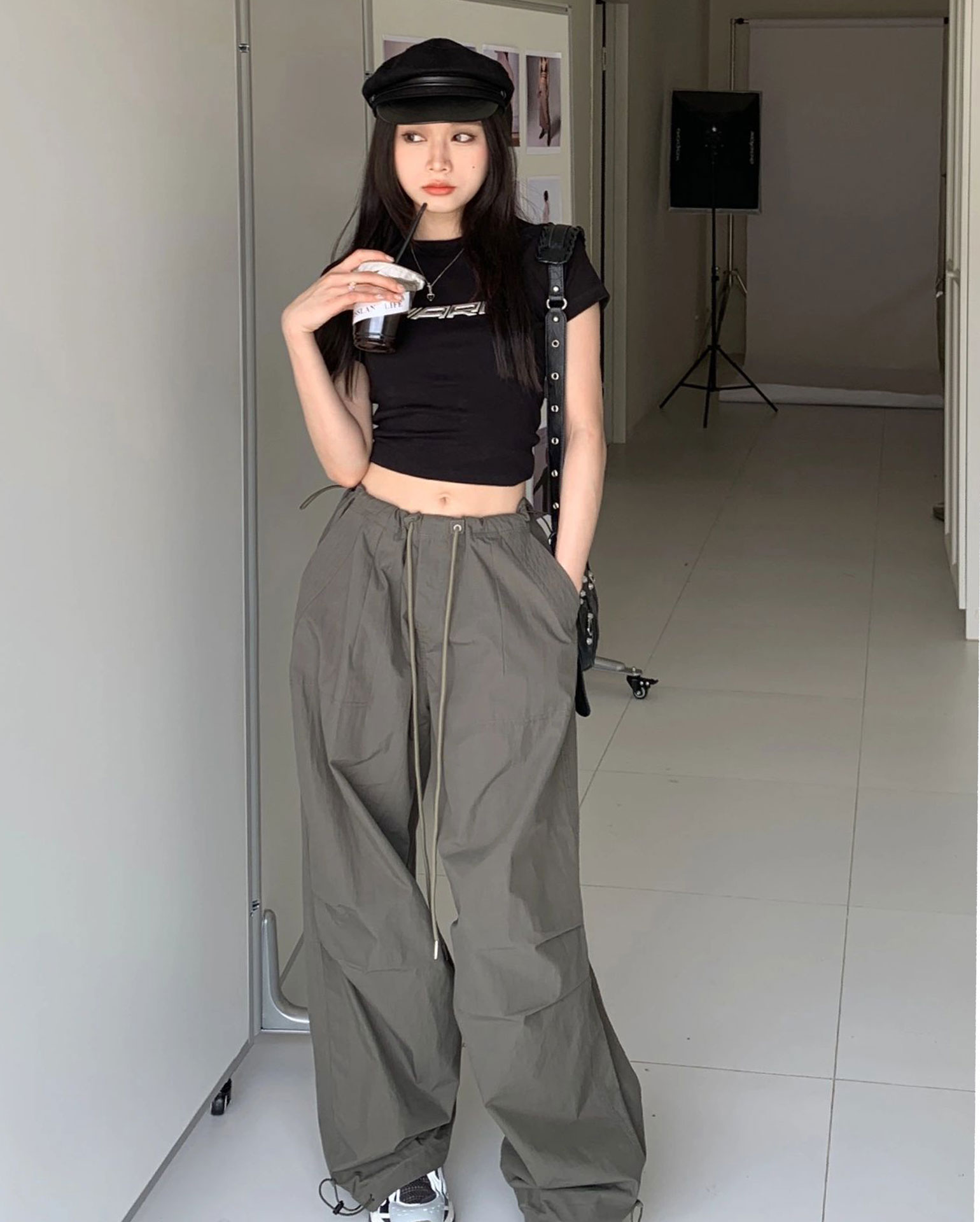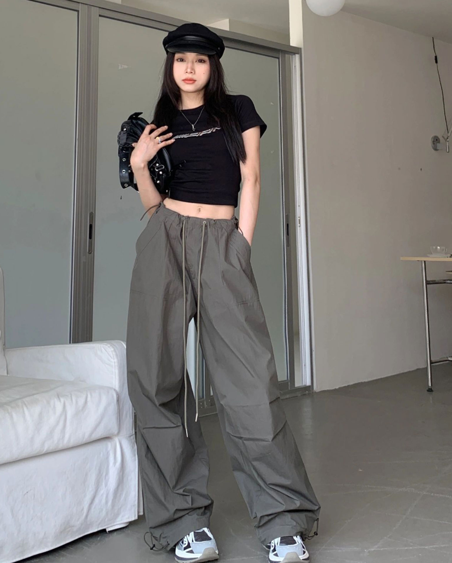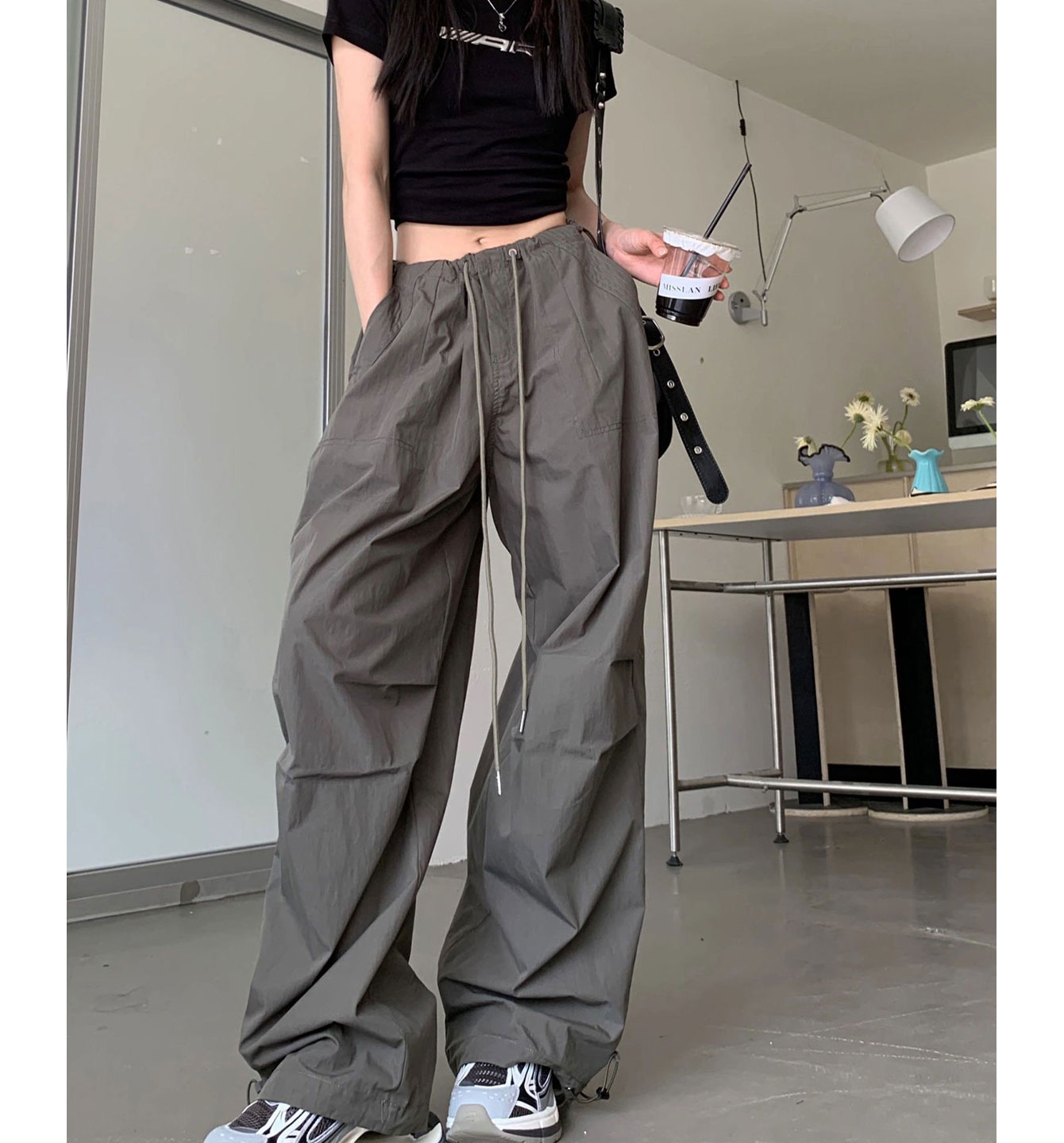 美式復古工裝褲女夏季薄款抽繩降落傘褲寬鬆垂感顯瘦hiphop拖地褲