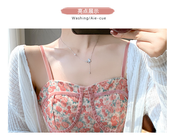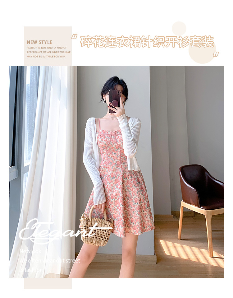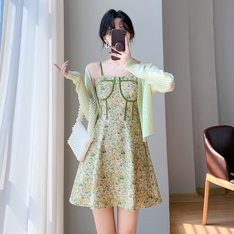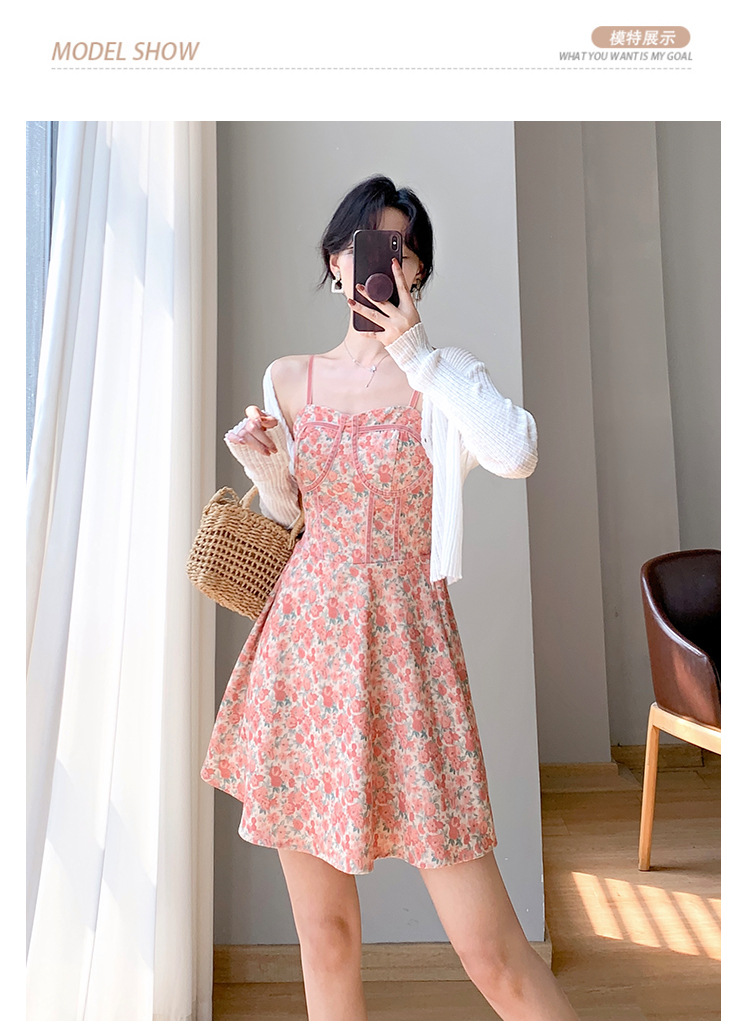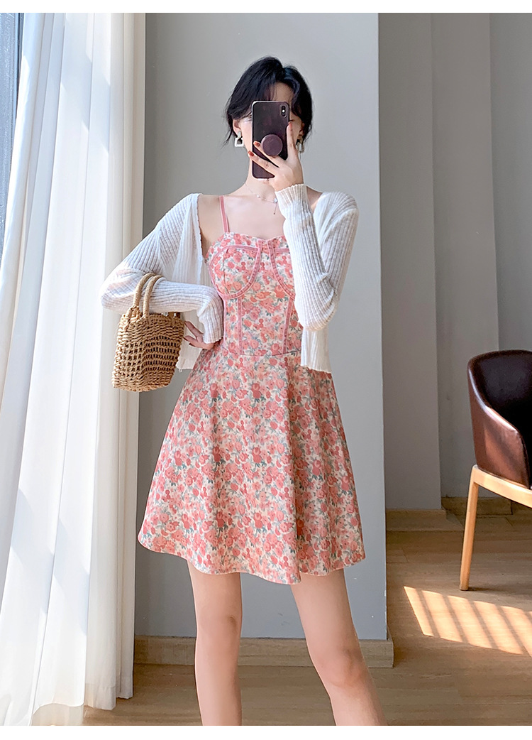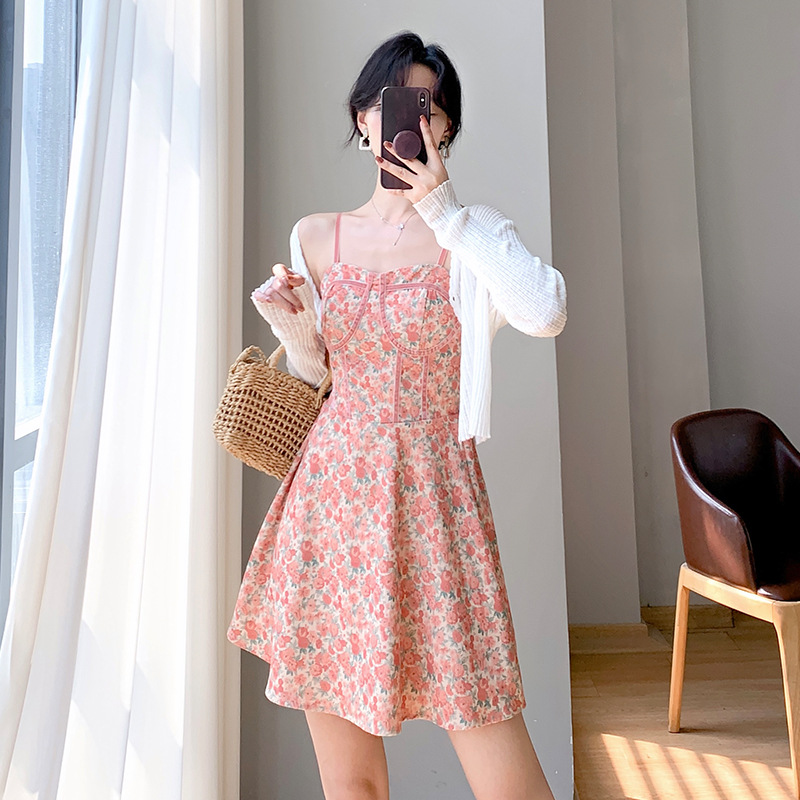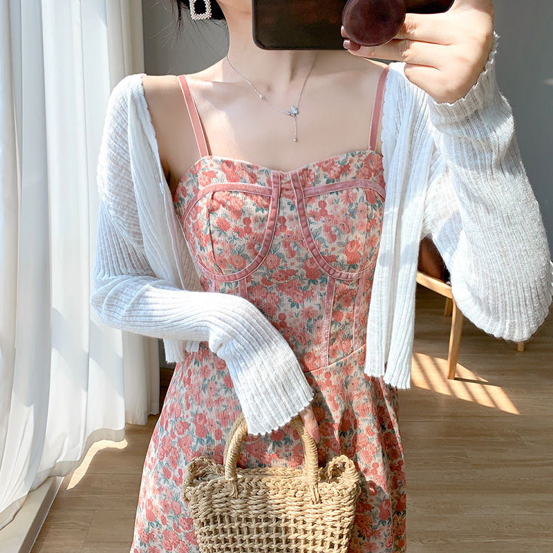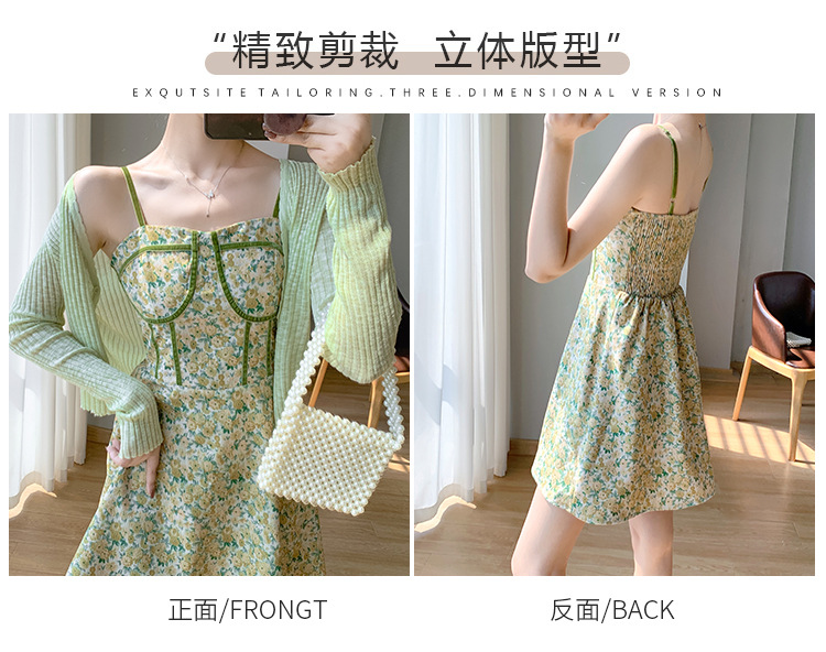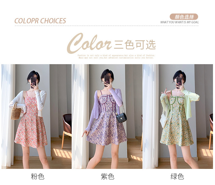 2023夏装新款法式小众设计感收腰气质碎花吊带连衣裙两件套连衣裙