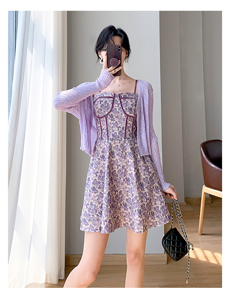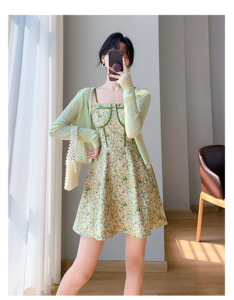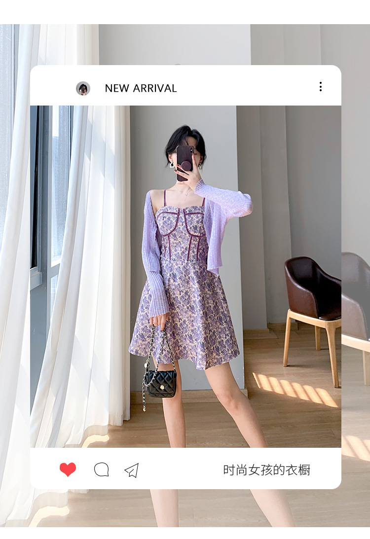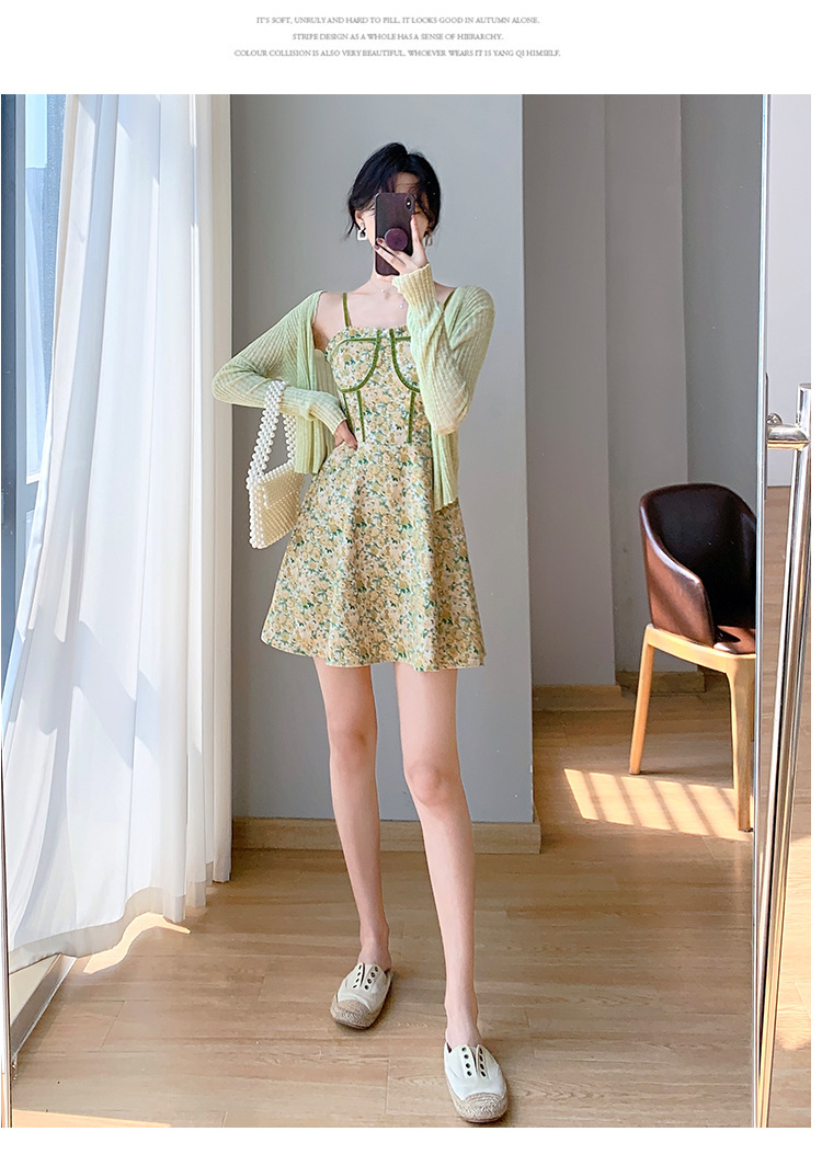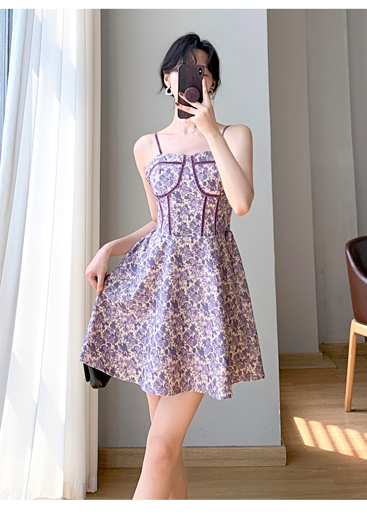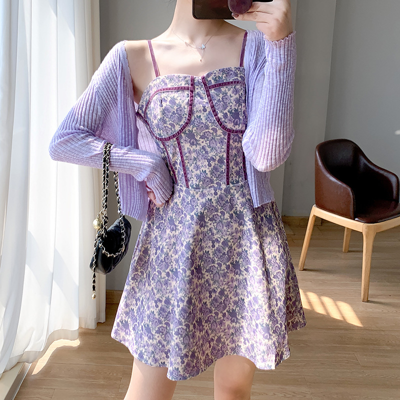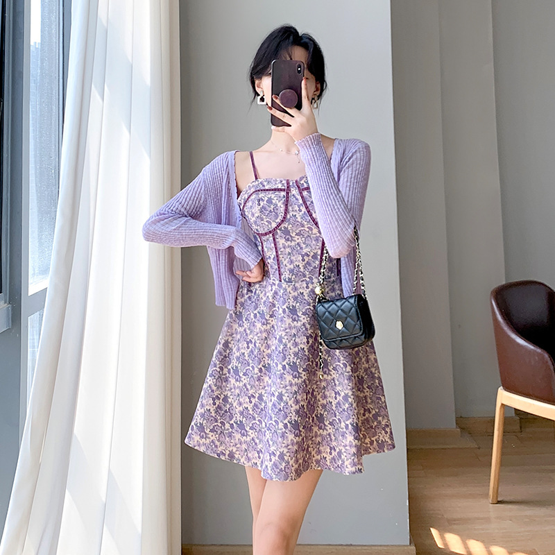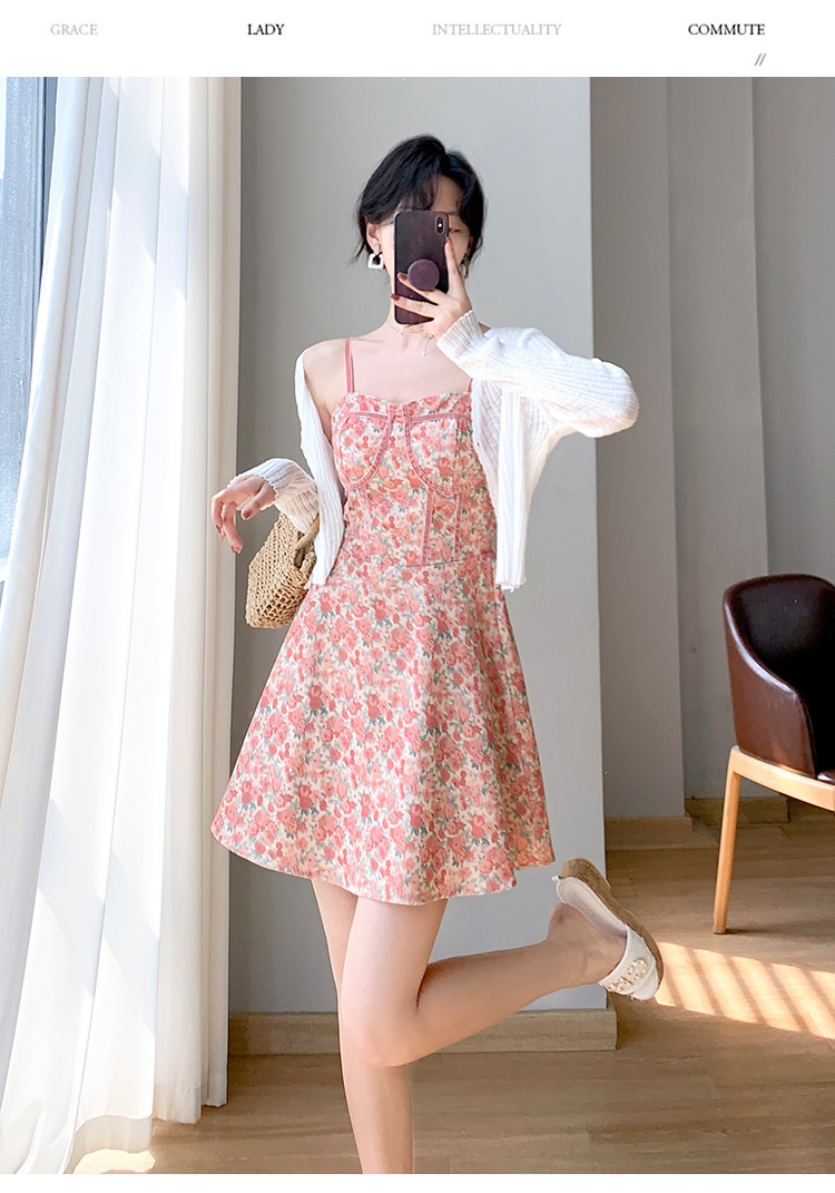 2023夏装新款法式小众设计感收腰气质碎花吊带连衣裙两件套连衣裙