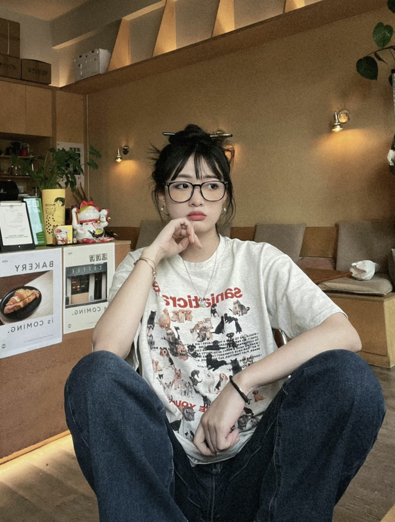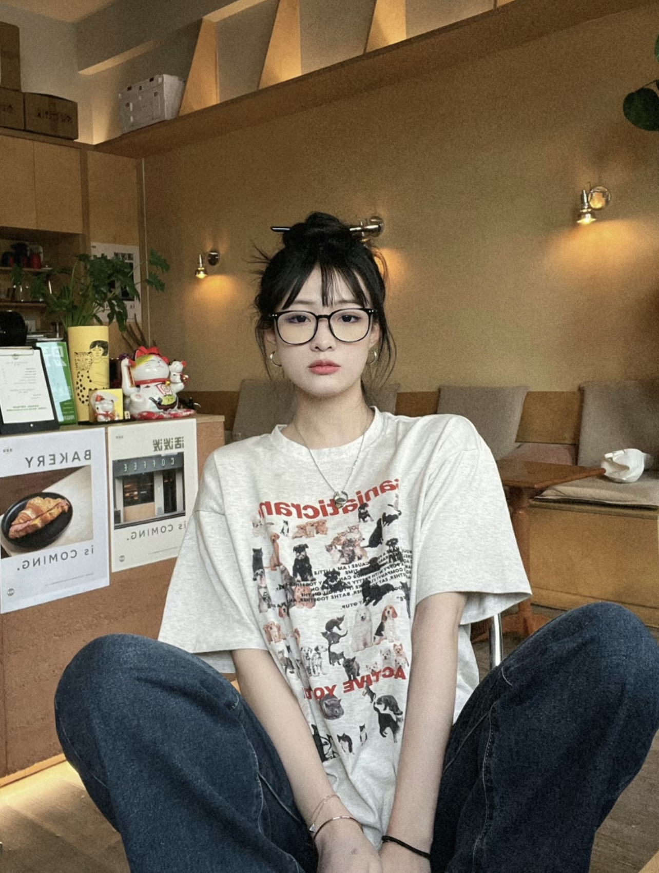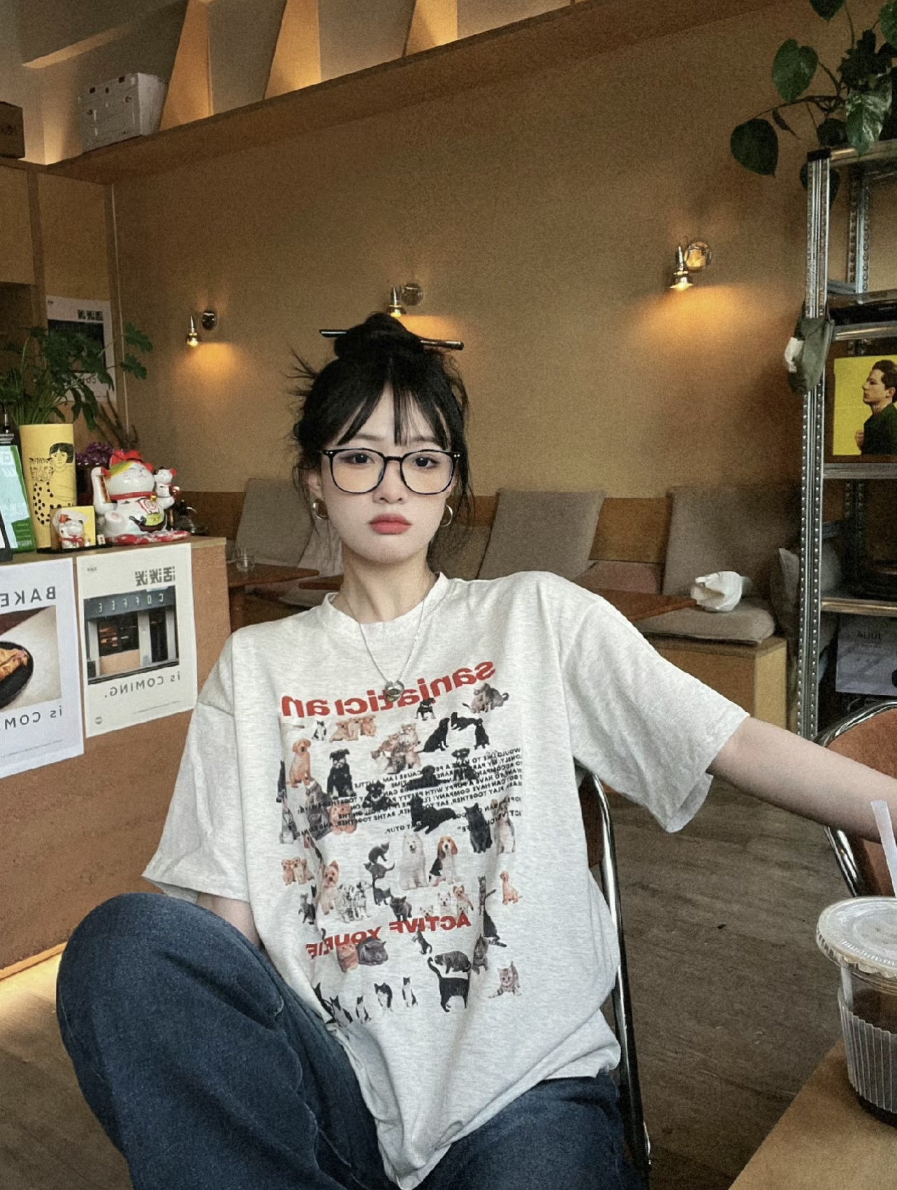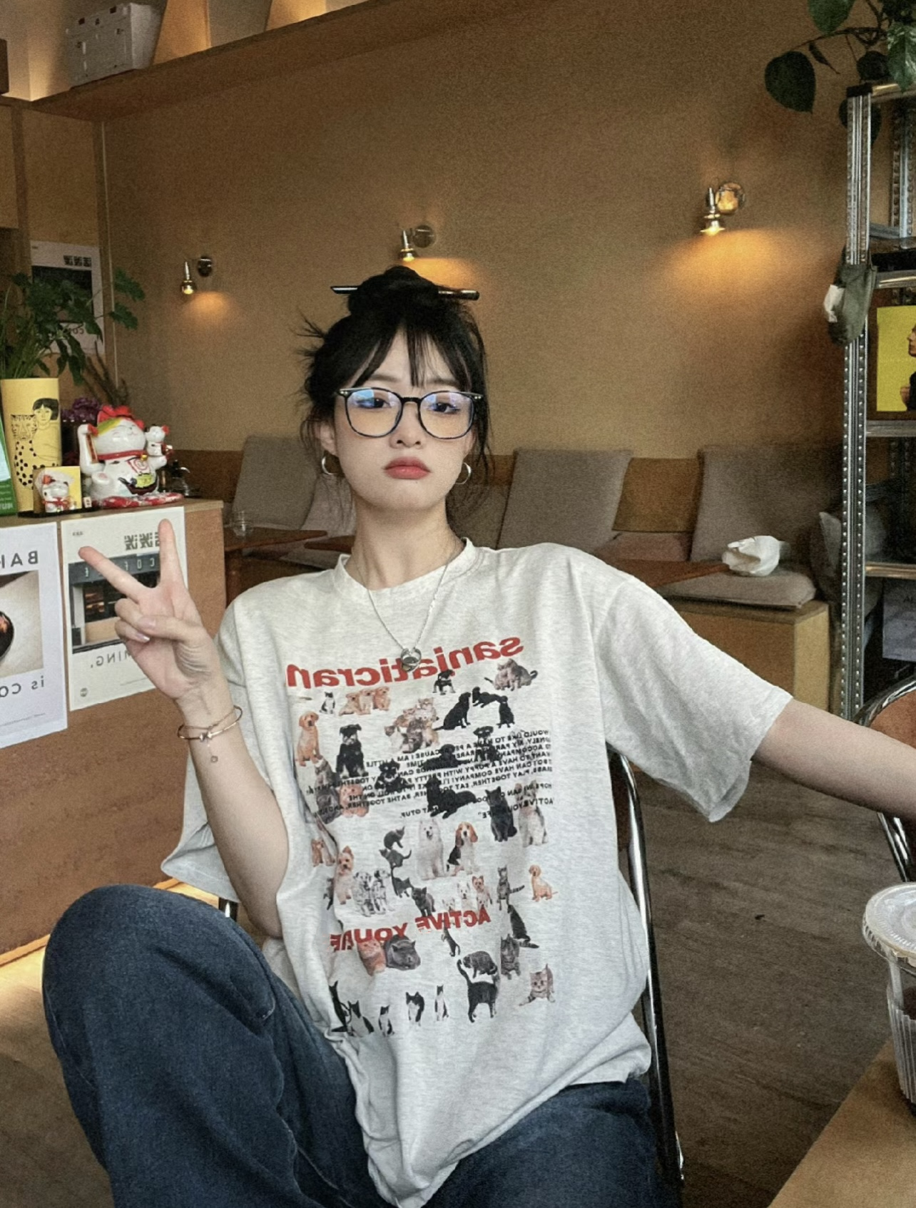美式復古貓咪小狗減齡灰色純棉圓領短袖T恤女夏季新款寬鬆上衣ins