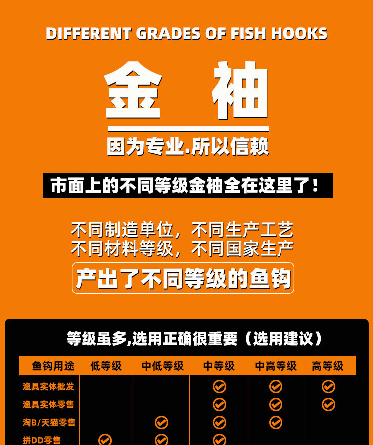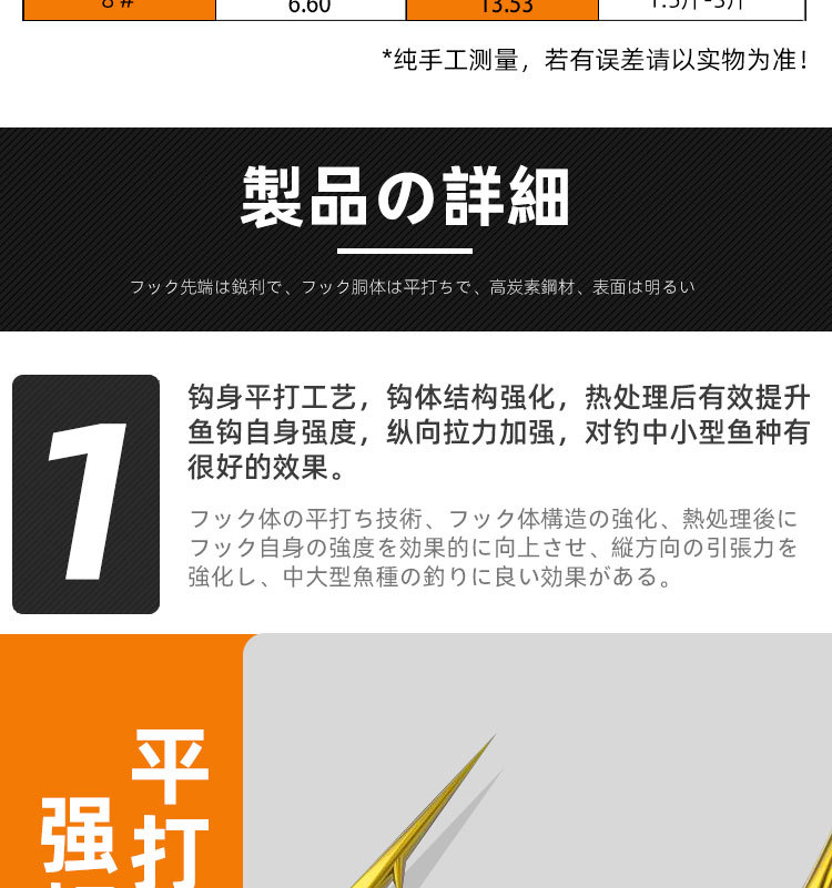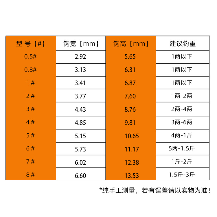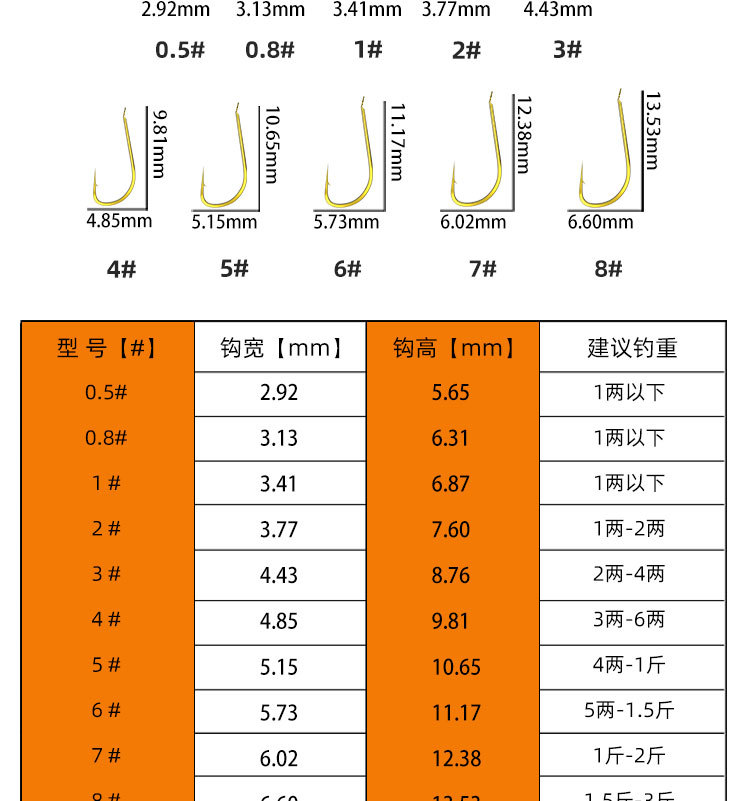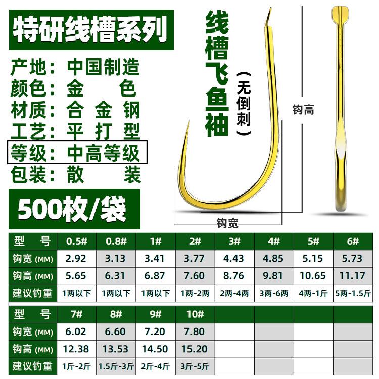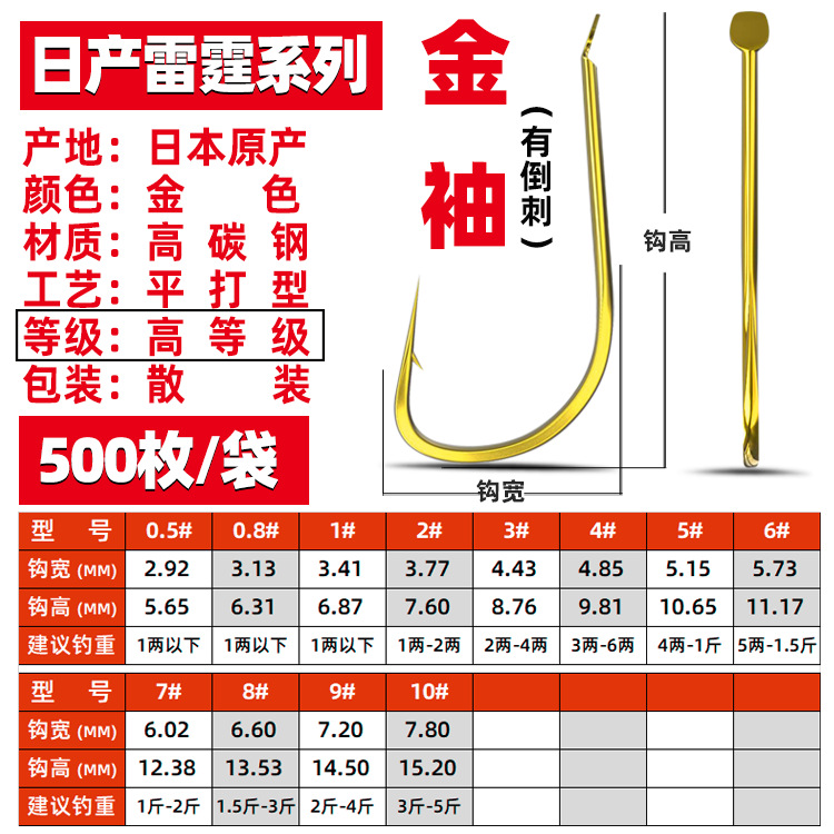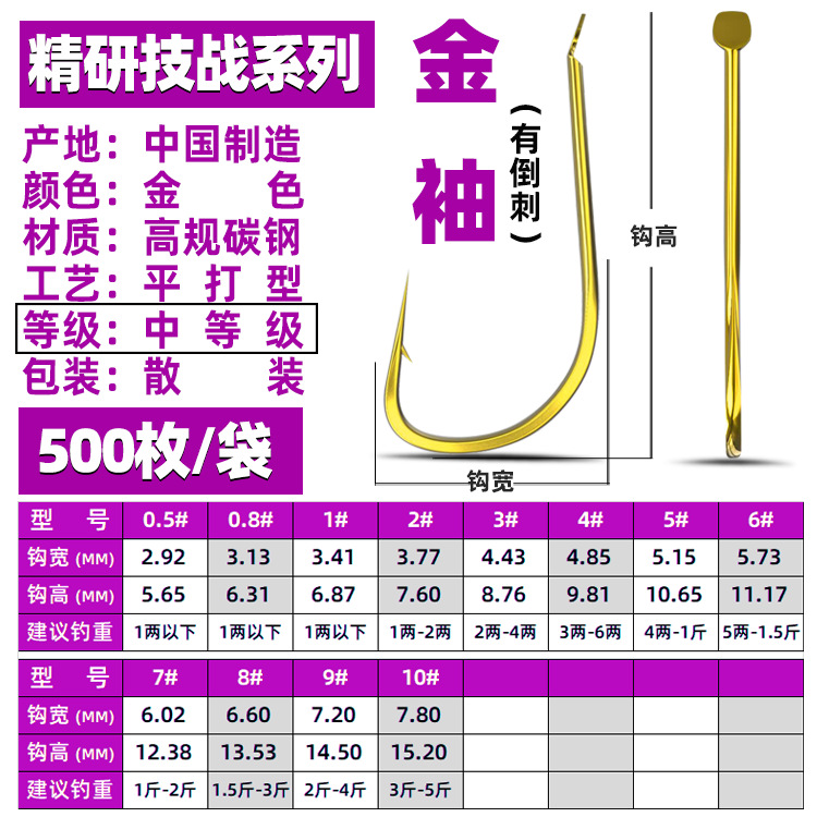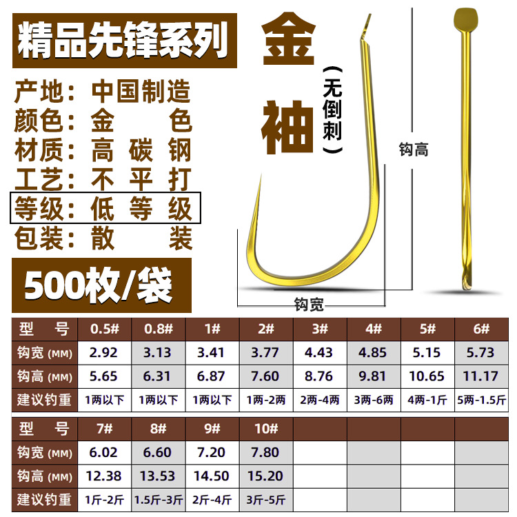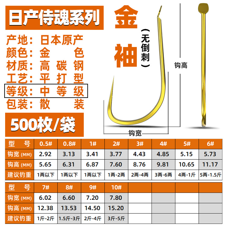 说明:散装鱼钩500枚/包为最小包装,单个型号请以500枚的倍数下单,否则无法发货,介意者慎拍,造成不便,敬请谅解!