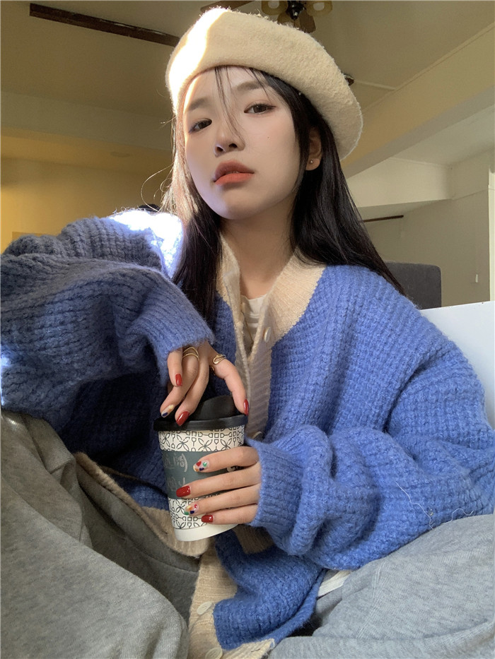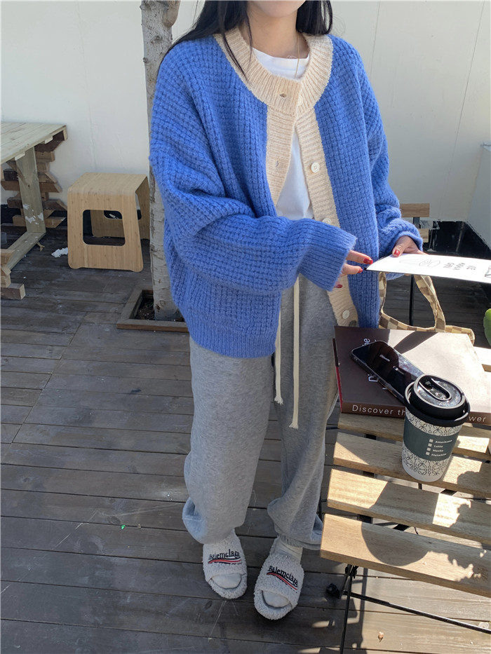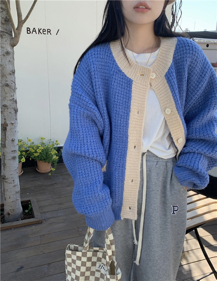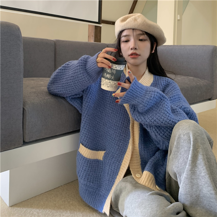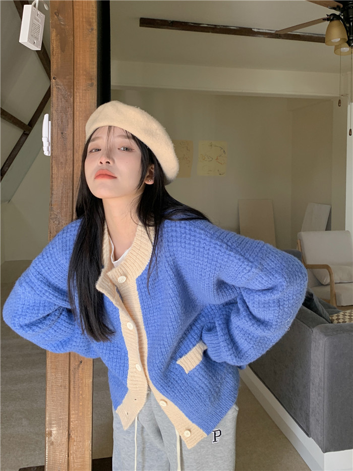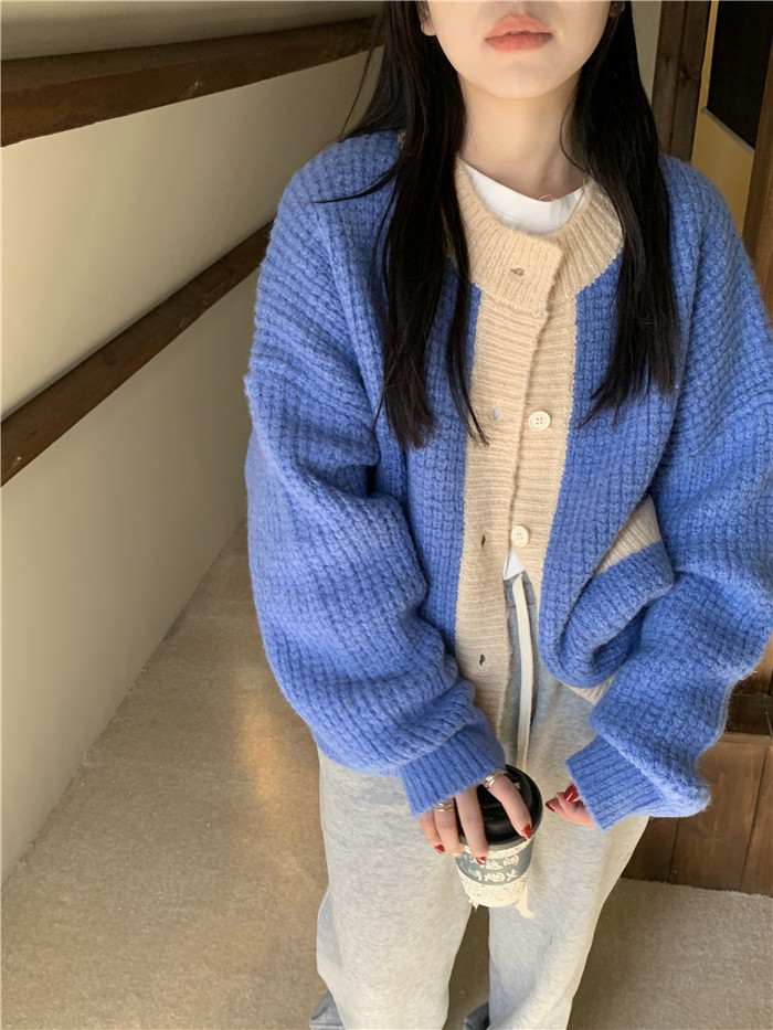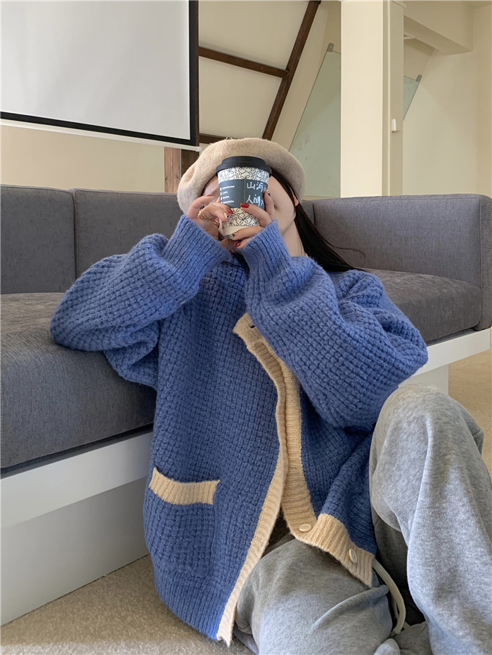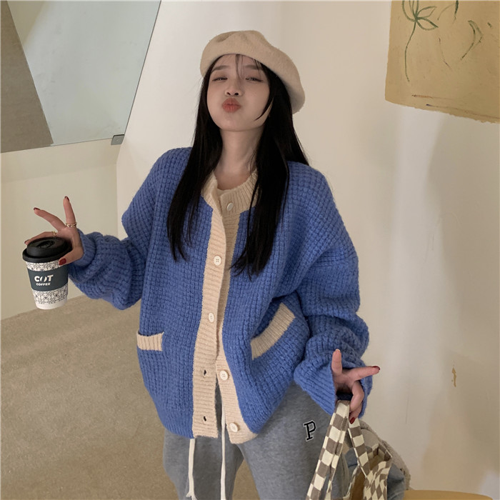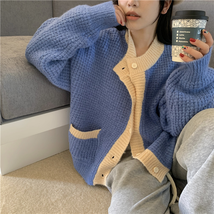 韓系別致撞色圓領毛衣外套女秋季2023新款氣質小眾口袋寬鬆上衣潮