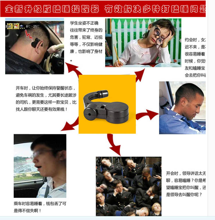 产品特性:内置高灵敏传感器,想打瞌睡时,只要头一低就会自动发出警报声,由于声音是在您的耳边响起的,所以对别人的影响不大,声音随着您的头部角度的不同发出短促和长时间的警报声。