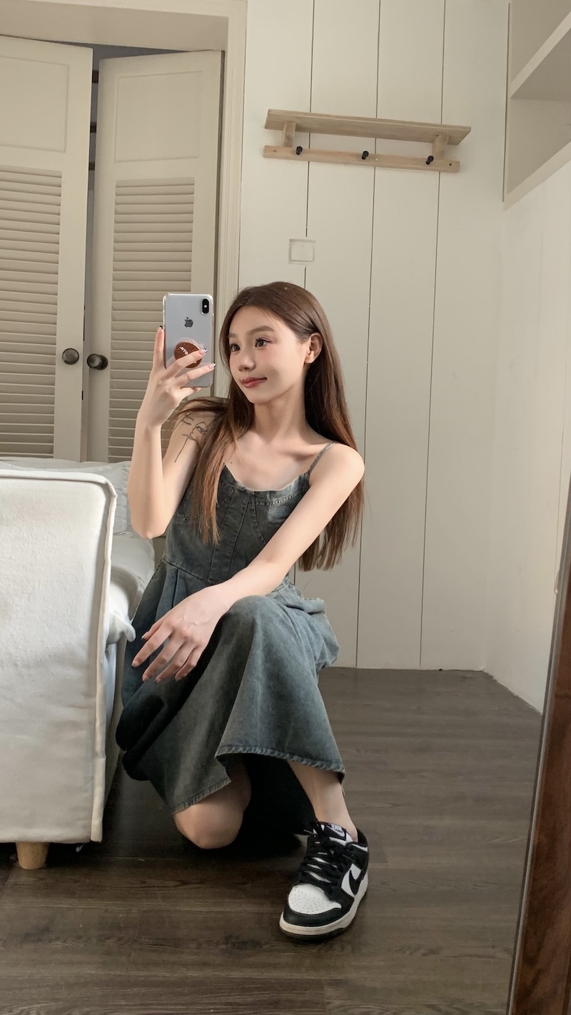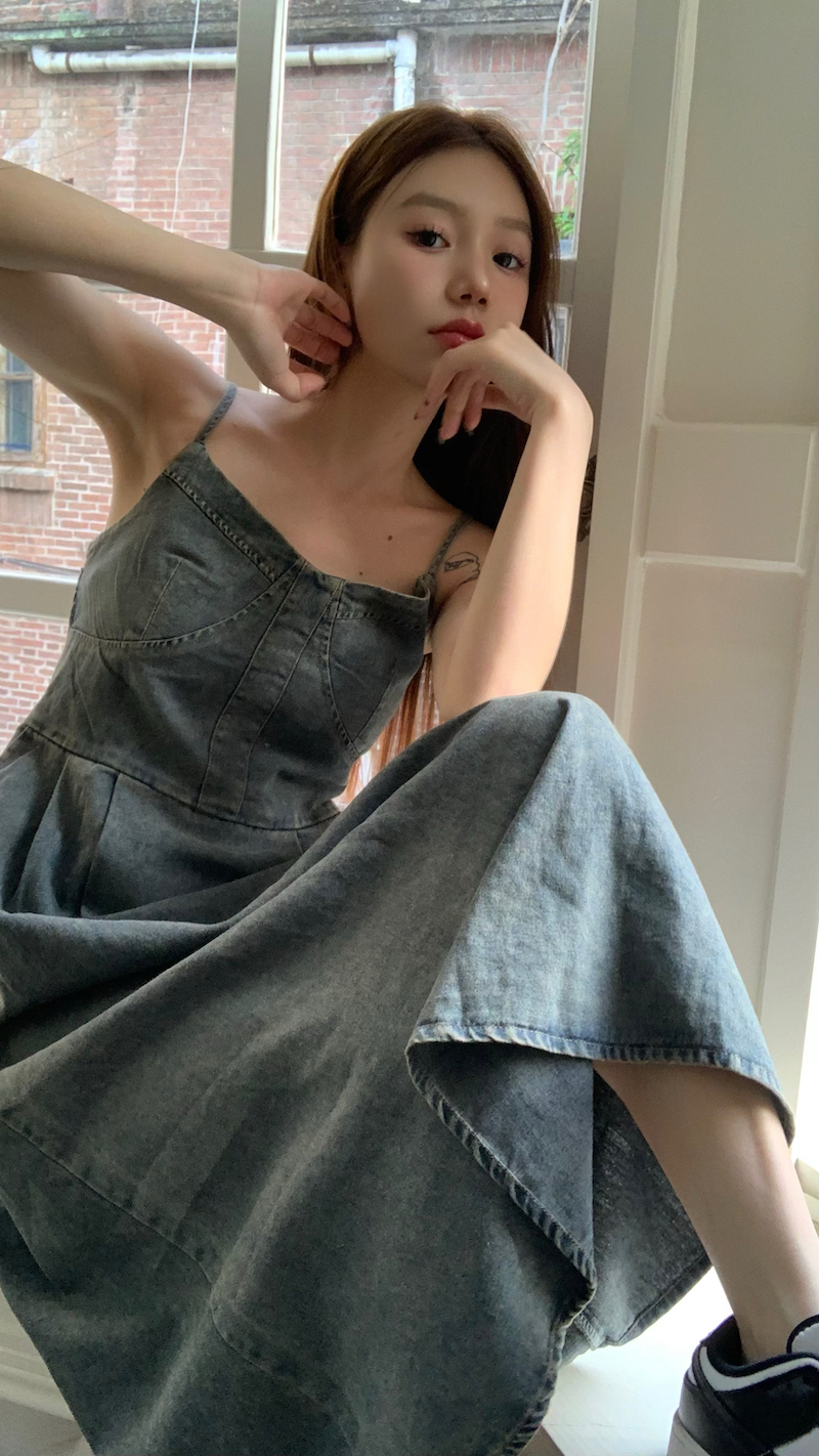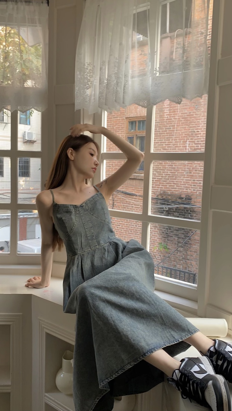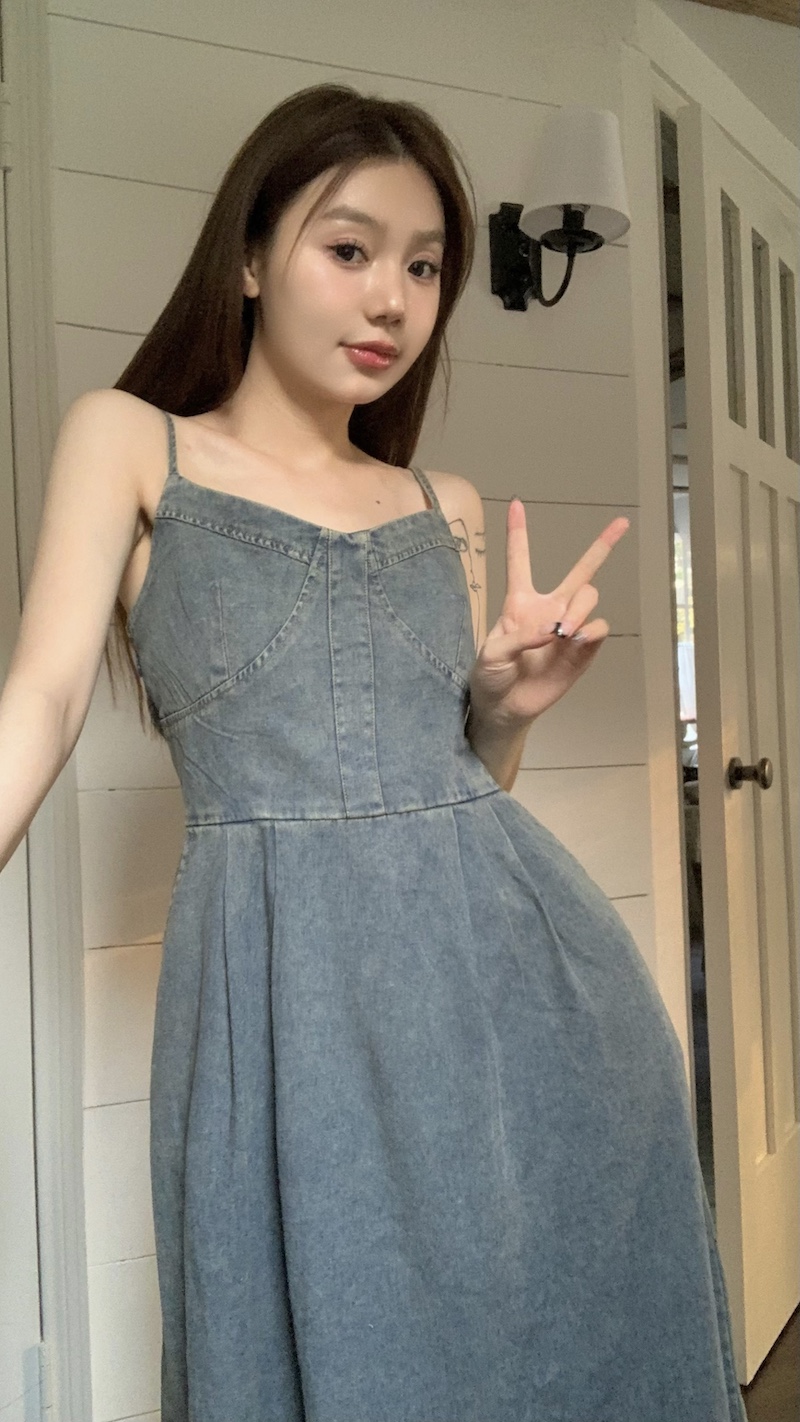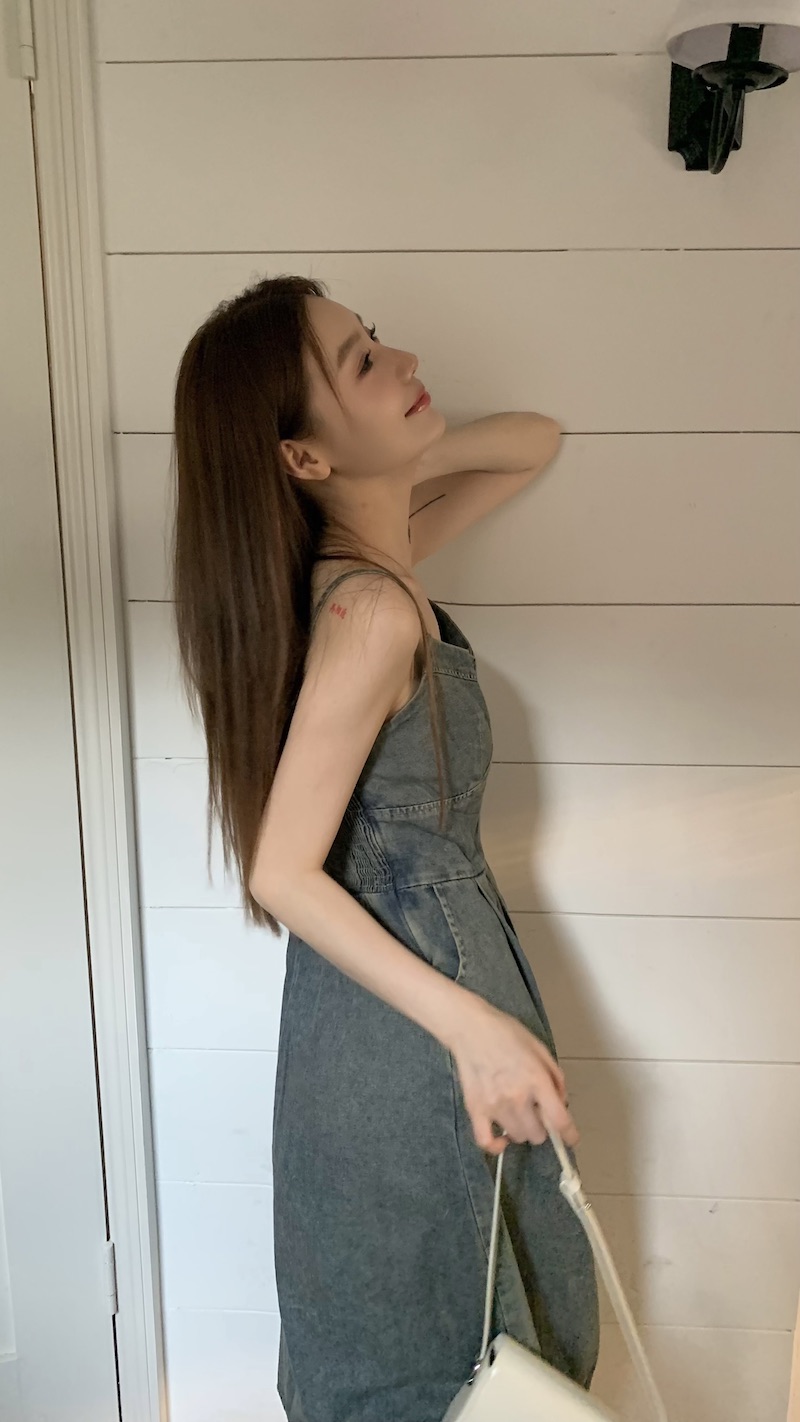 PPHOME霧島紀事~韓系修身顯瘦中長版收腰牛仔洋裝女百搭吊帶裙