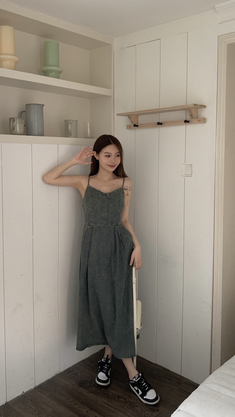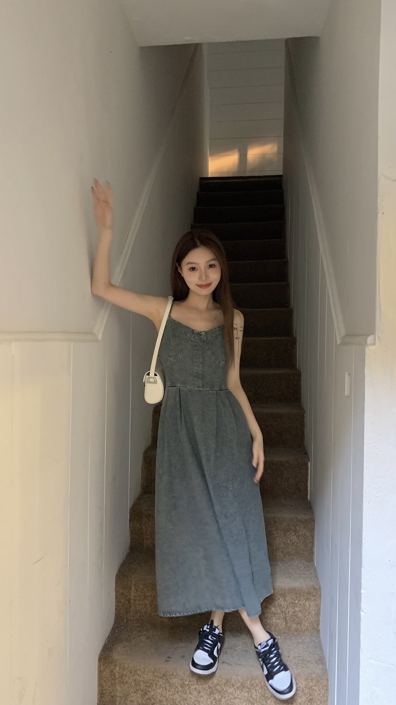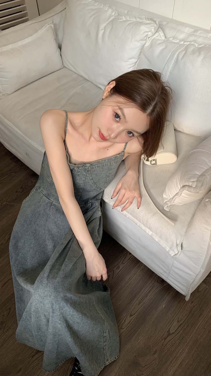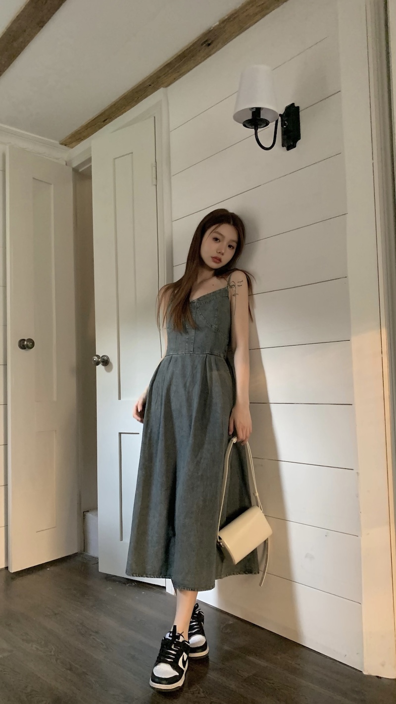 PPHOME霧島紀事~韓系修身顯瘦中長版收腰牛仔洋裝女百搭吊帶裙