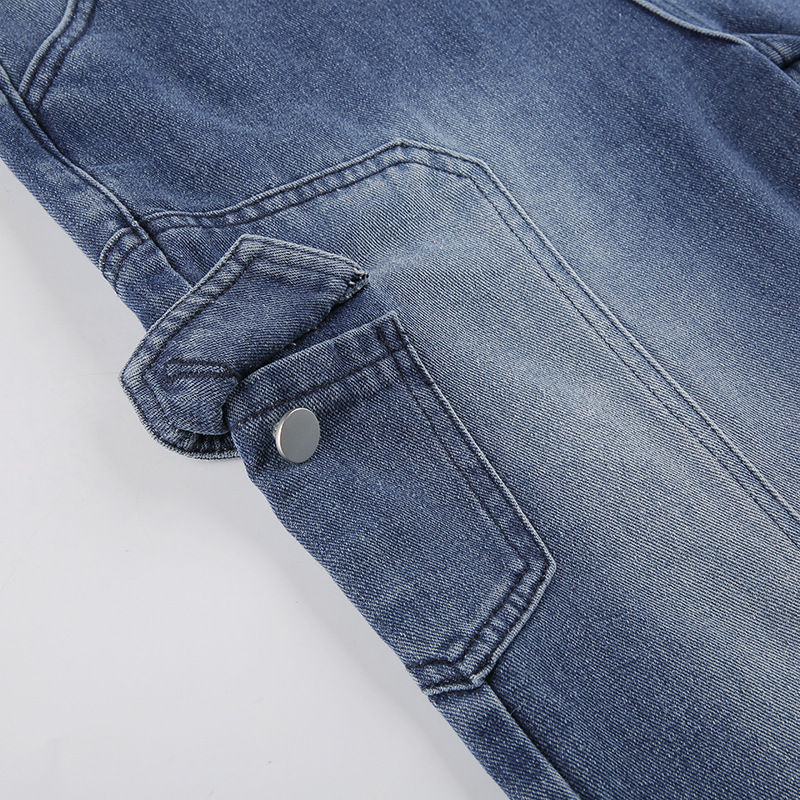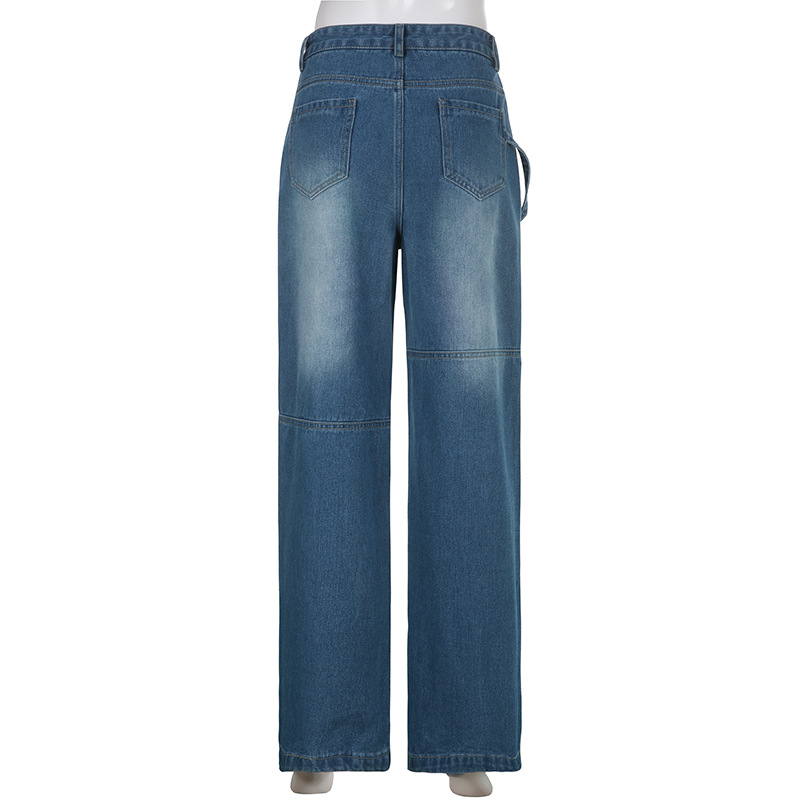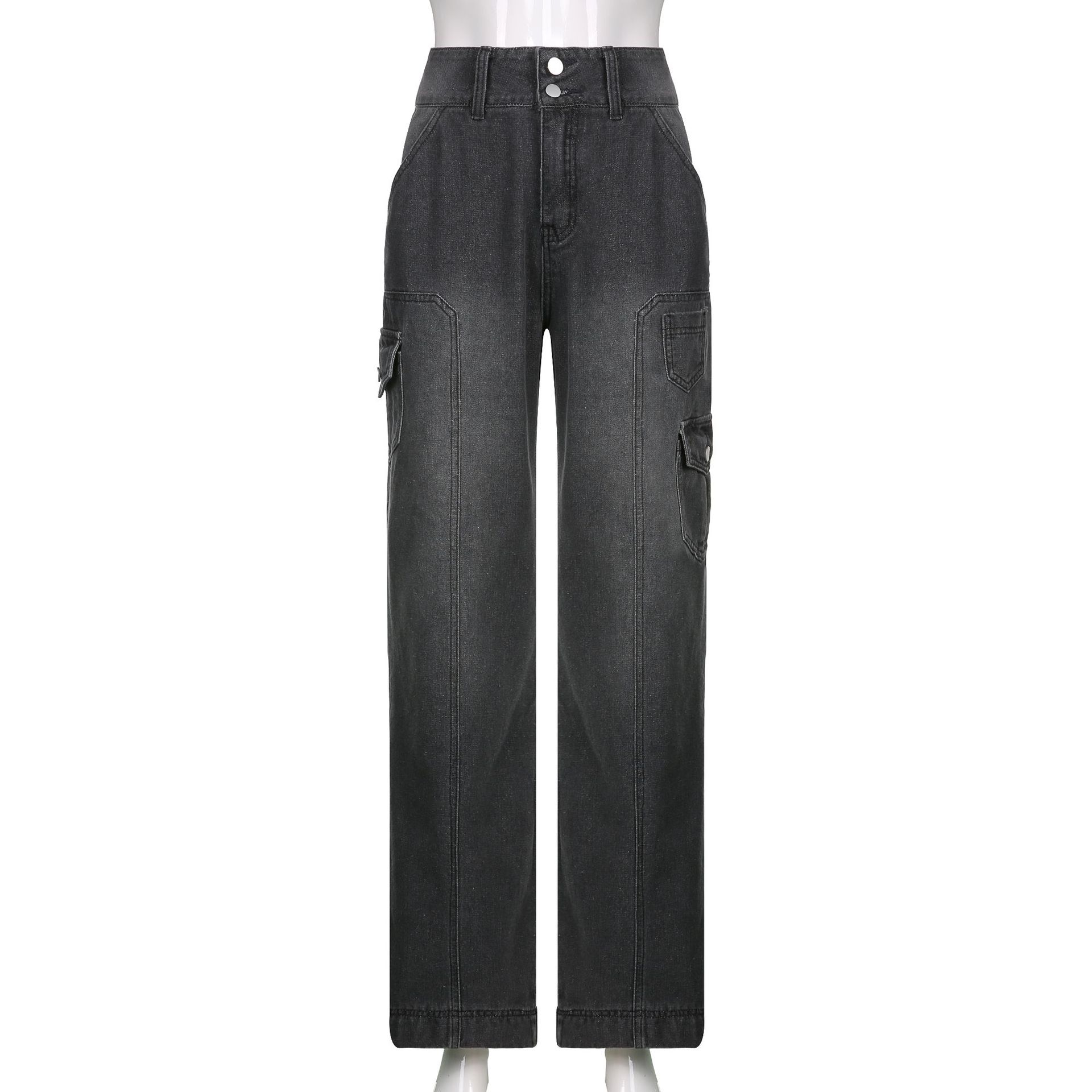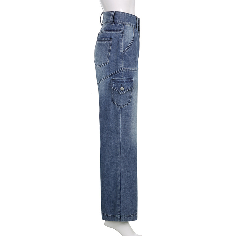 2021外贸新款街头高腰直筒休闲牛仔裤不规则口袋工装拖地裤老爹裤