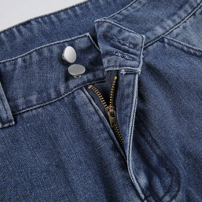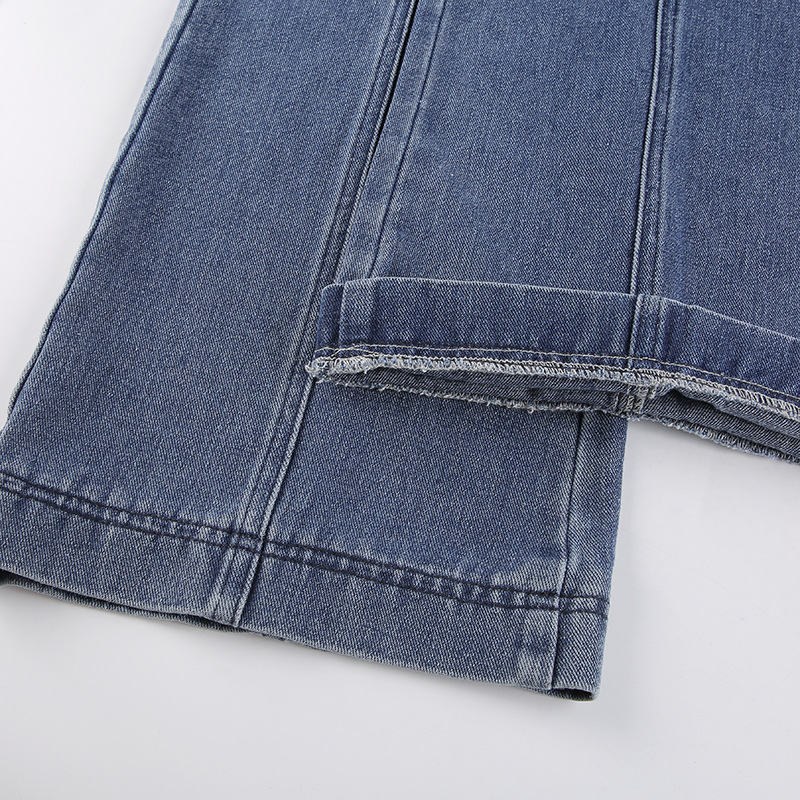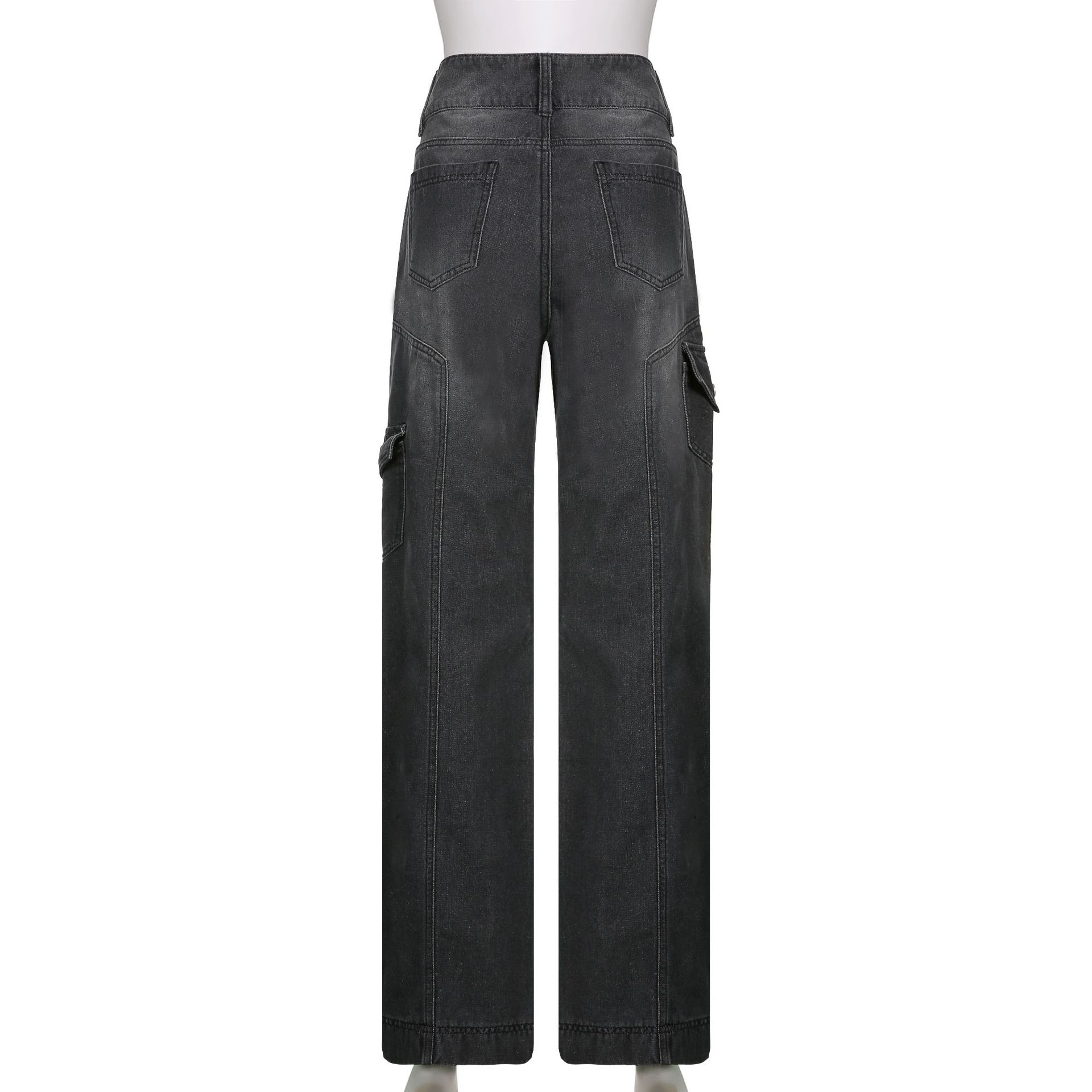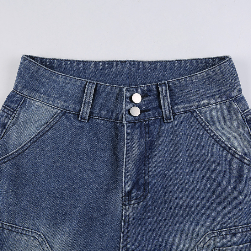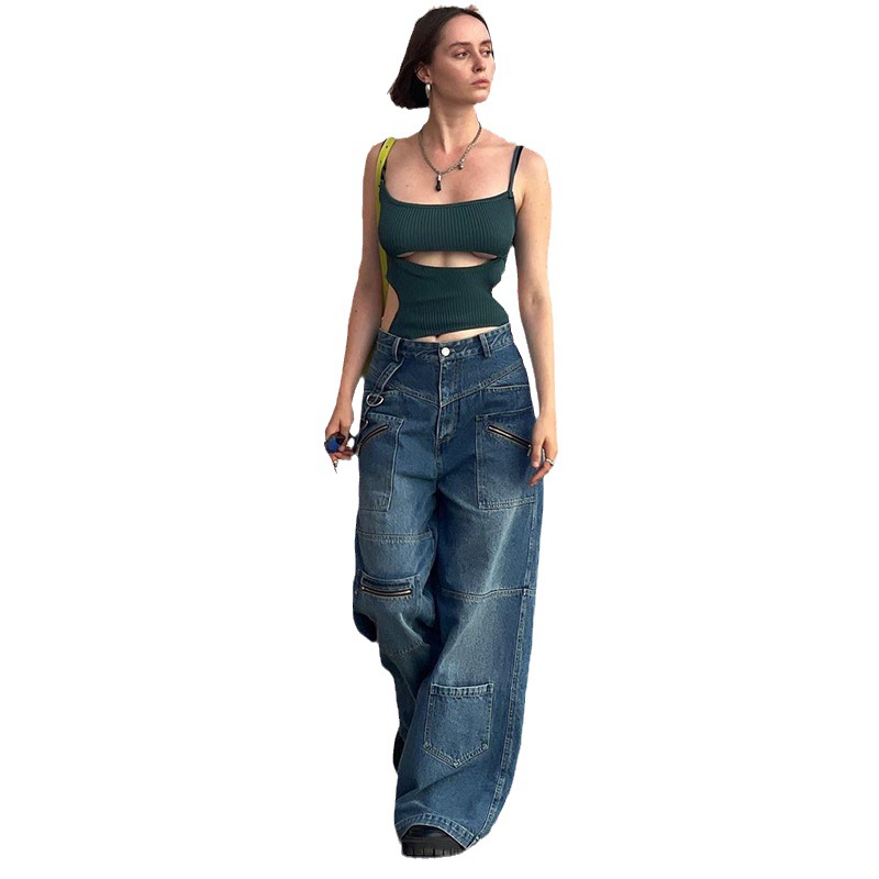 2021外贸新款街头高腰直筒休闲牛仔裤不规则口袋工装拖地裤老爹裤