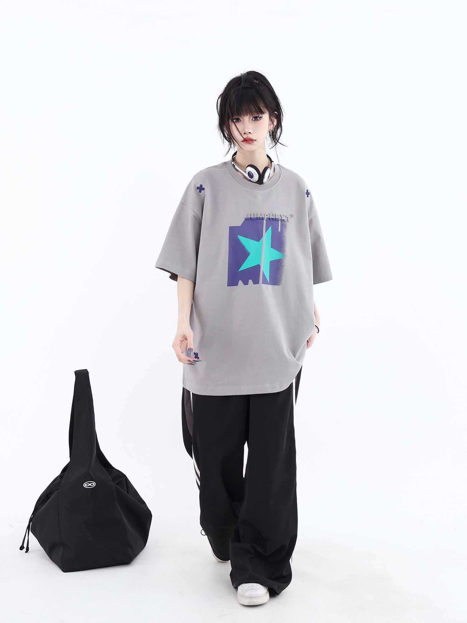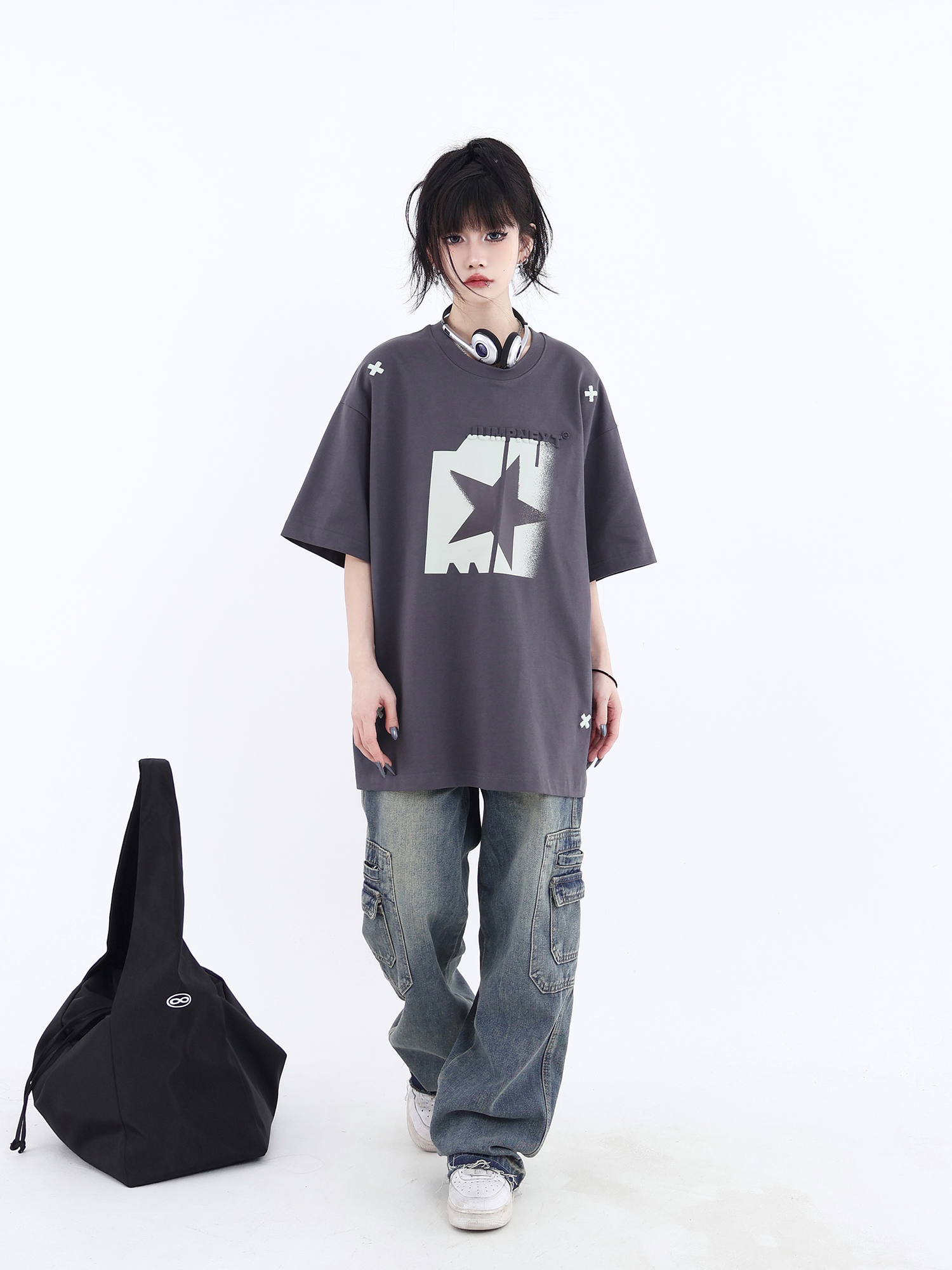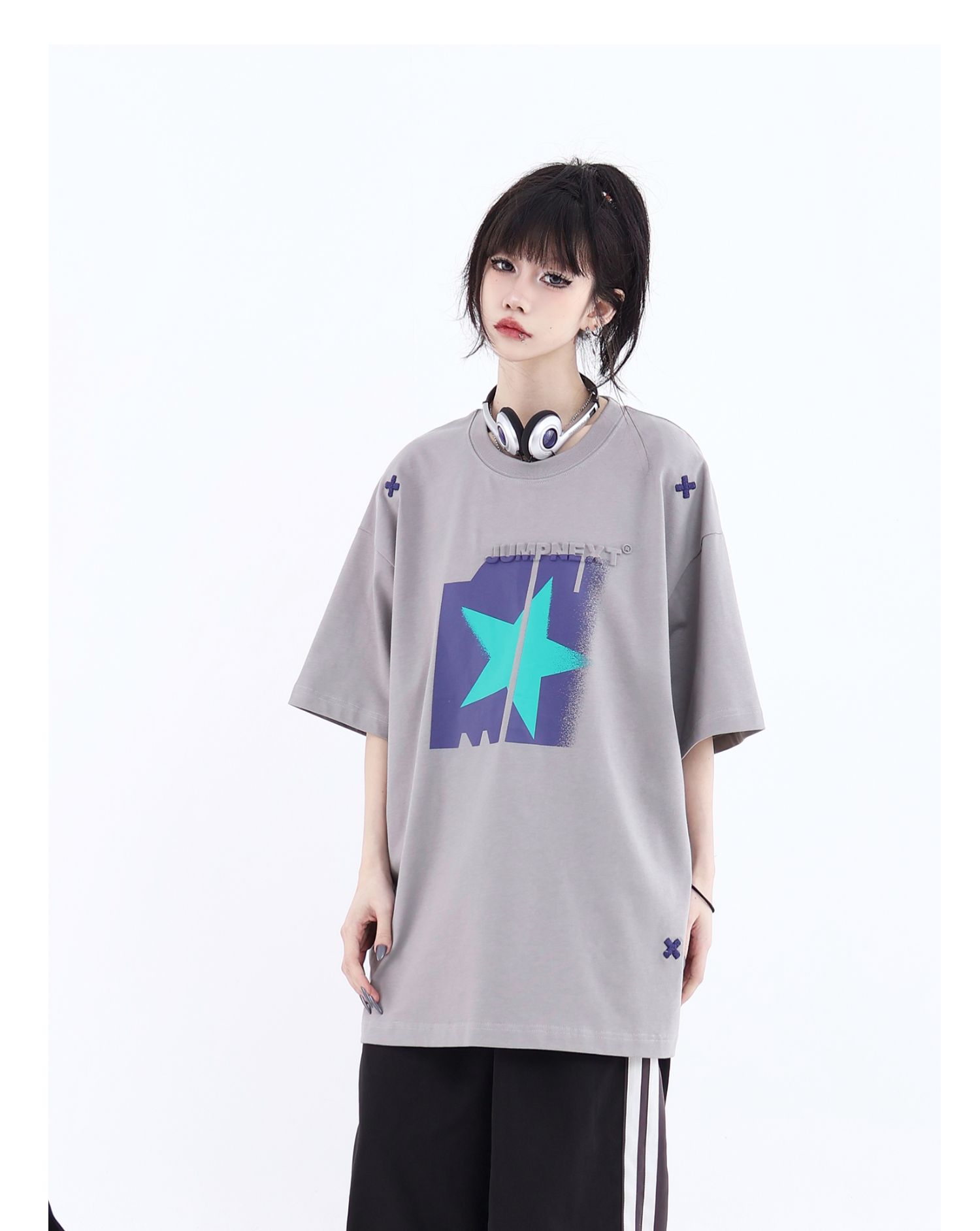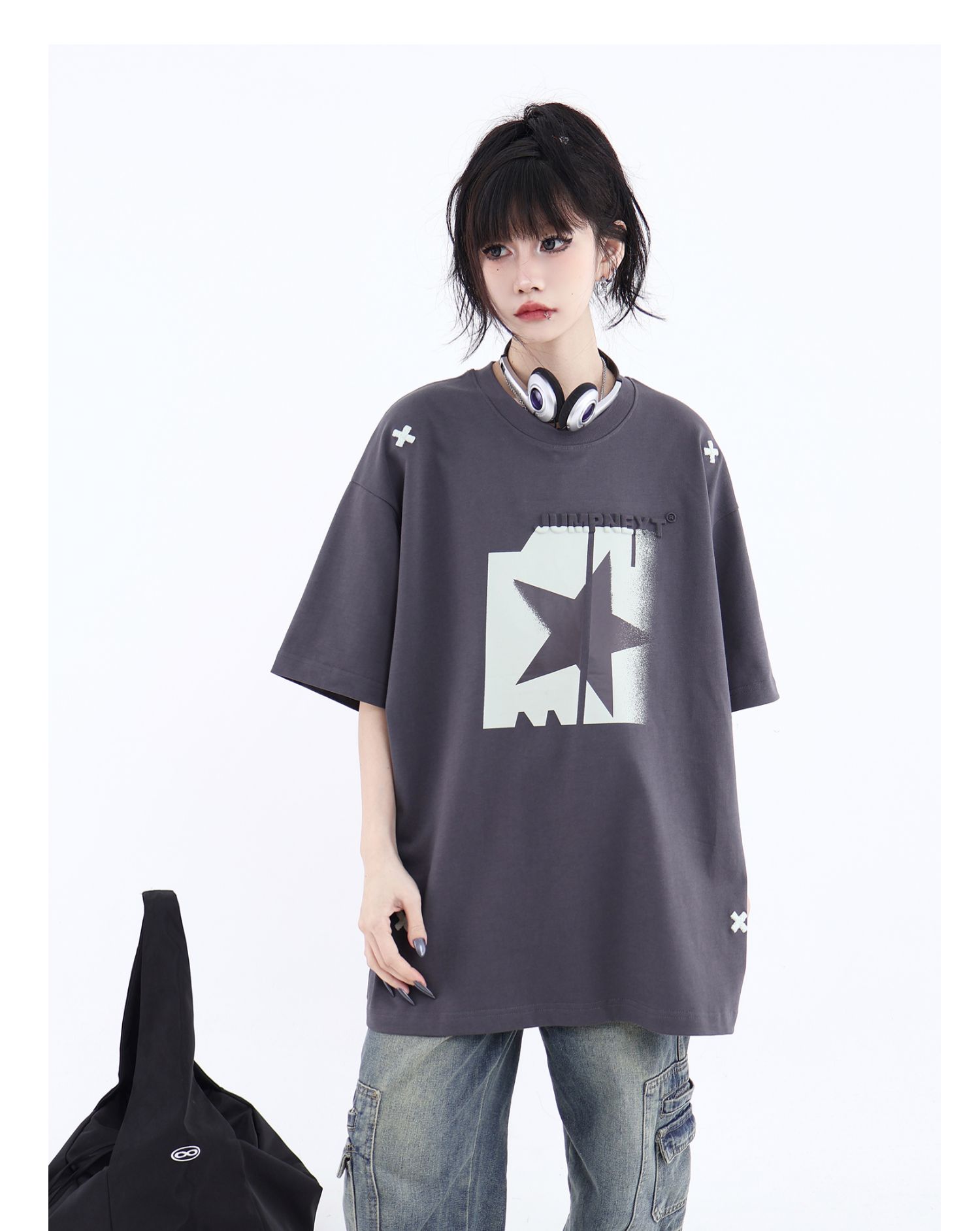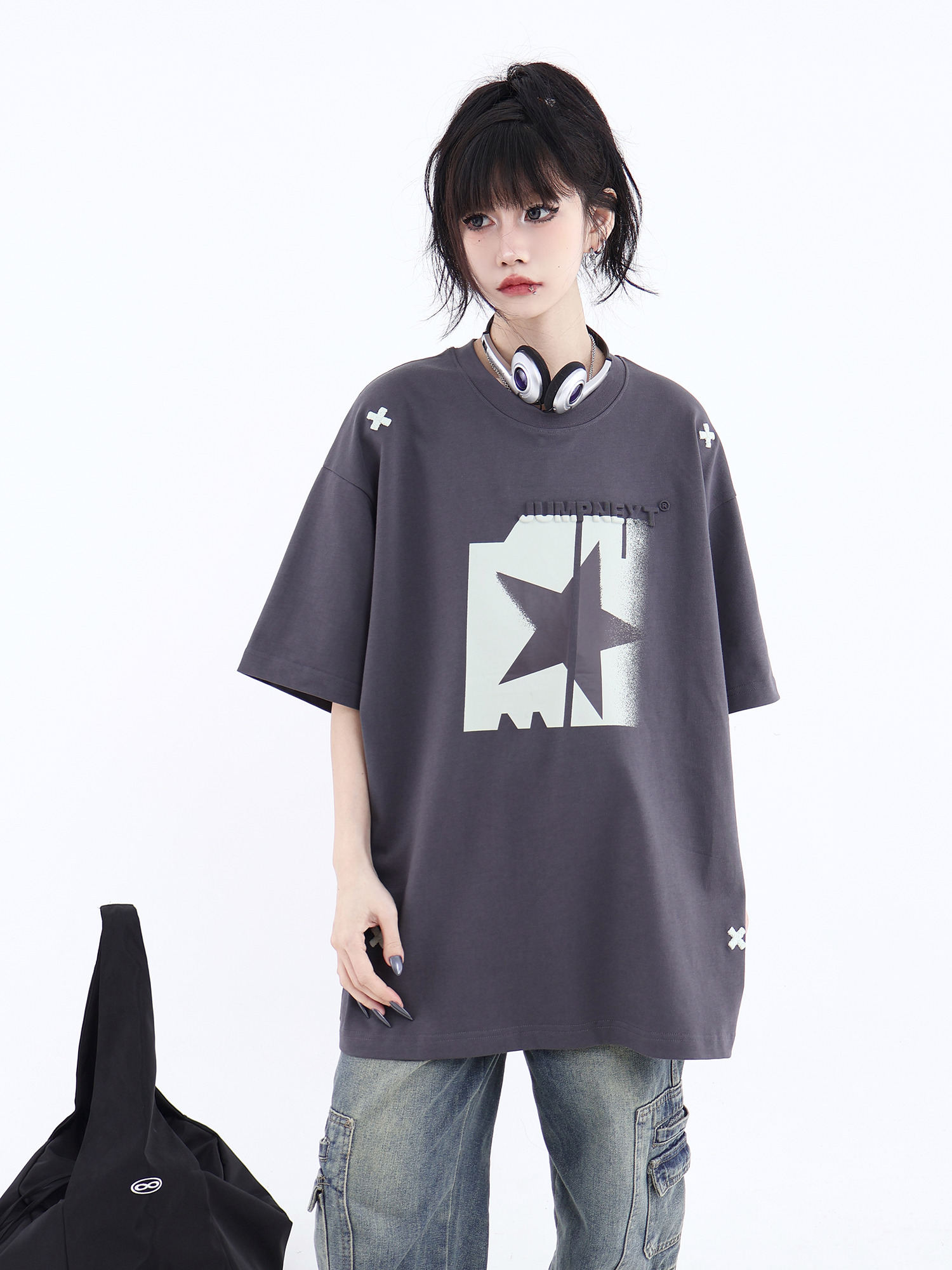 JUMPNEXT 幻影圖形十字架刺繡基礎情侶國潮夏季無性別寬鬆短袖t恤