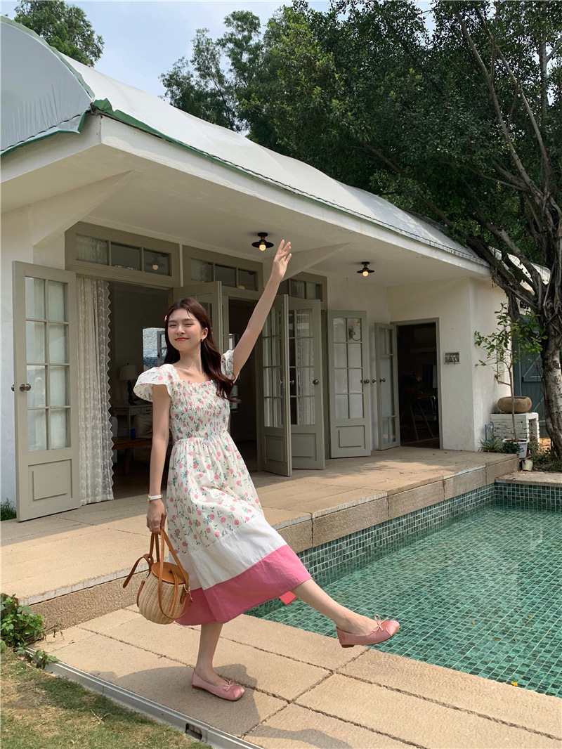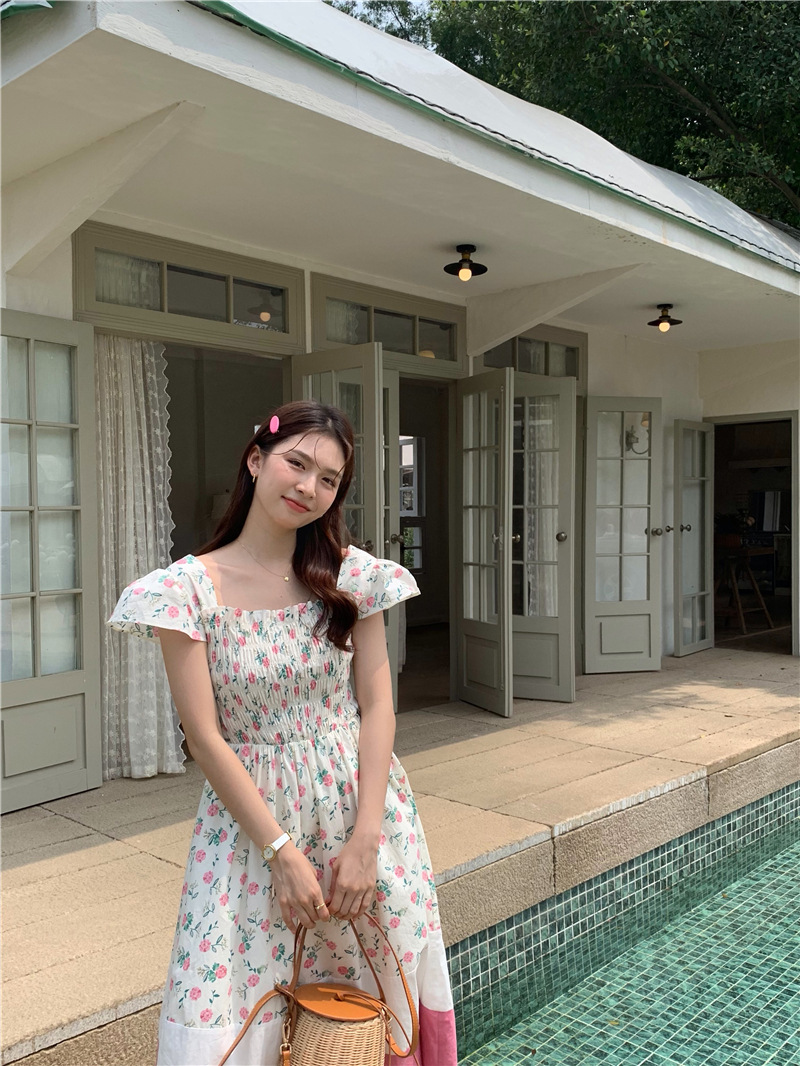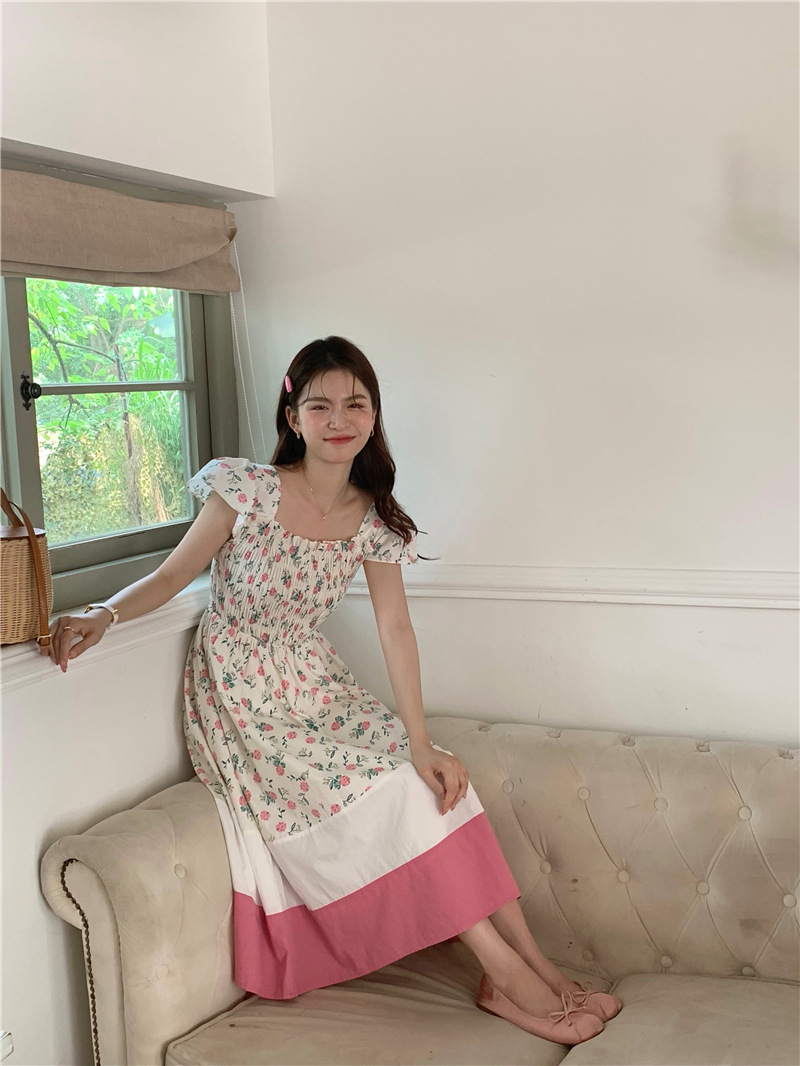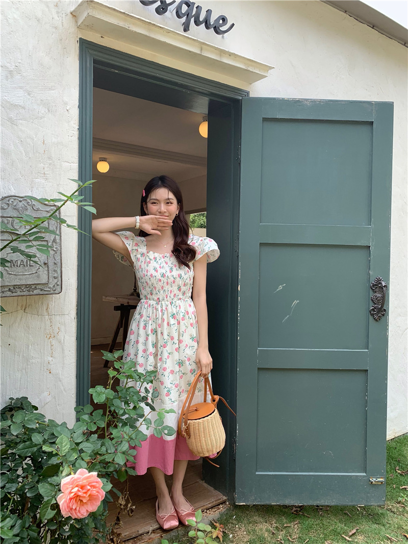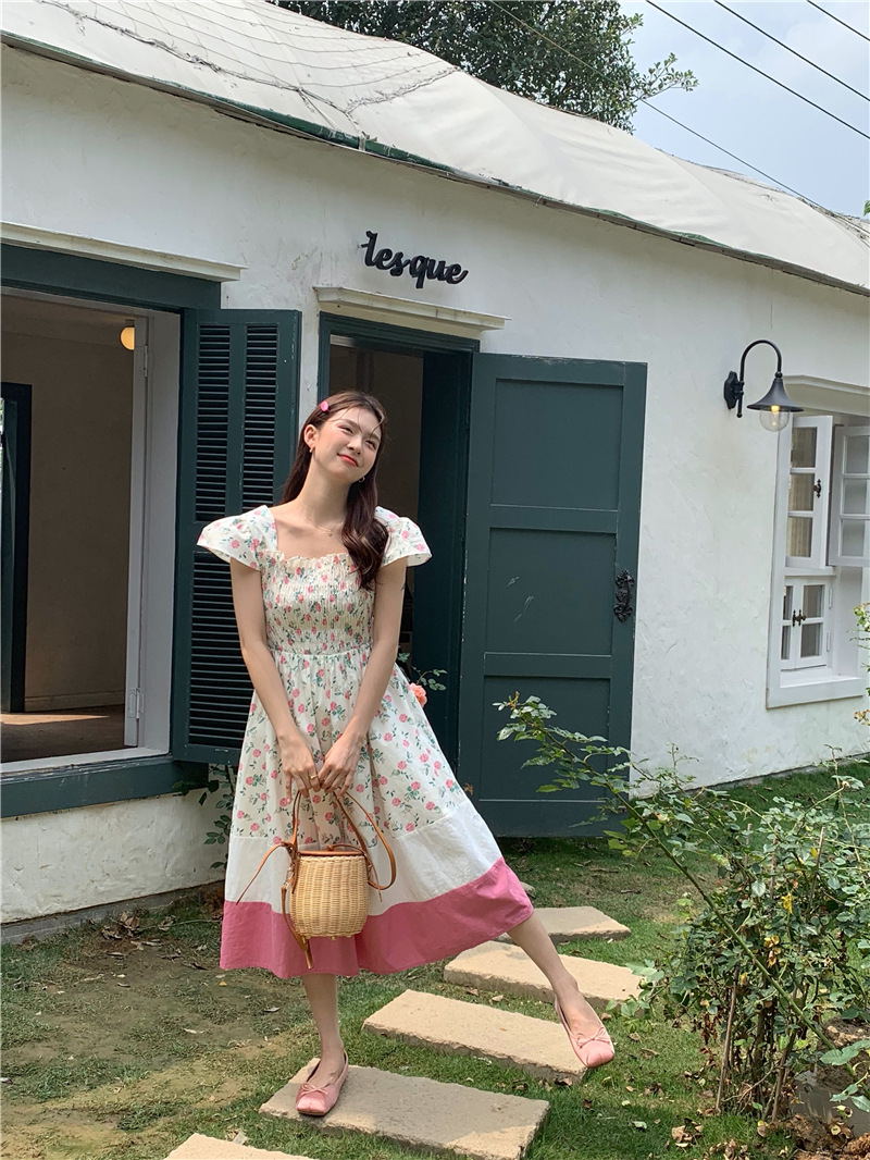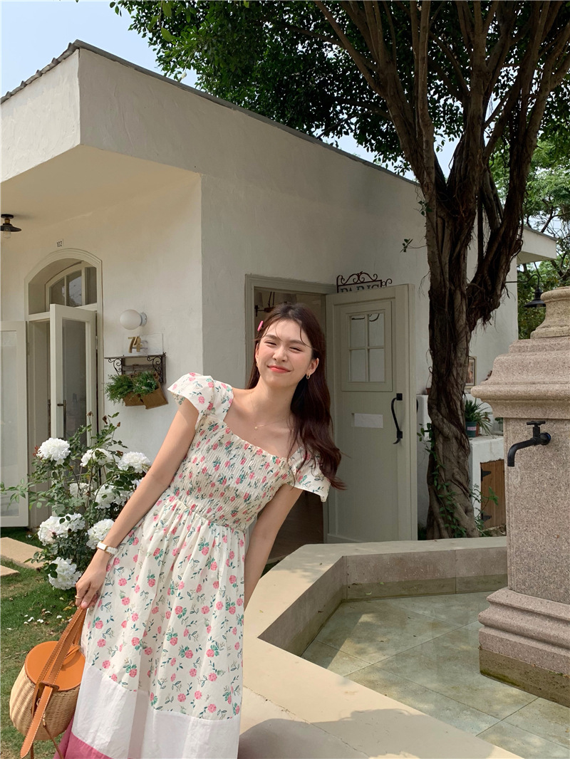 实拍 2023 韩国chic 清新撞色碎花松紧连衣裙
