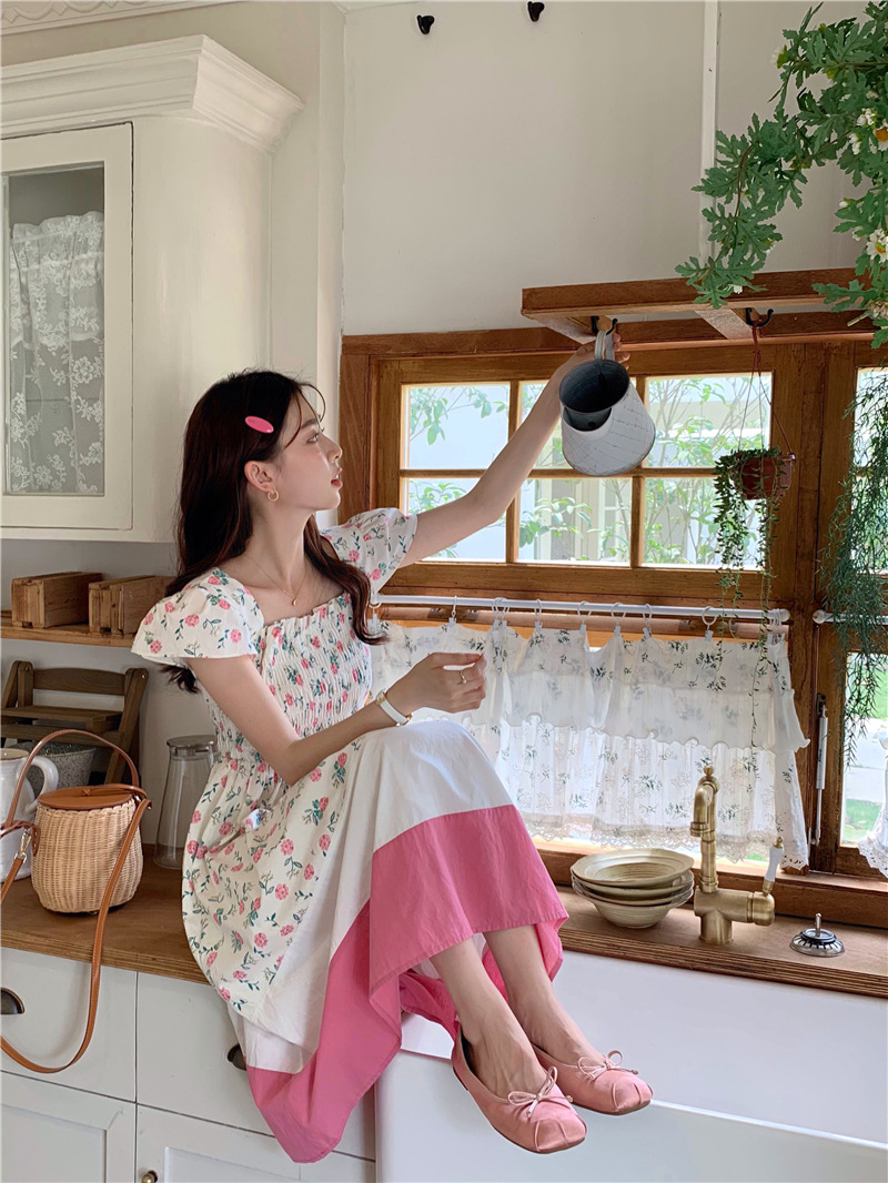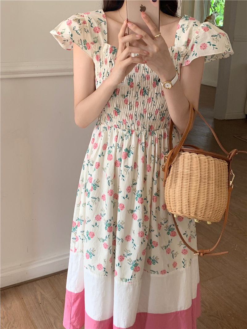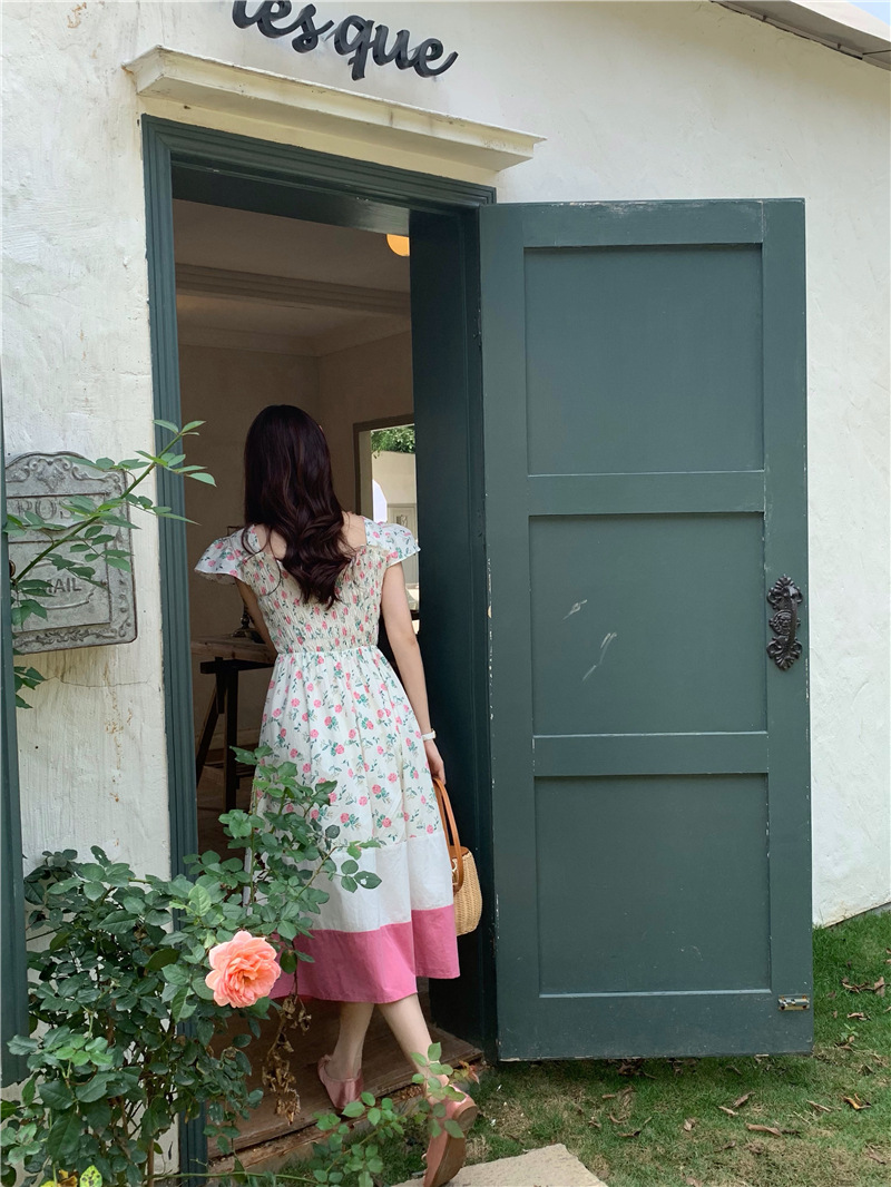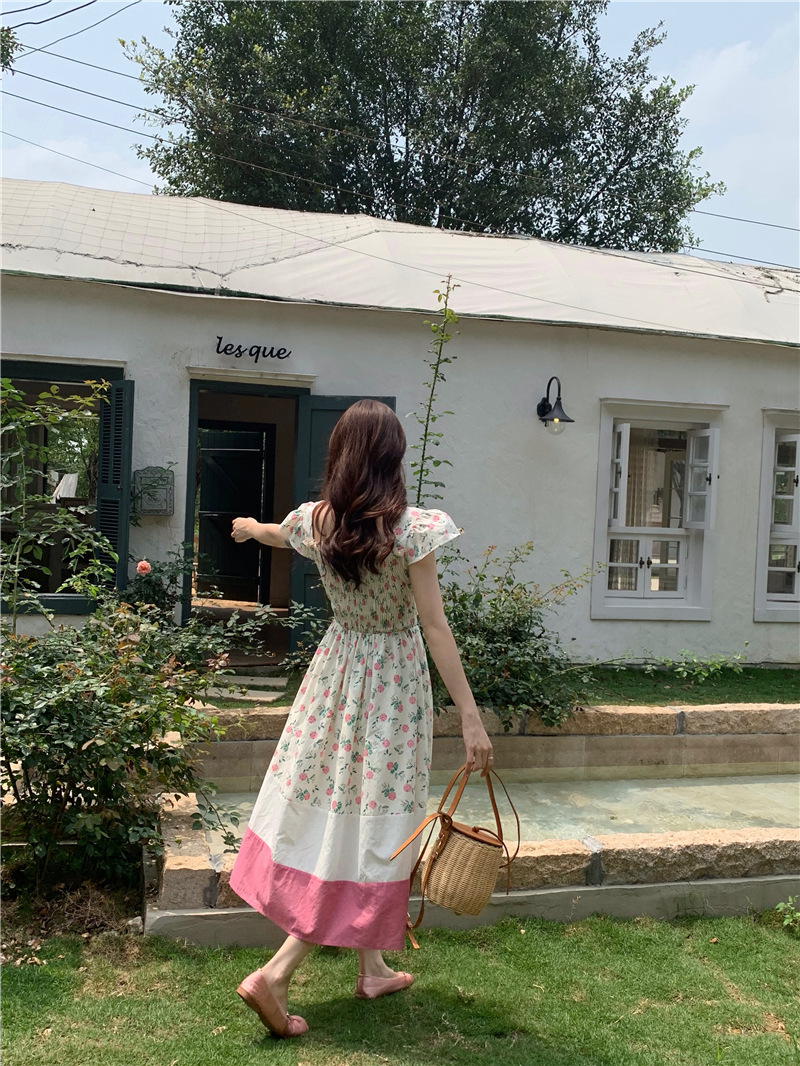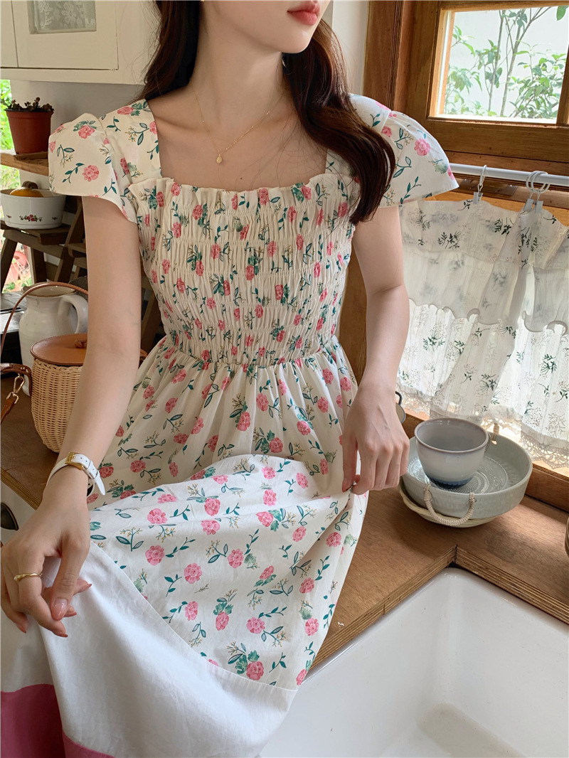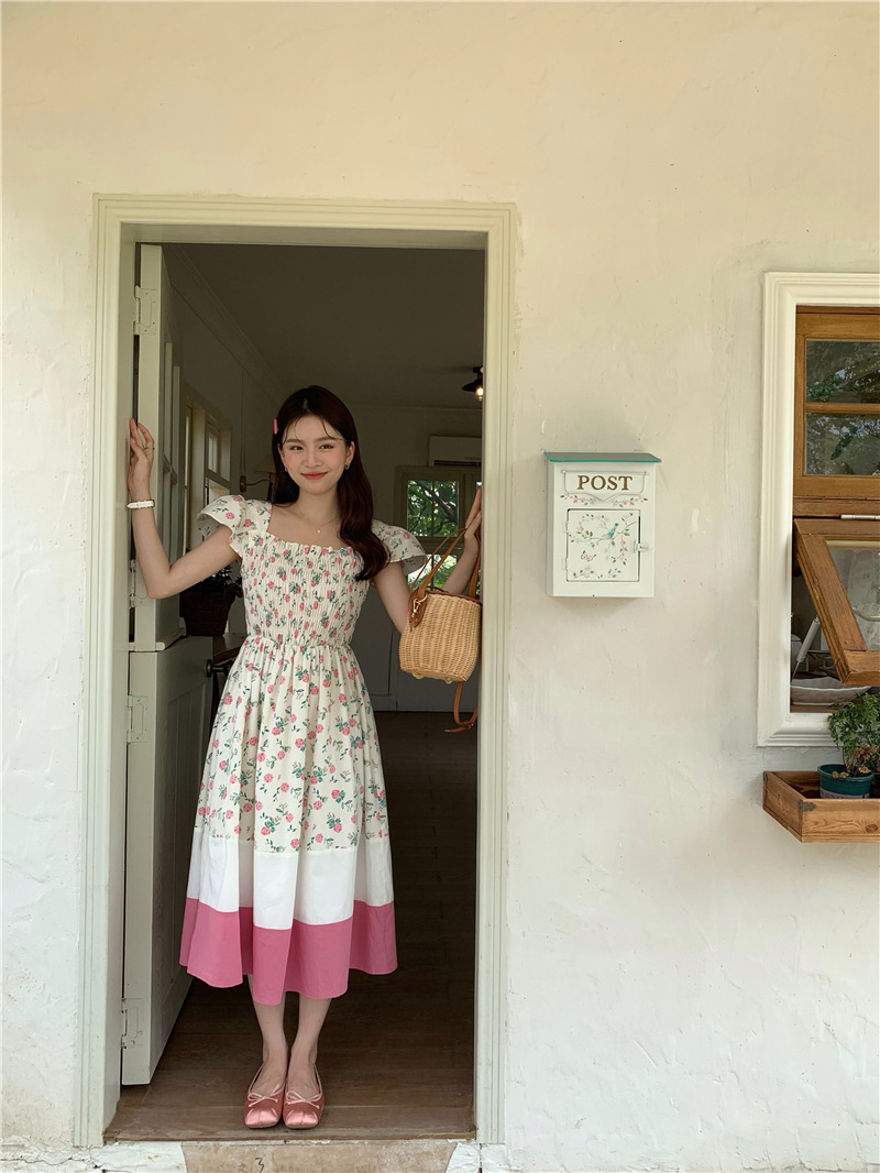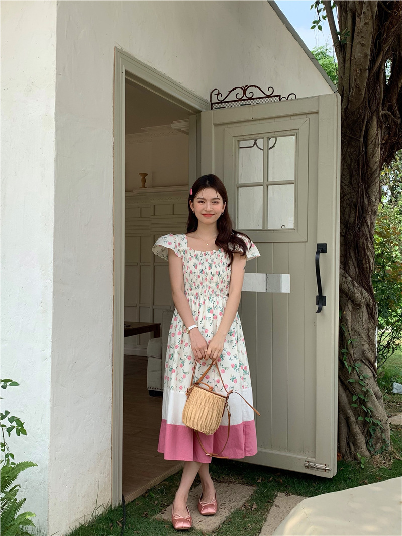 实拍 2023 韩国chic 清新撞色碎花松紧连衣裙