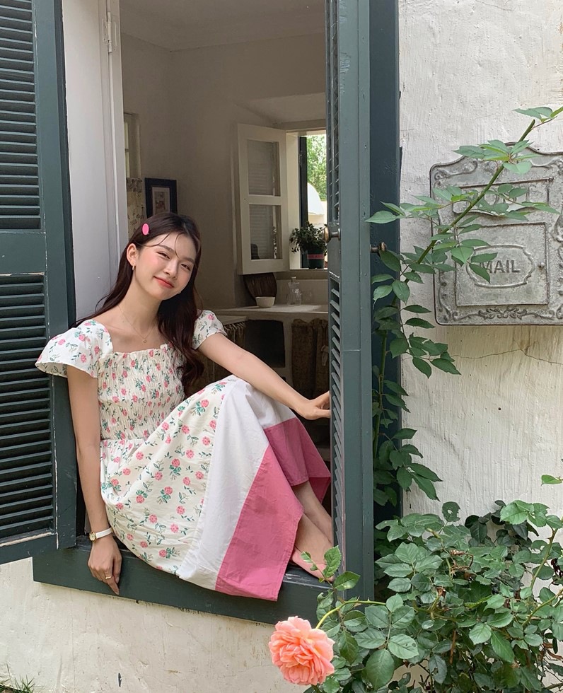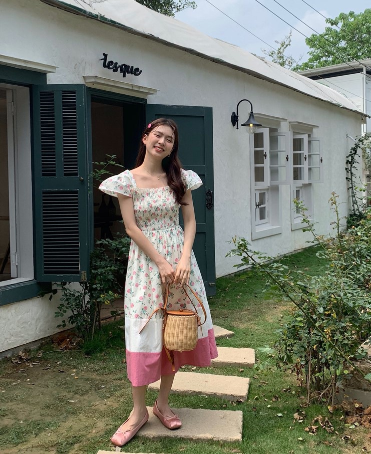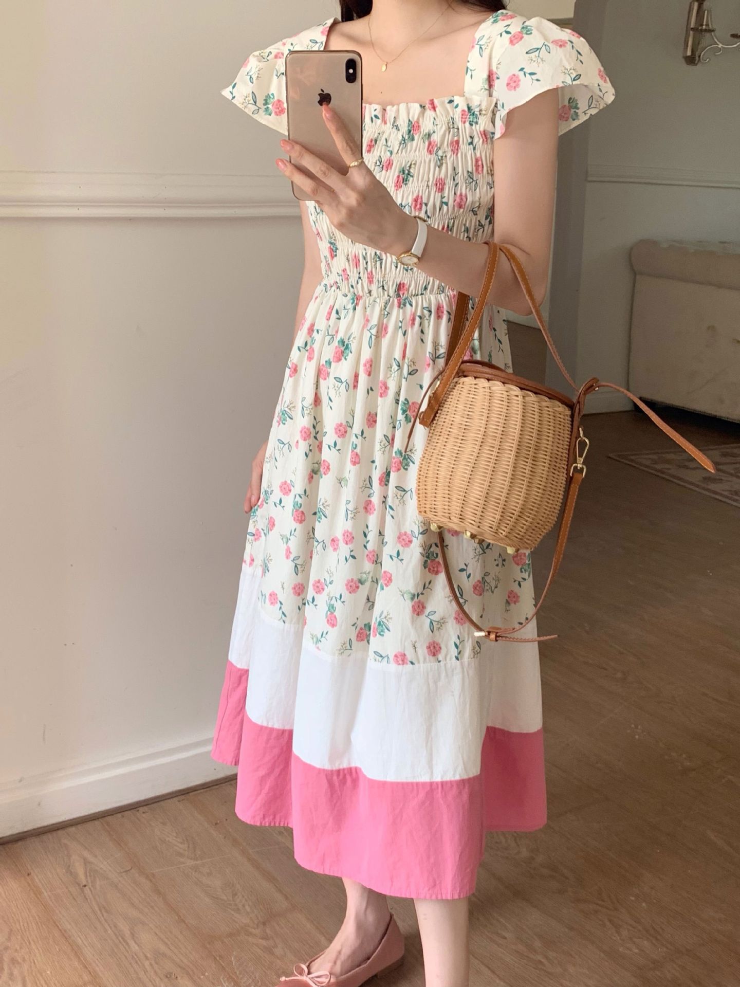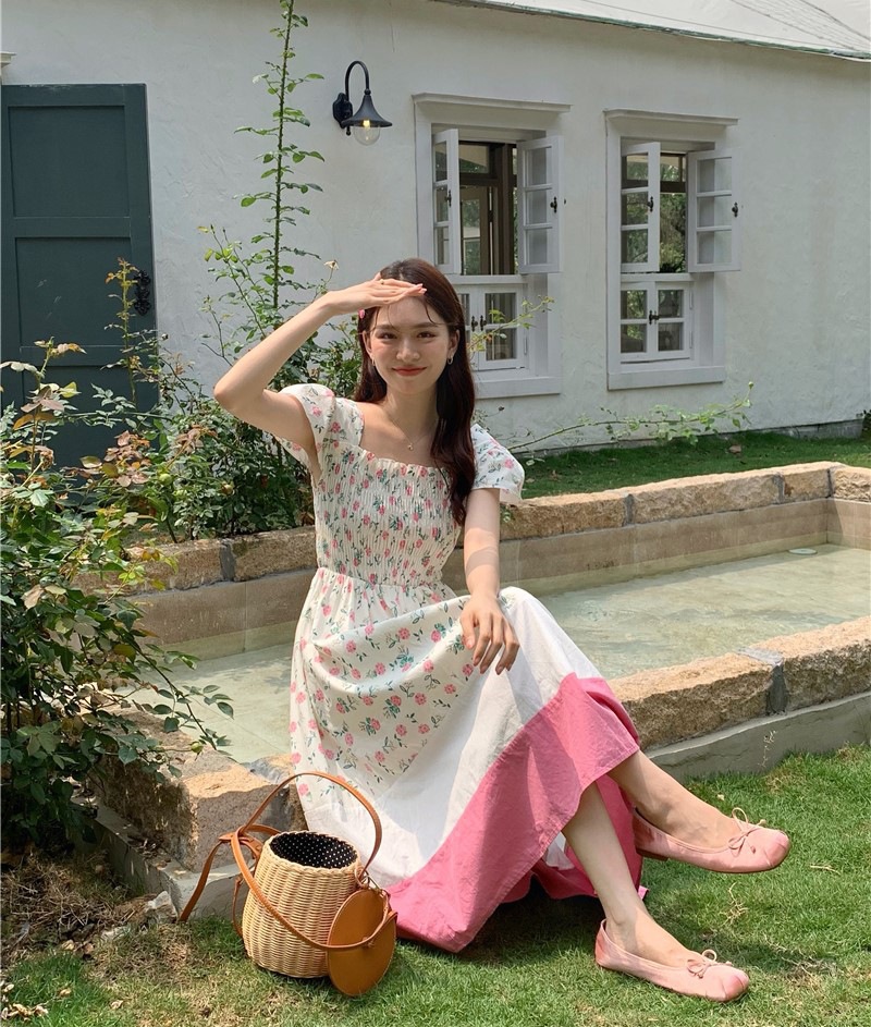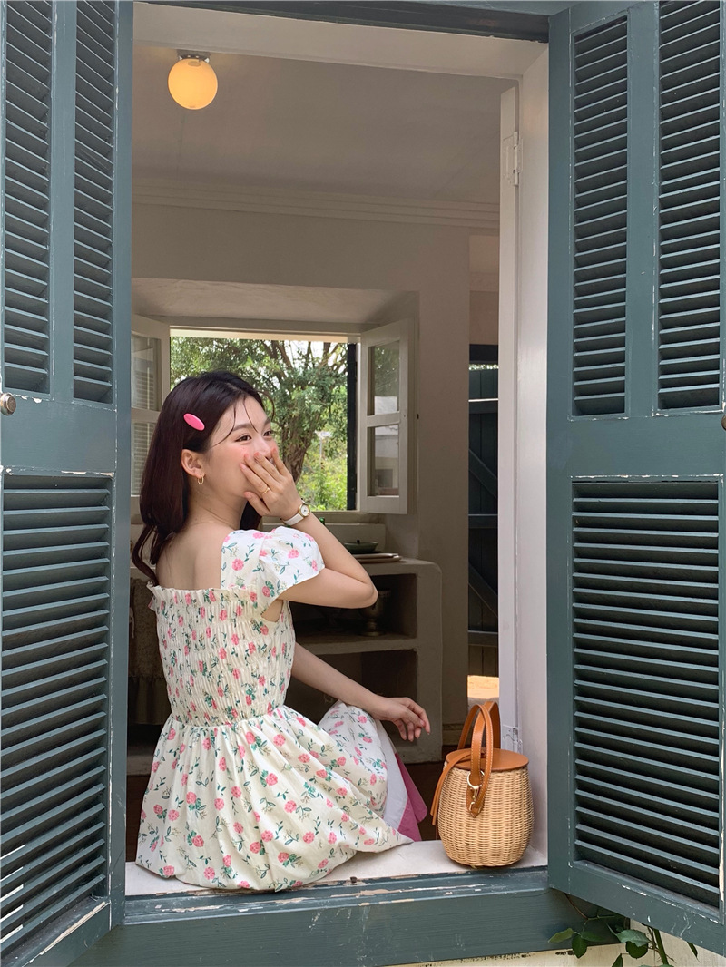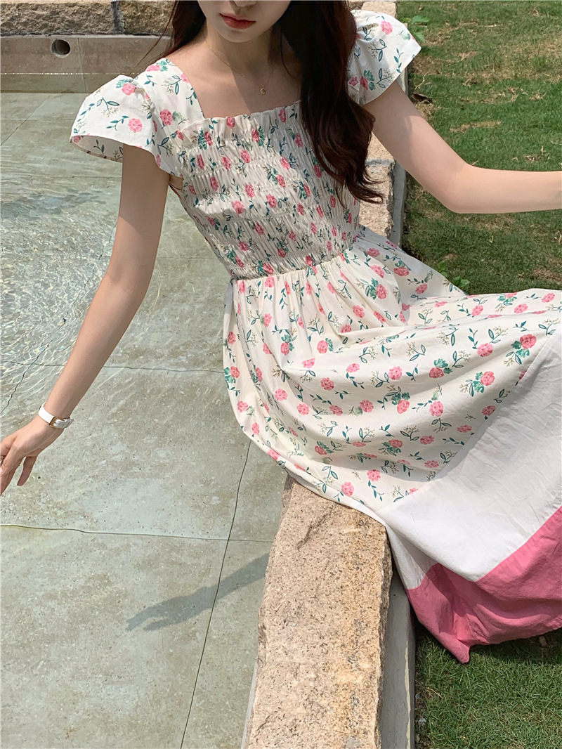 实拍 2023 韩国chic 清新撞色碎花松紧连衣裙
