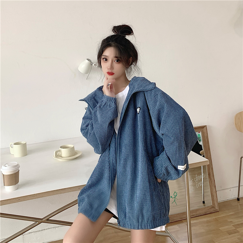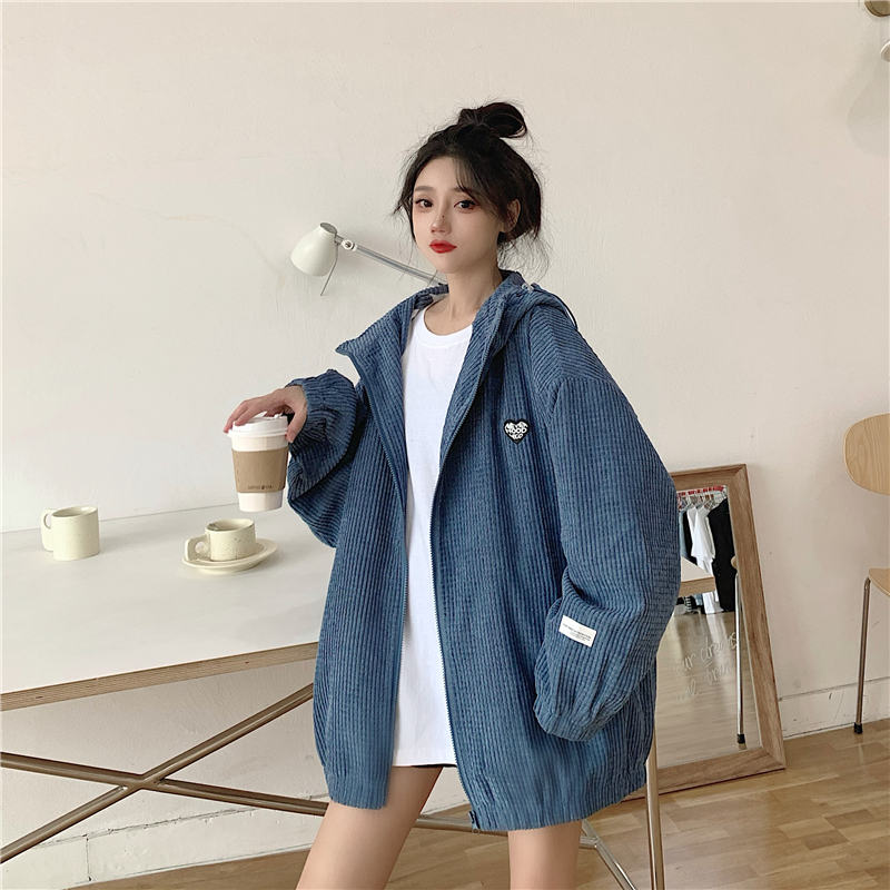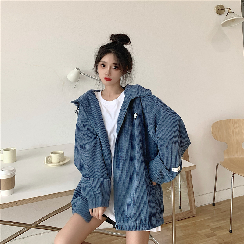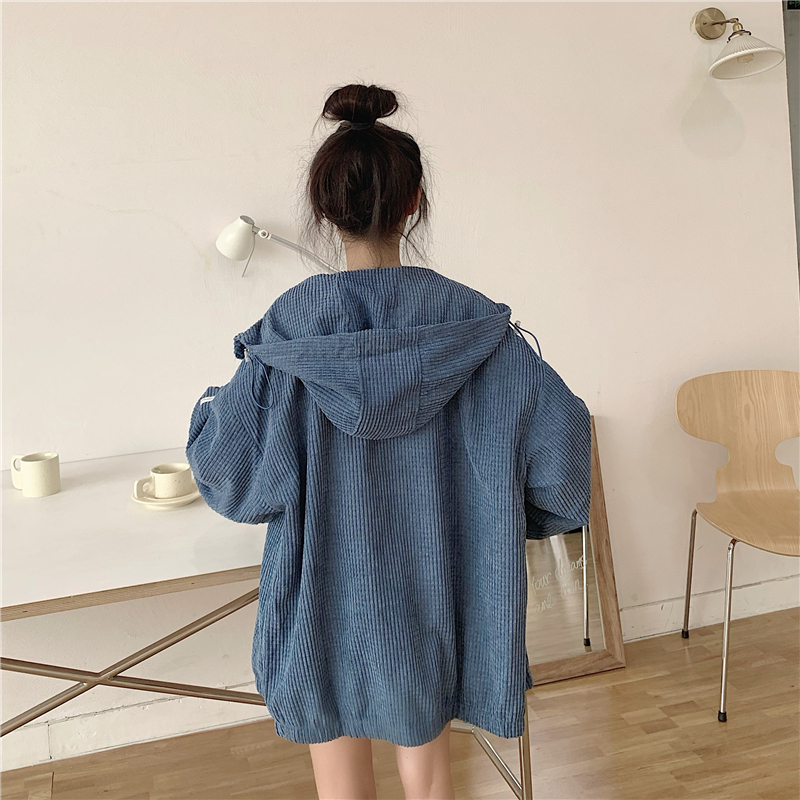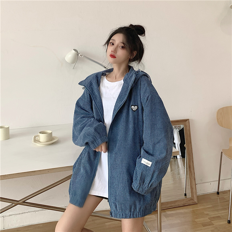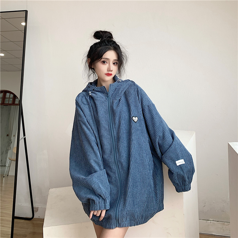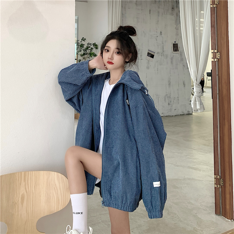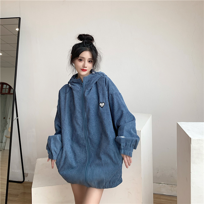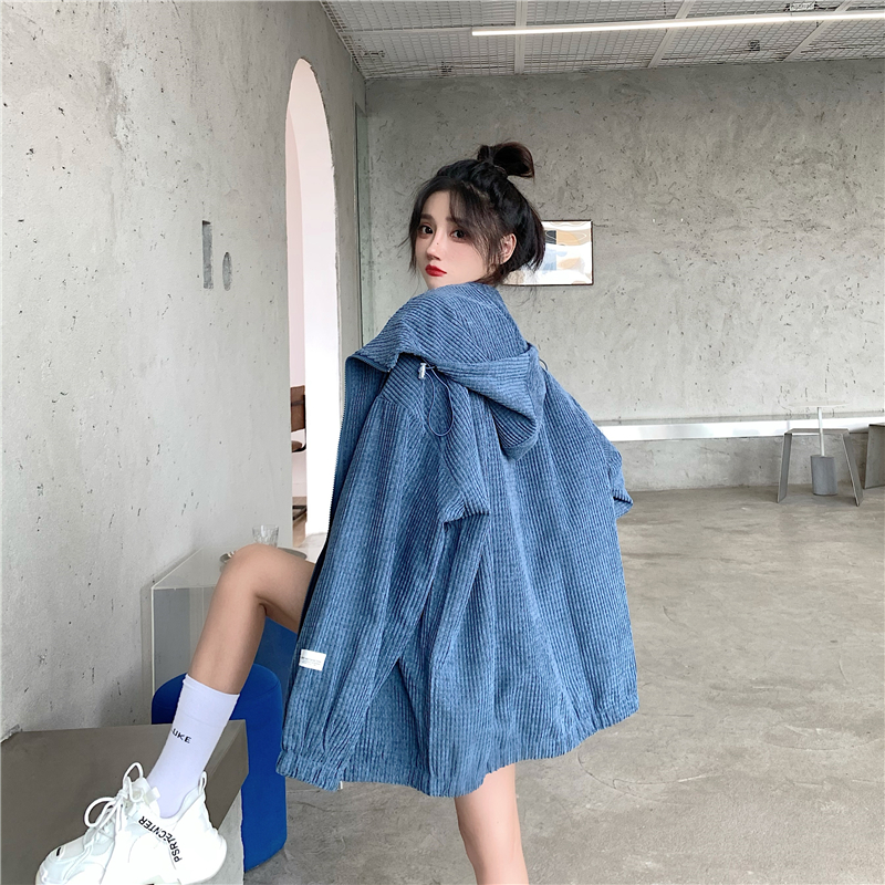 藍色華夫格連帽外套女春秋季百搭寬鬆bf風中長版休閒夾克oversize