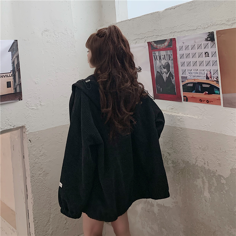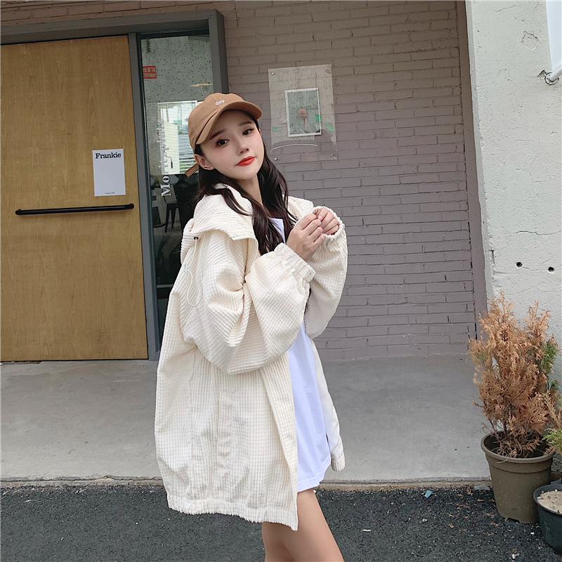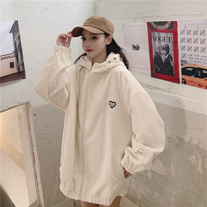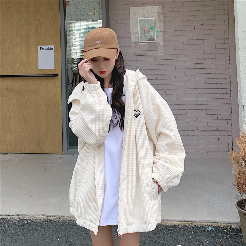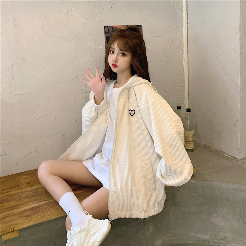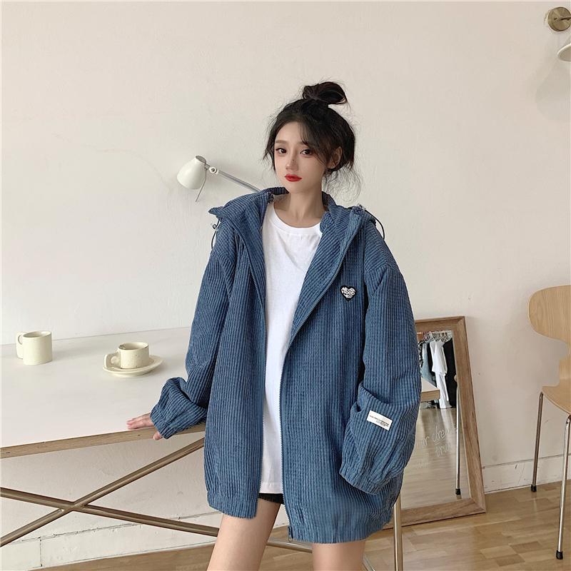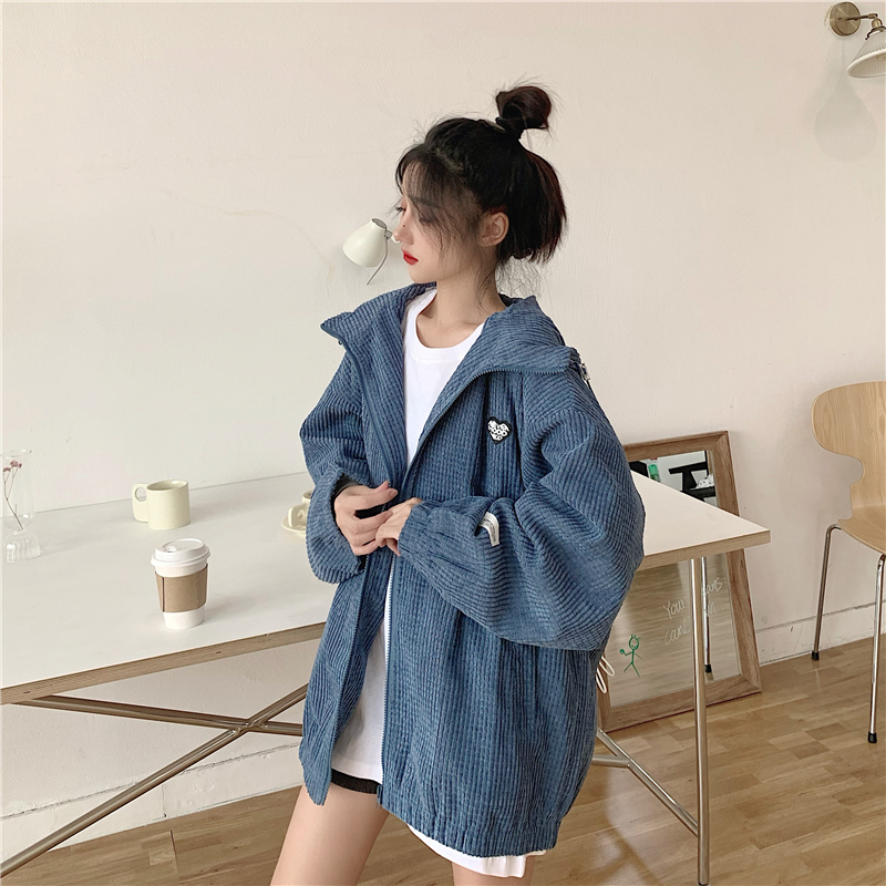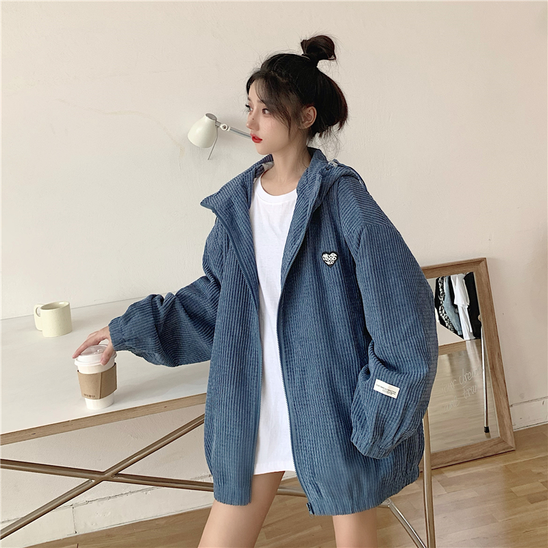 藍色華夫格連帽外套女春秋季百搭寬鬆bf風中長版休閒夾克oversize