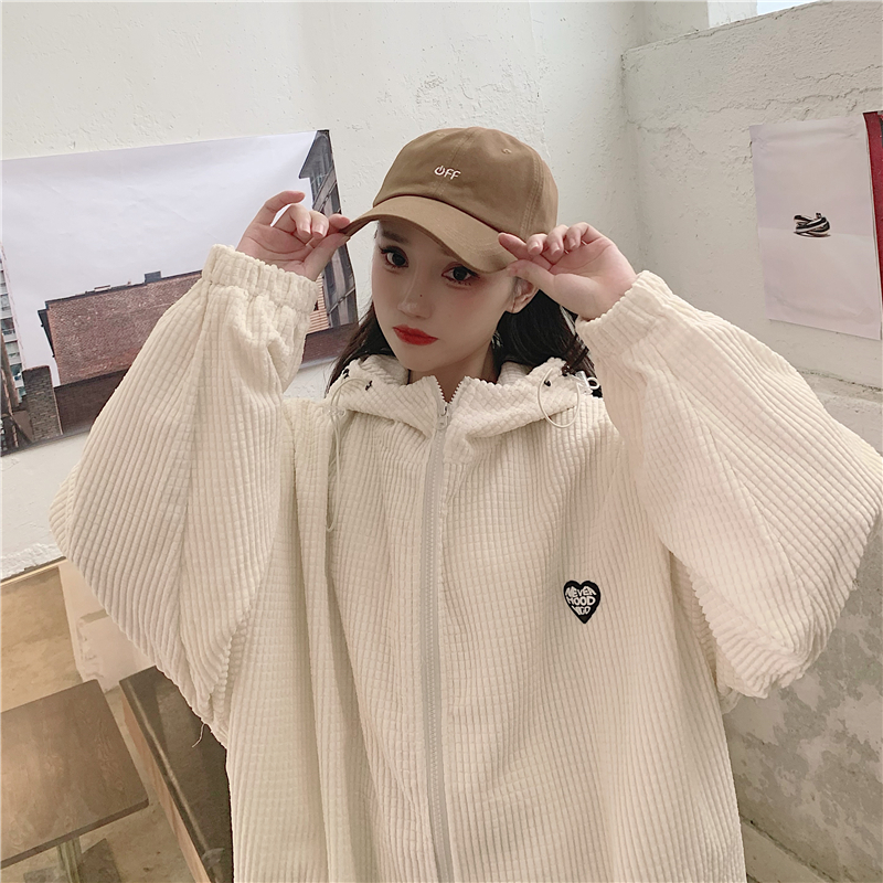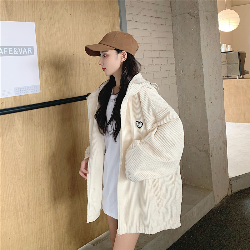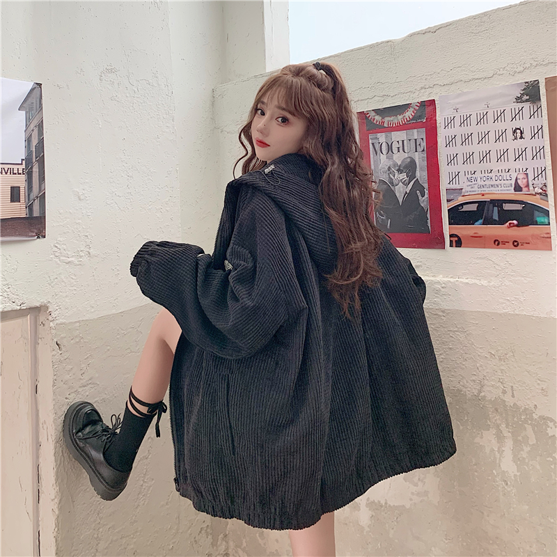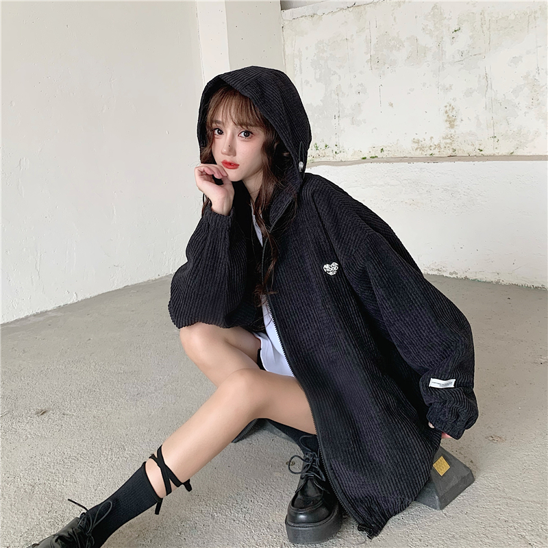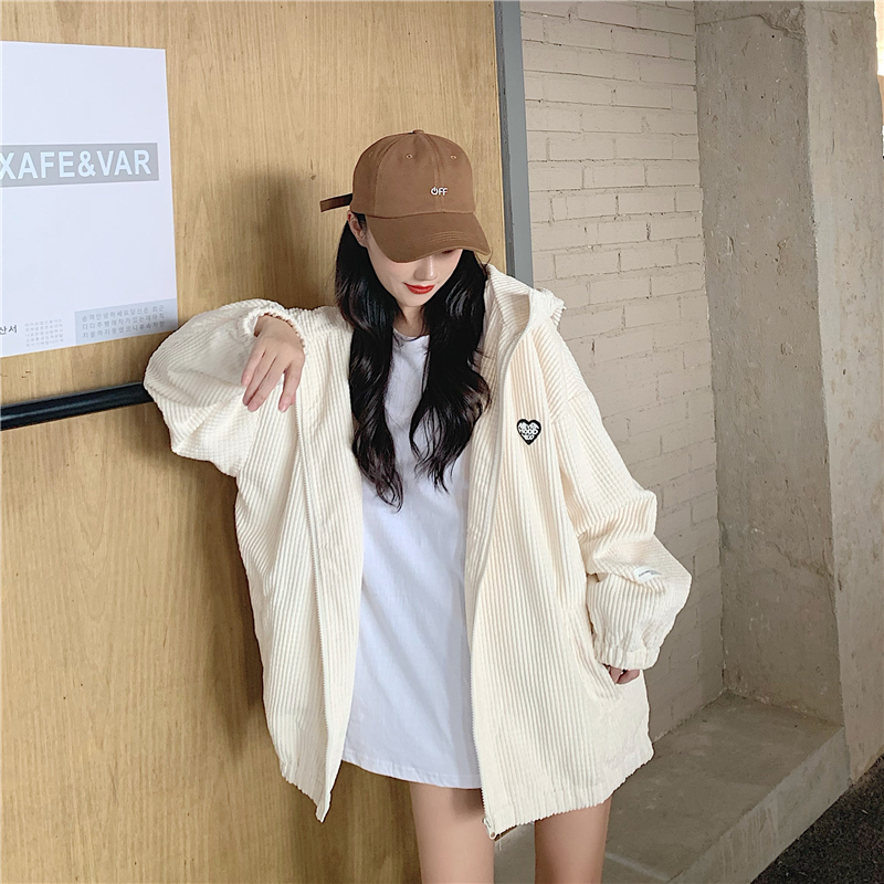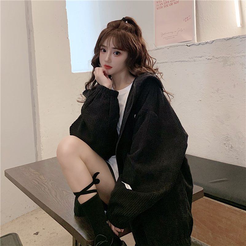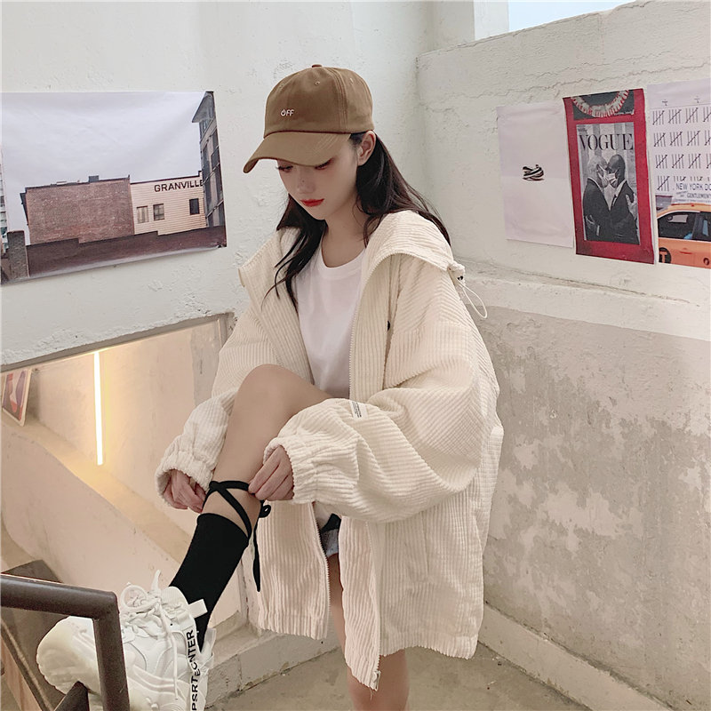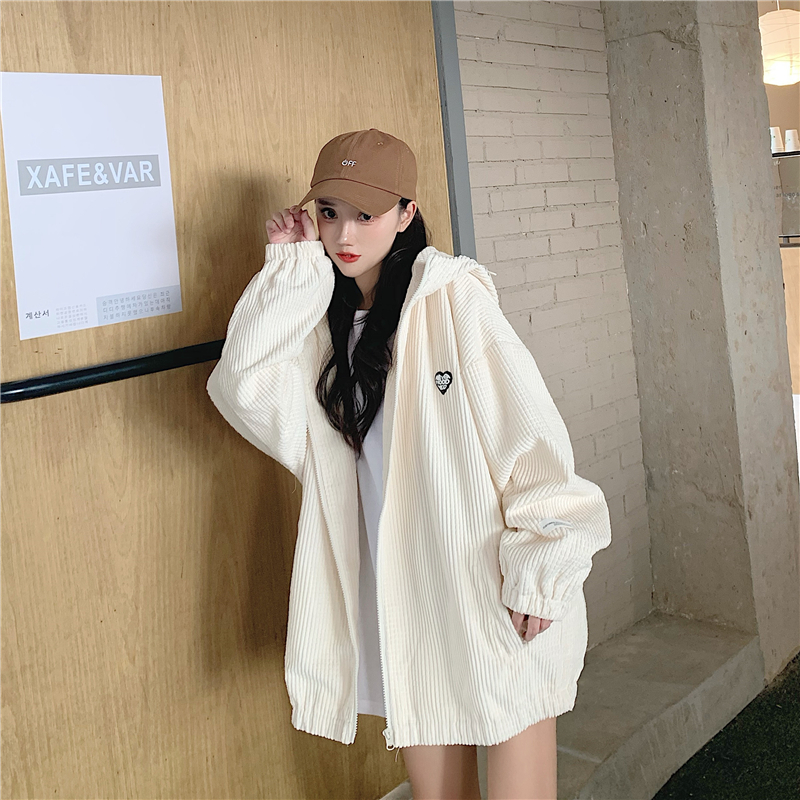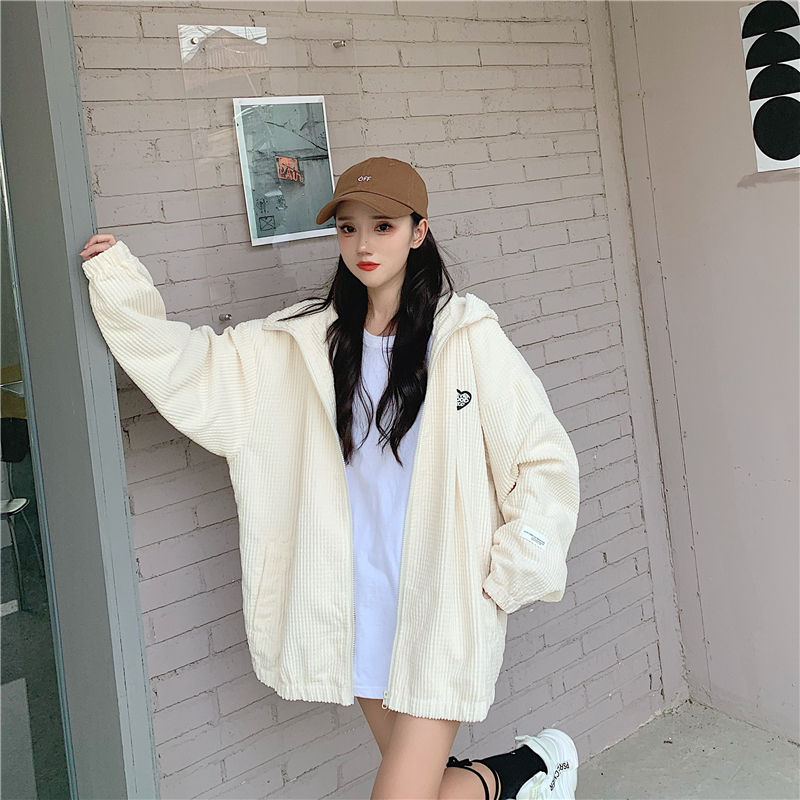 藍色華夫格連帽外套女春秋季百搭寬鬆bf風中長版休閒夾克oversize