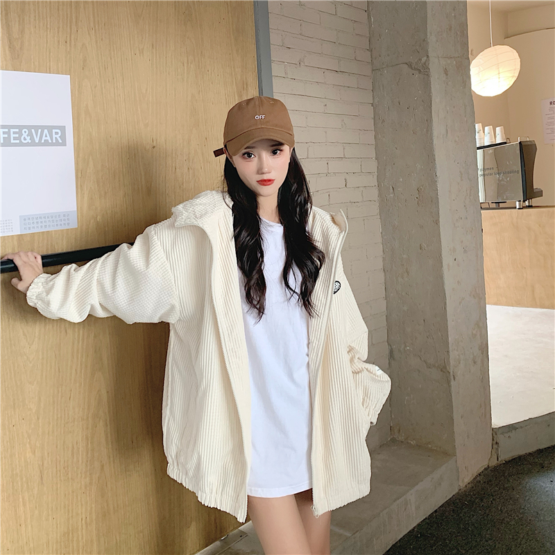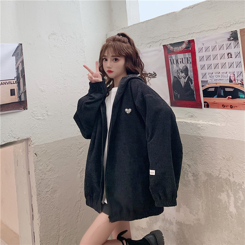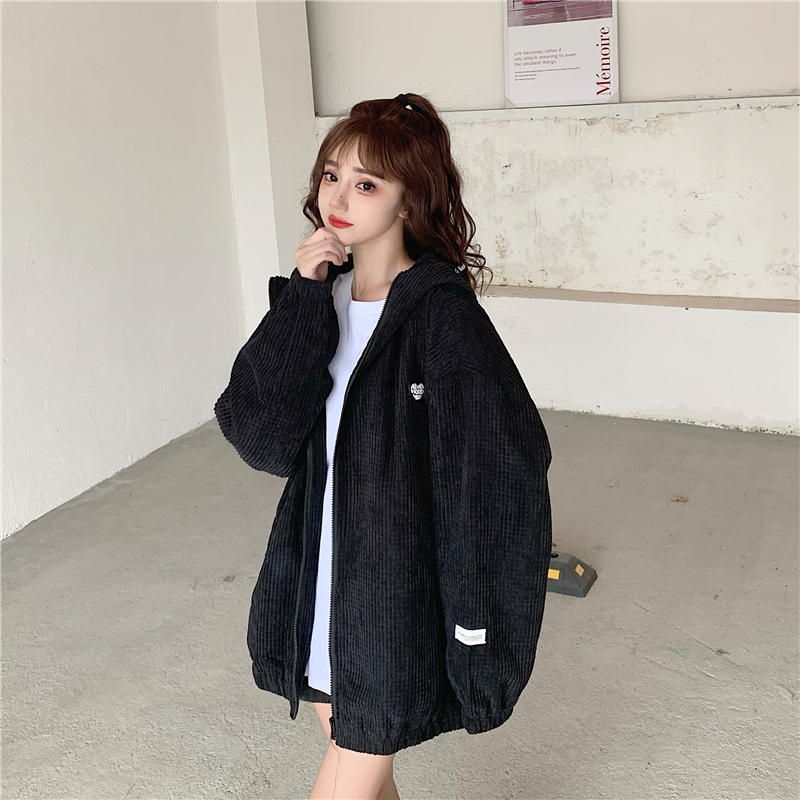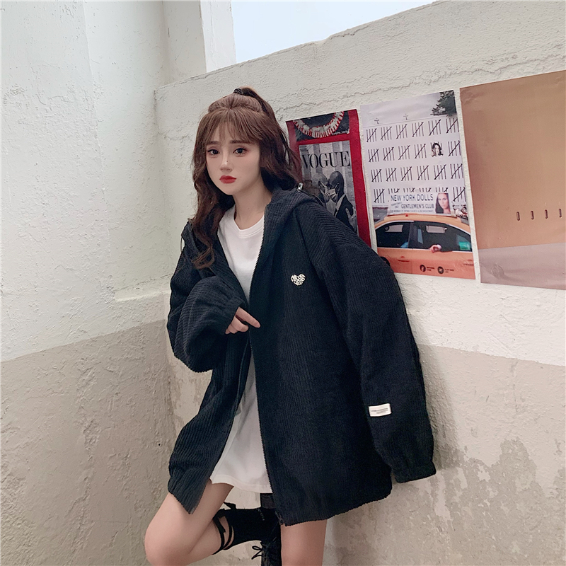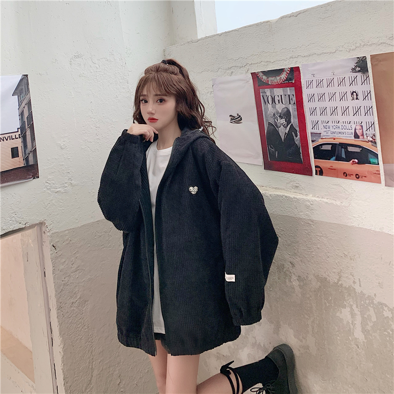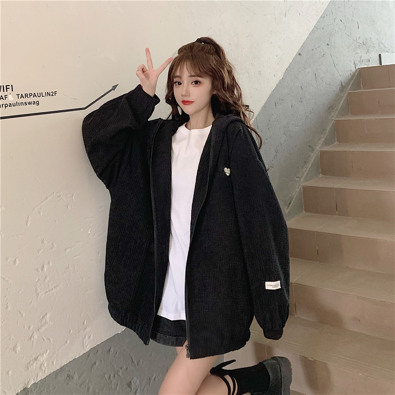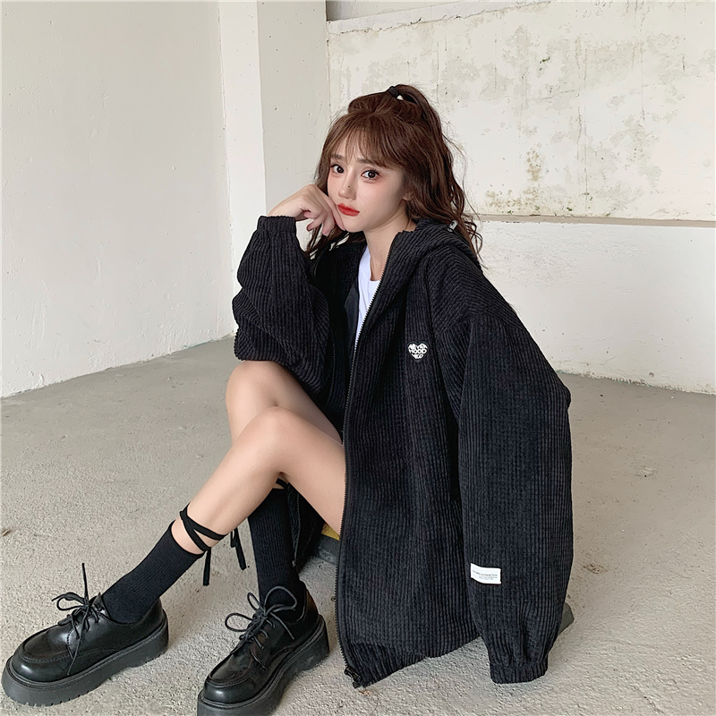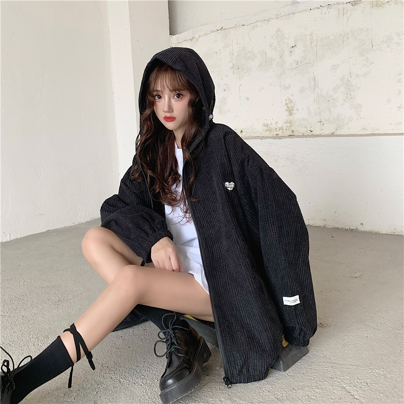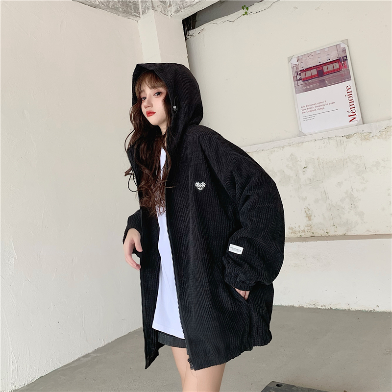藍色華夫格連帽外套女春秋季百搭寬鬆bf風中長版休閒夾克oversize