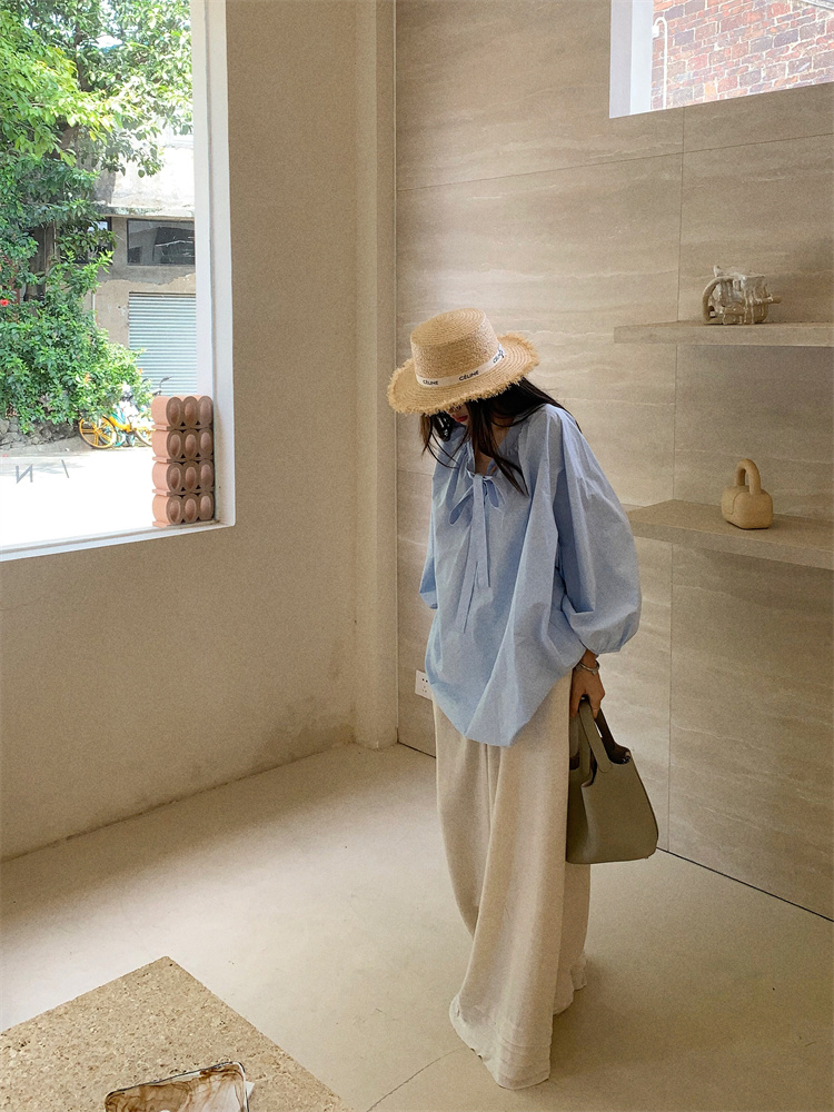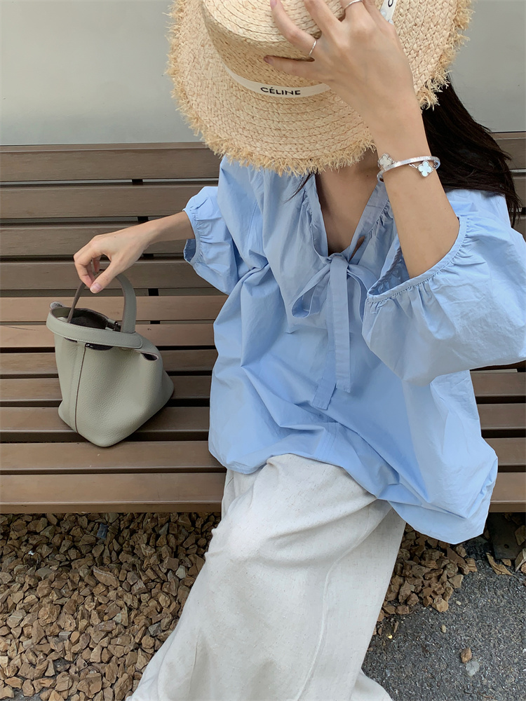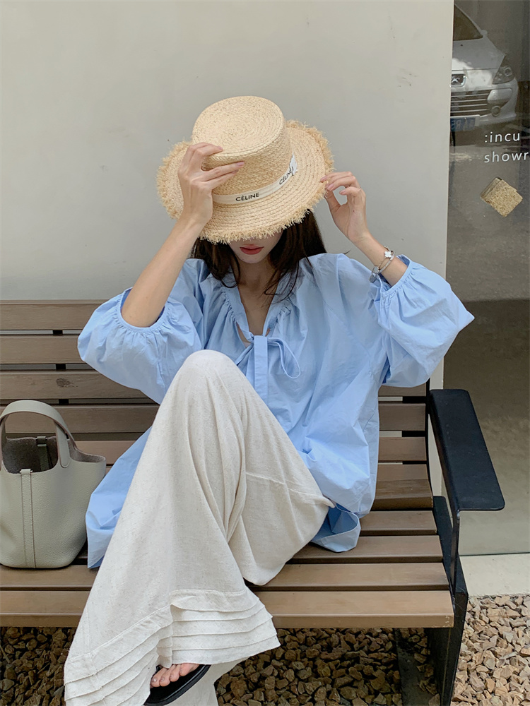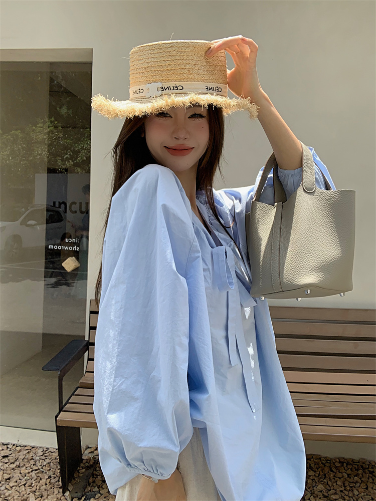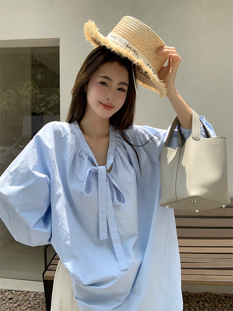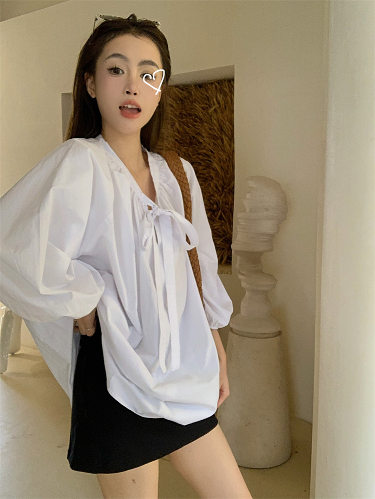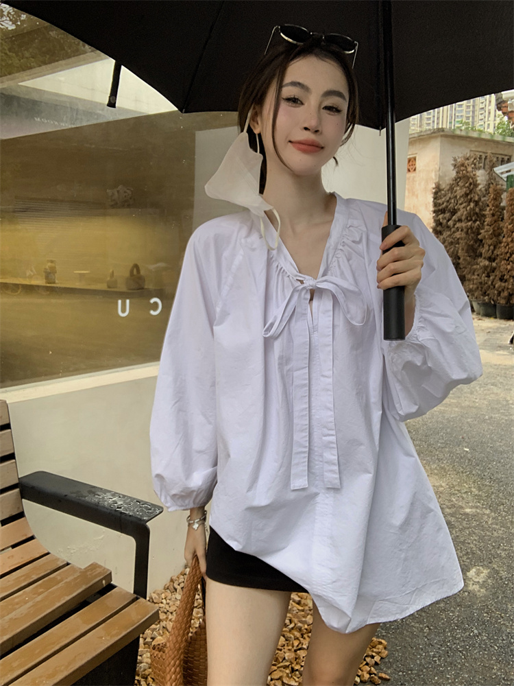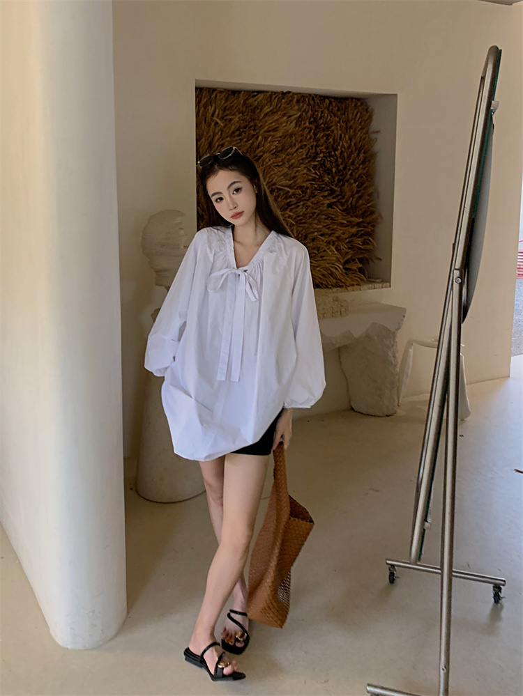 PPHOME甜偶劇女主~法式氣質V領長袖襯衫女高級寬鬆百搭燈籠袖上衣
