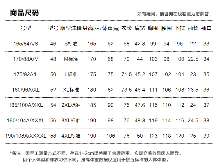 尺碼 165/84A/S,170/88A/M,175/92A/L,180/96A/XL,185/100A/XXL,190/104A/XXXL,190/108A/XXXXL