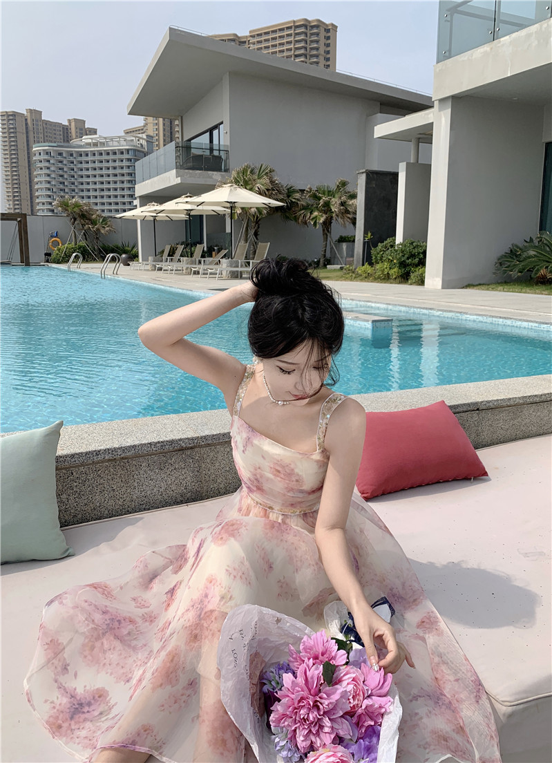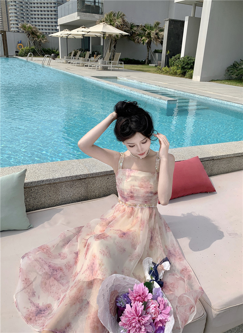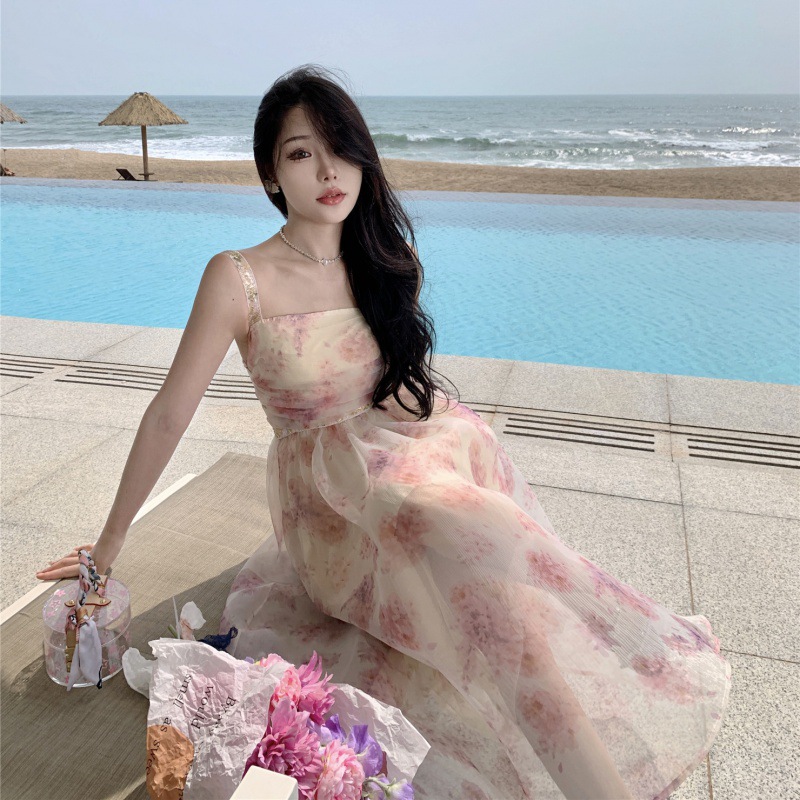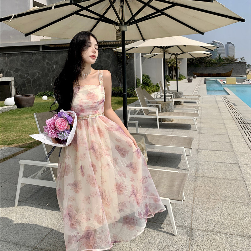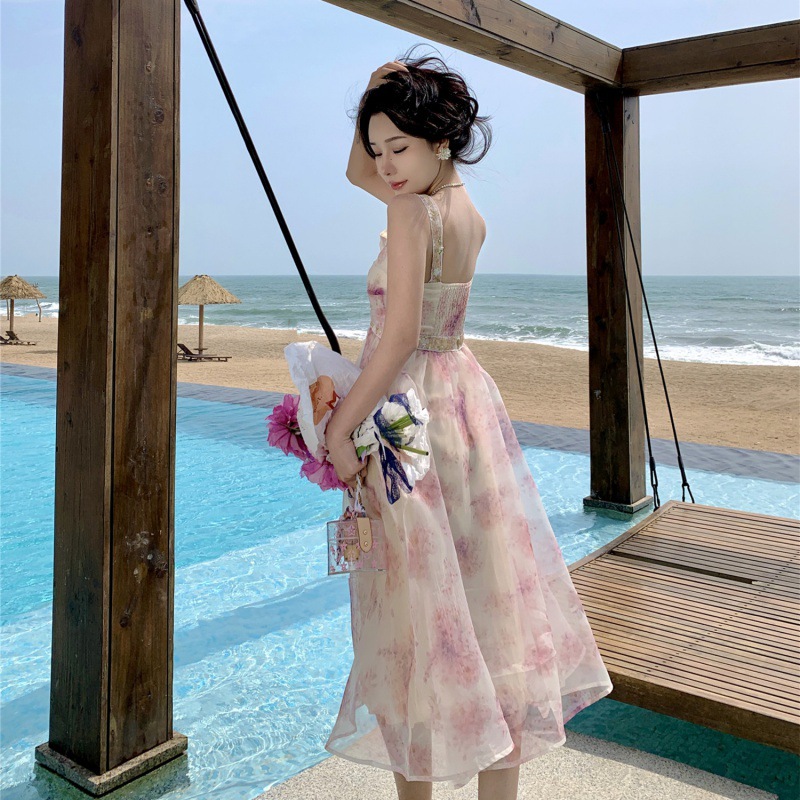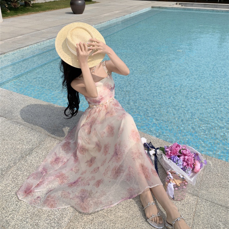 法式轻奢高级手工订钻仙女感修身碎花吊带连衣裙女夏季