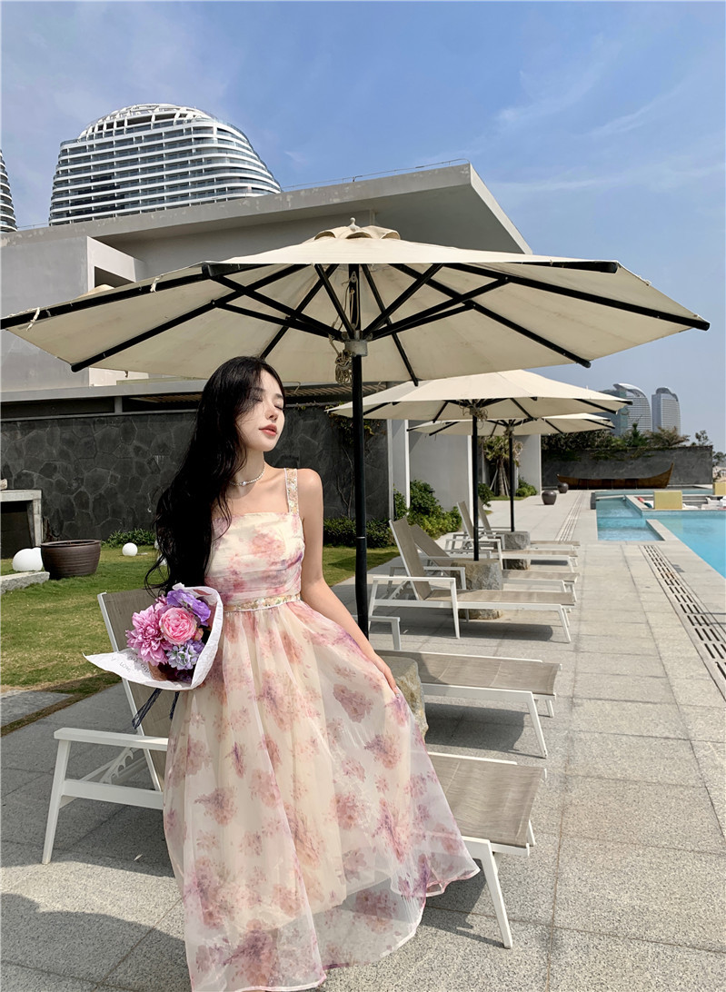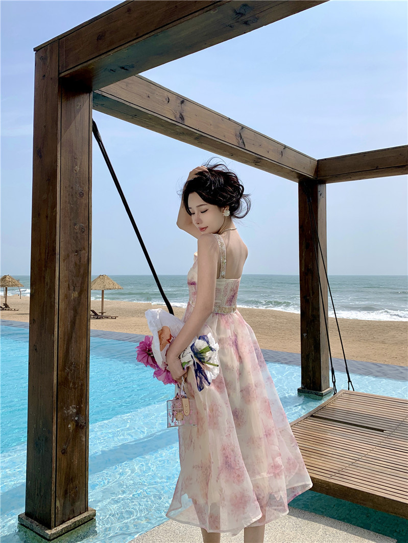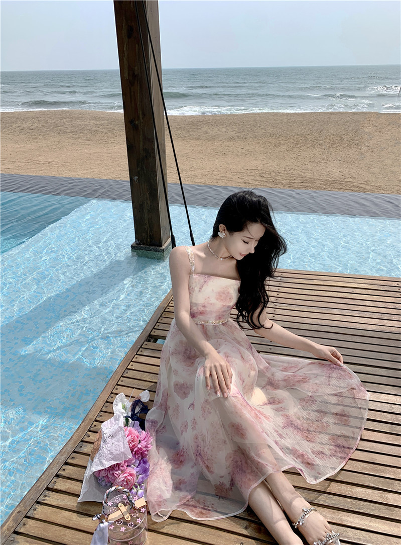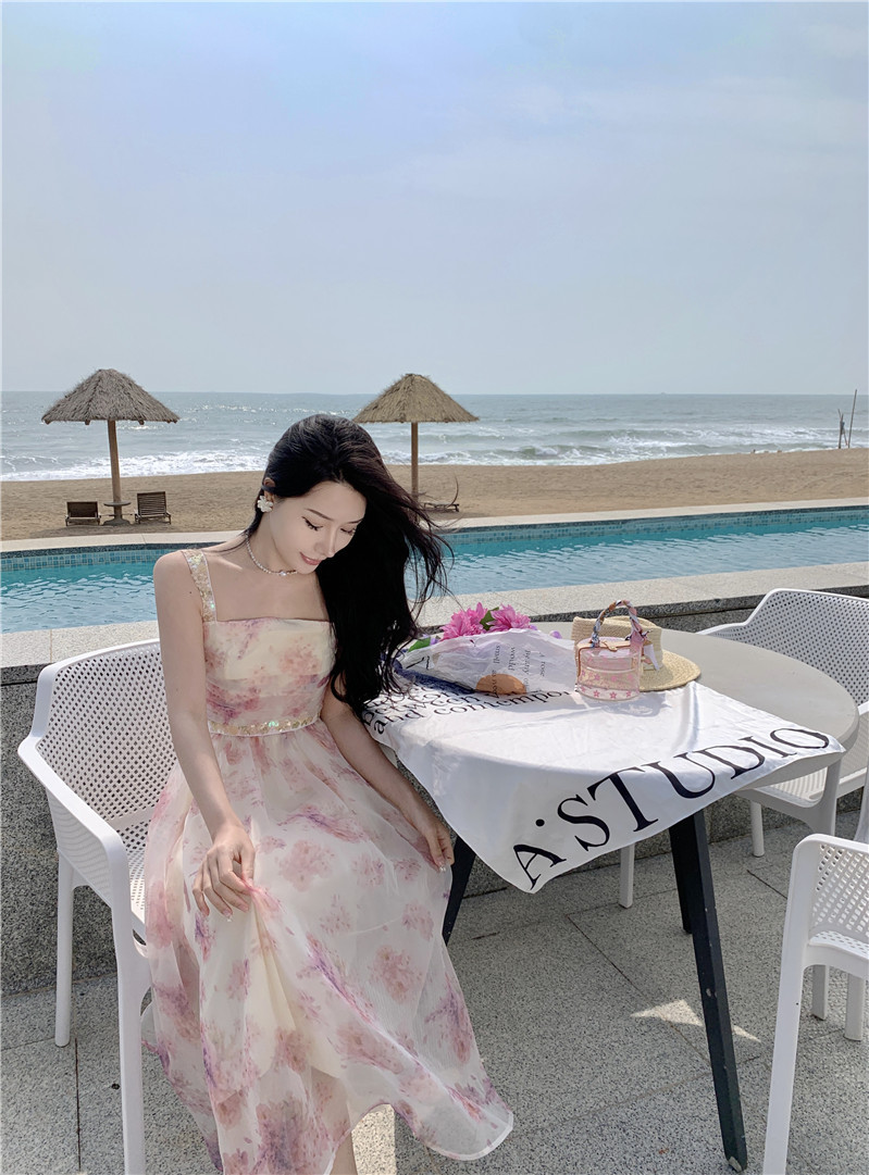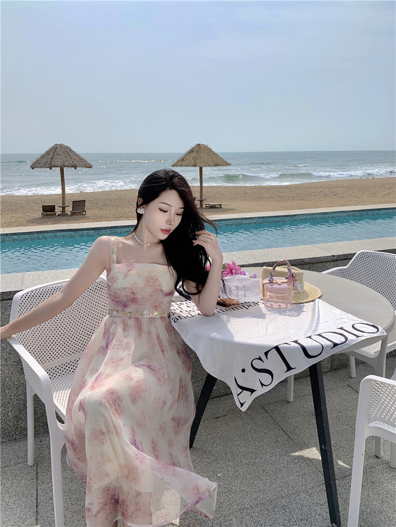 法式轻奢高级手工订钻仙女感修身碎花吊带连衣裙女夏季