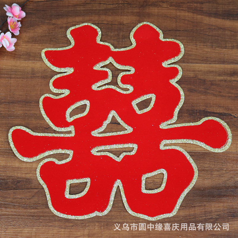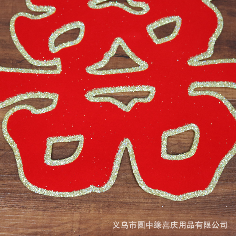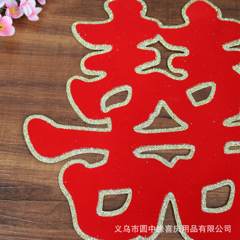厂家直销 义乌婚庆用品批发 婚礼用绒面金粉喜字 40洒金植绒草喜