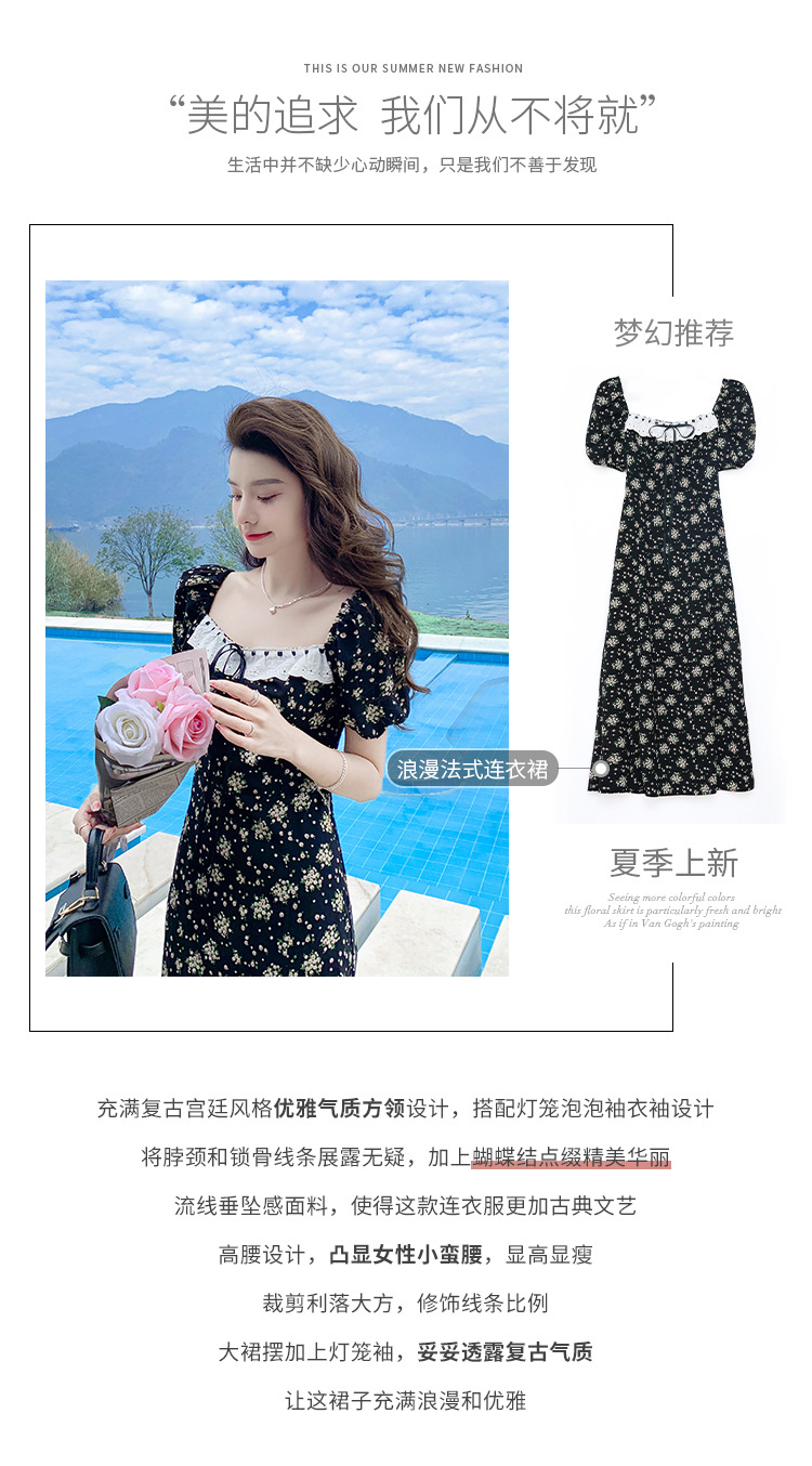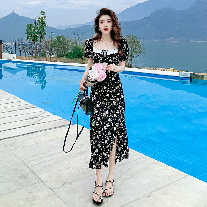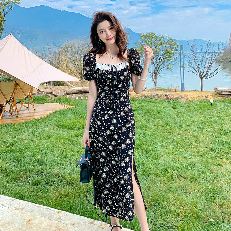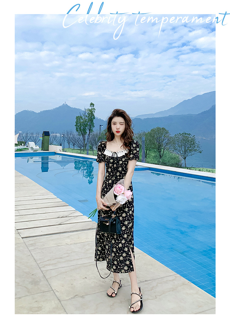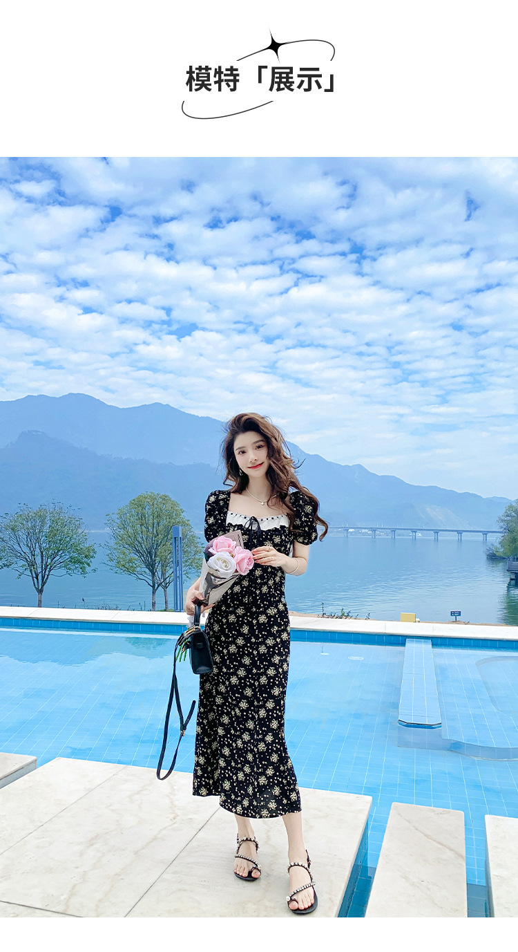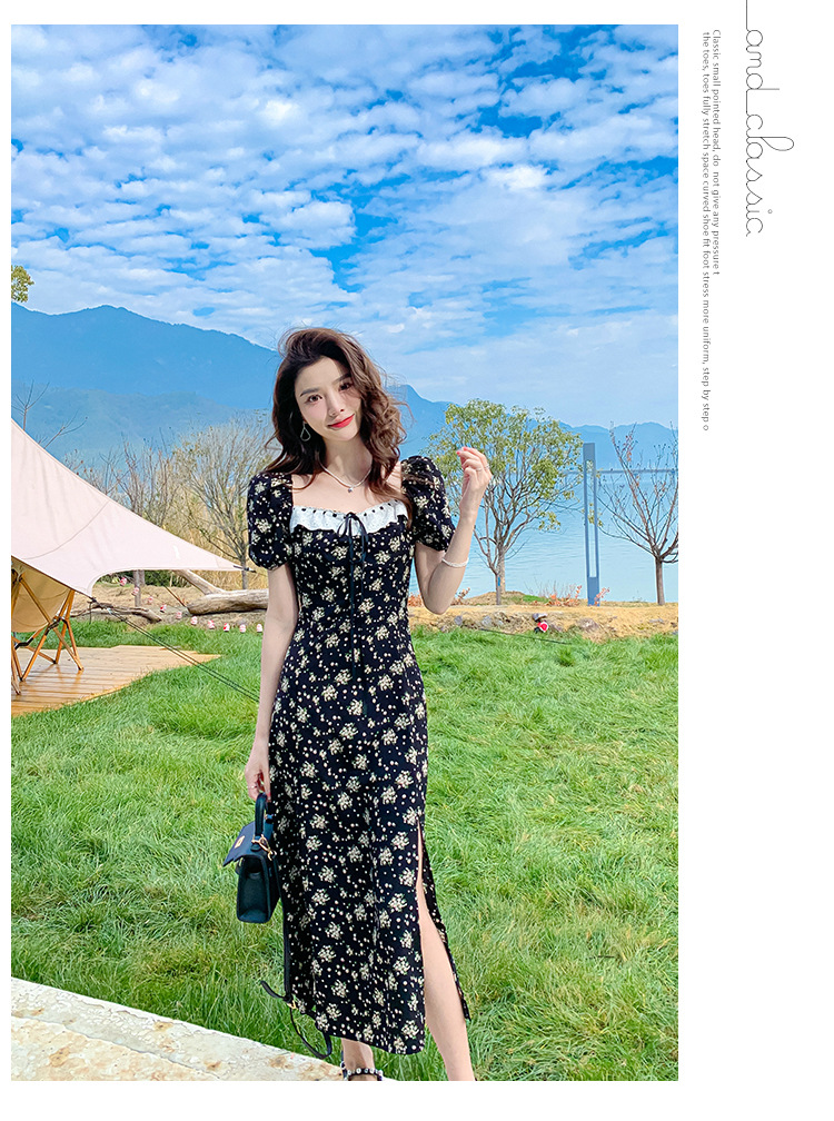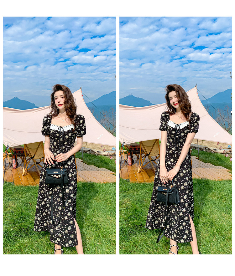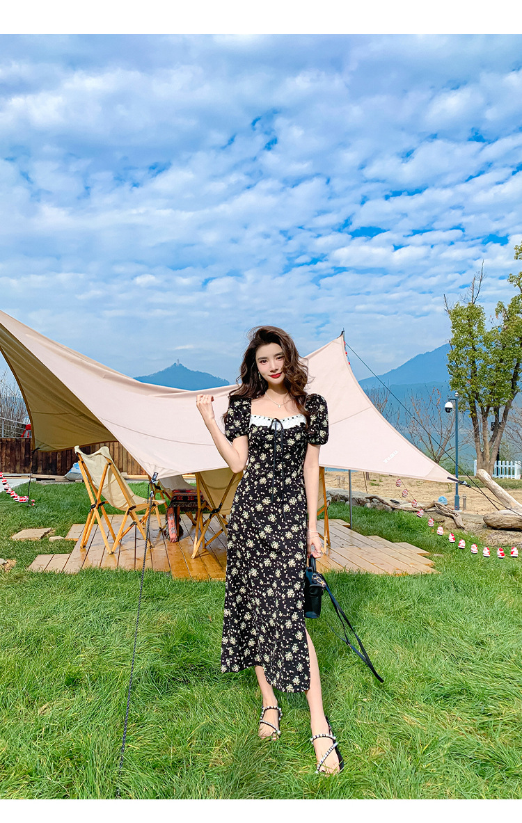 雪纺碎花连衣裙女2023夏季新款法式复古方领泡泡袖下摆开叉茶歇