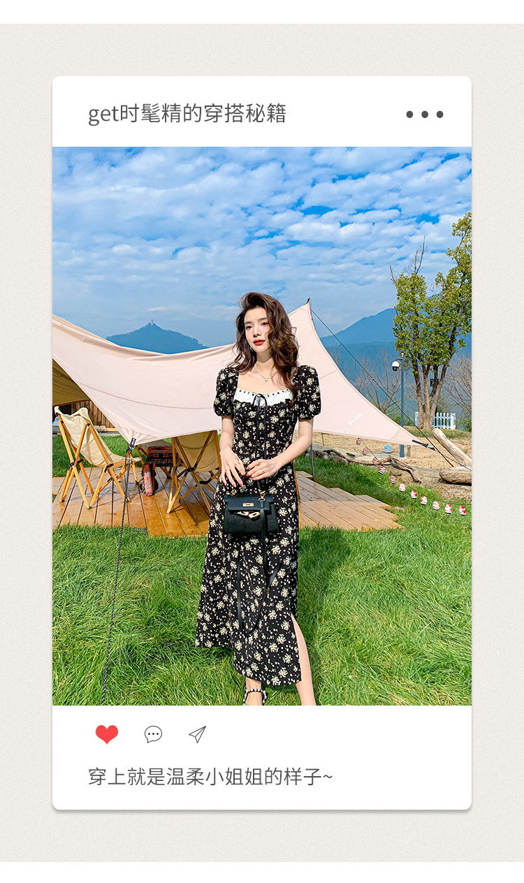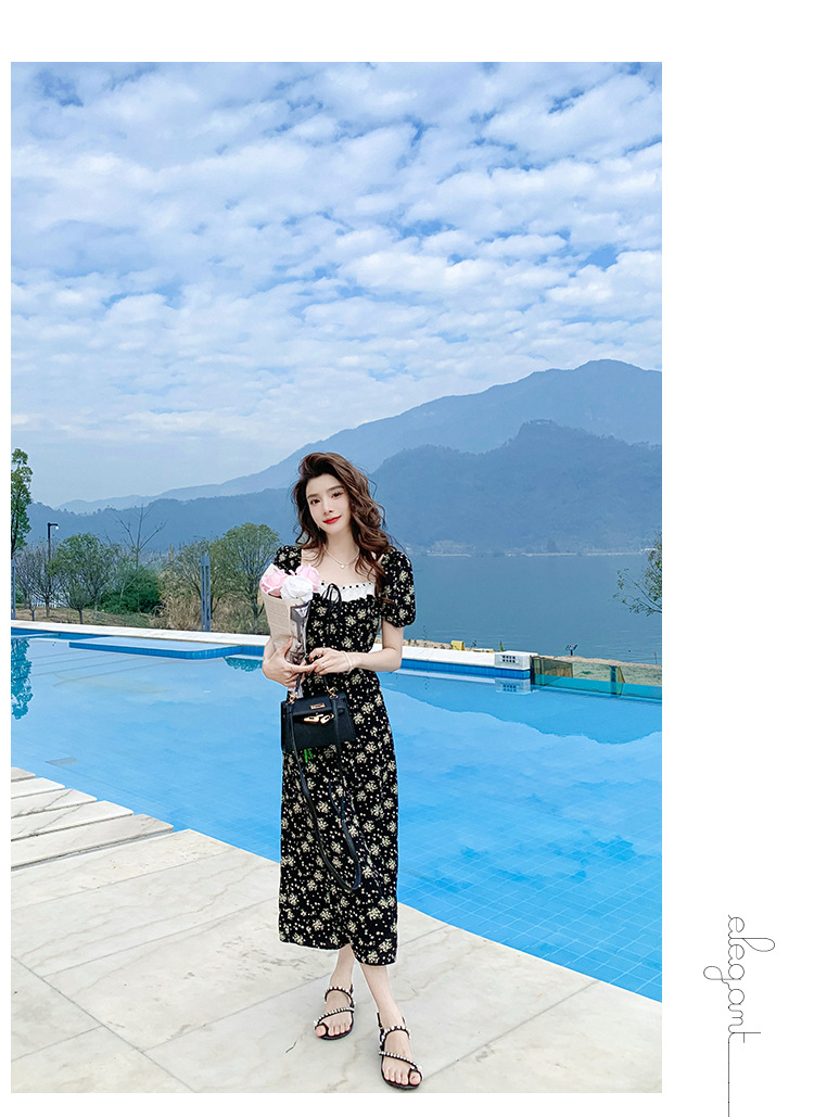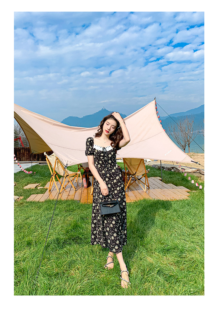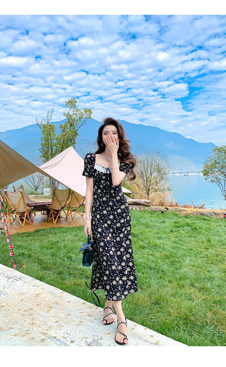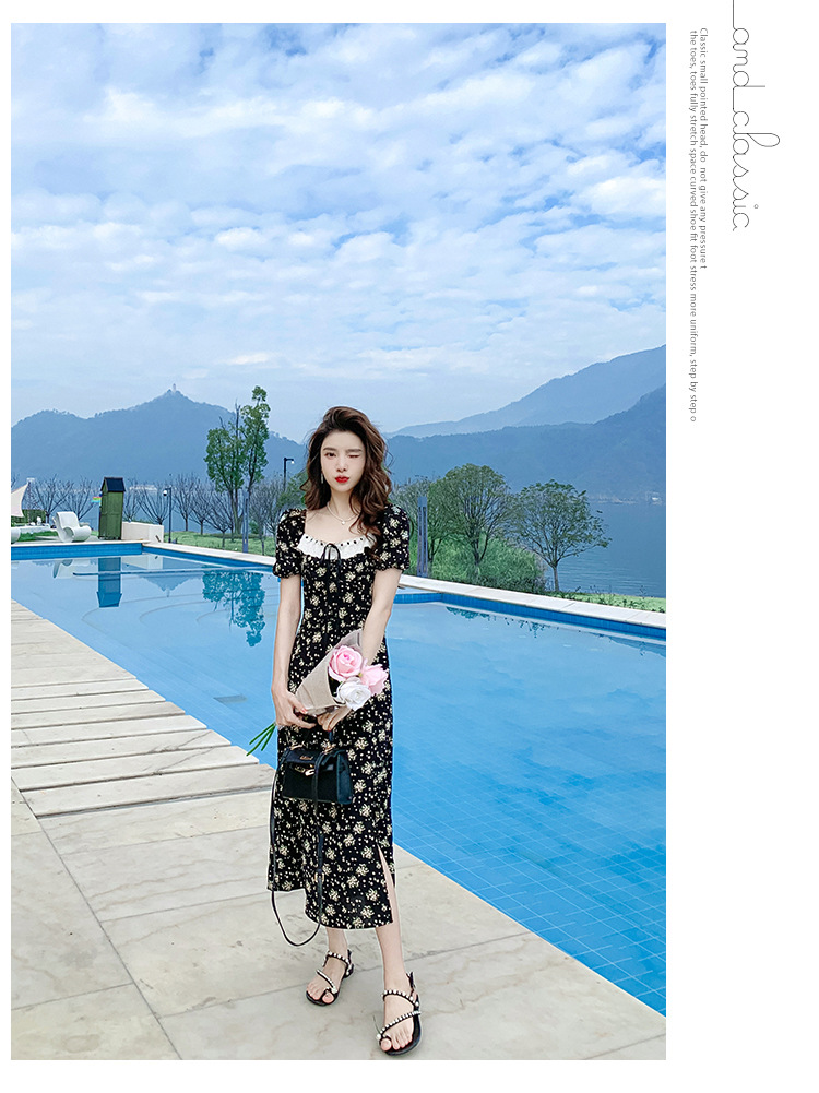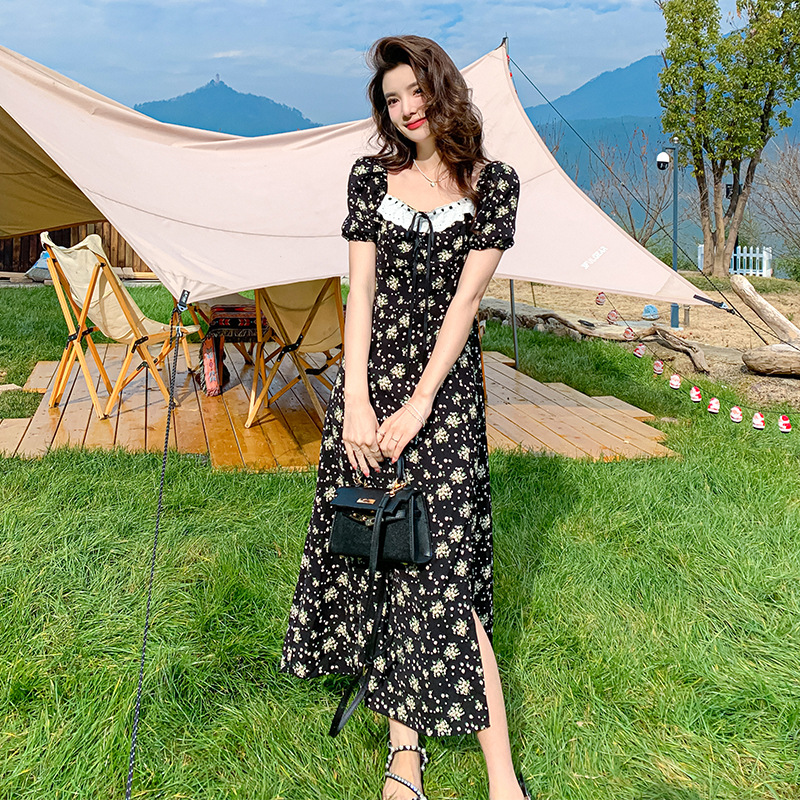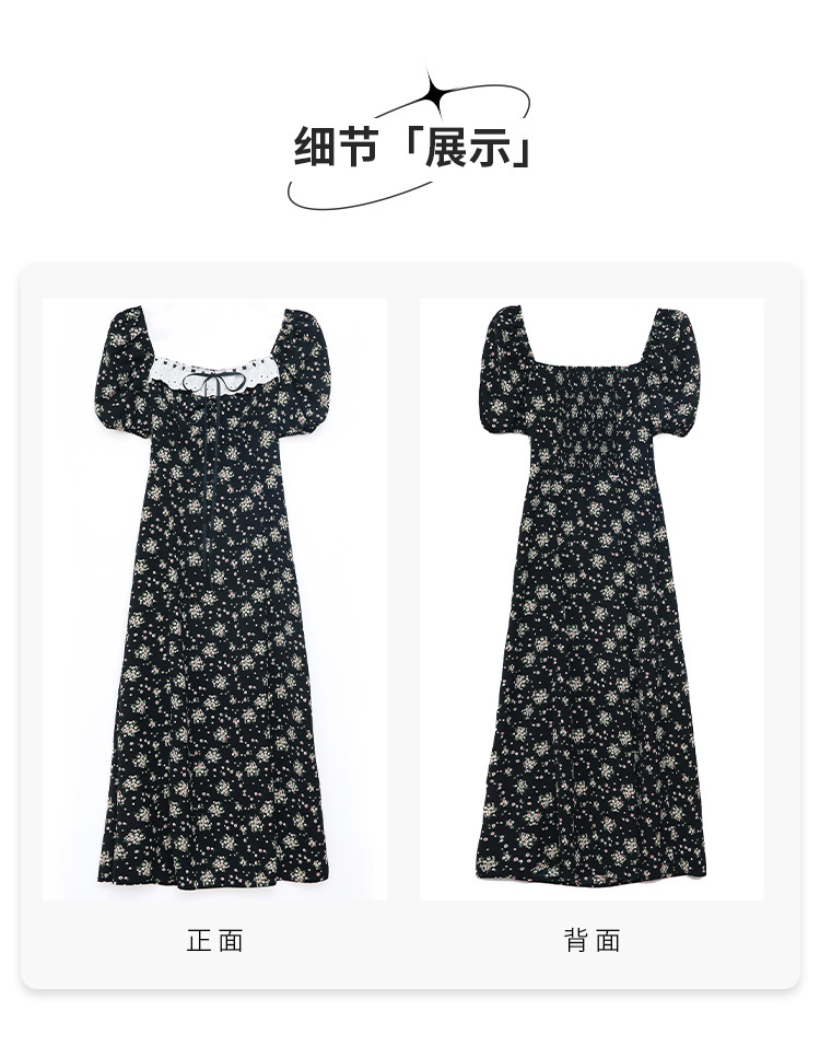 雪纺碎花连衣裙女2023夏季新款法式复古方领泡泡袖下摆开叉茶歇