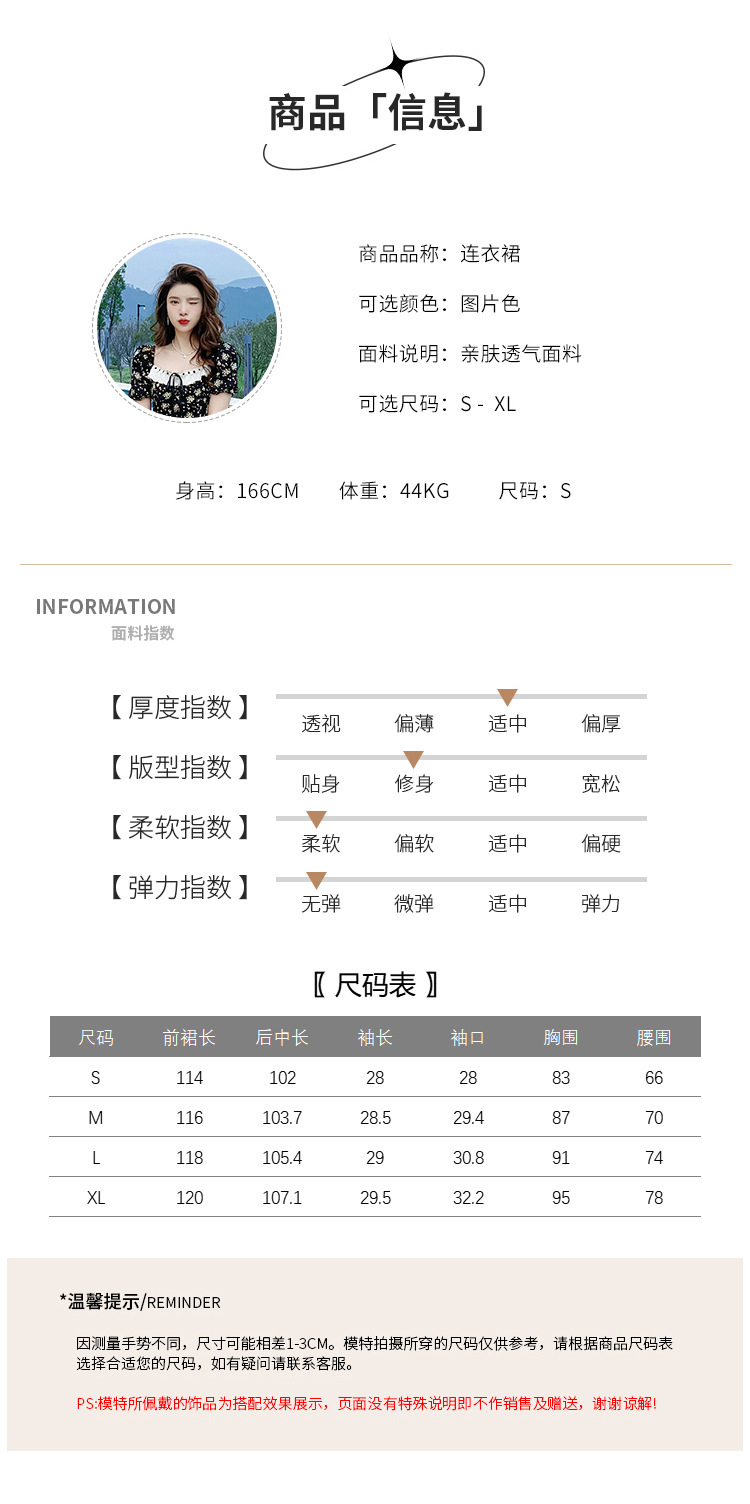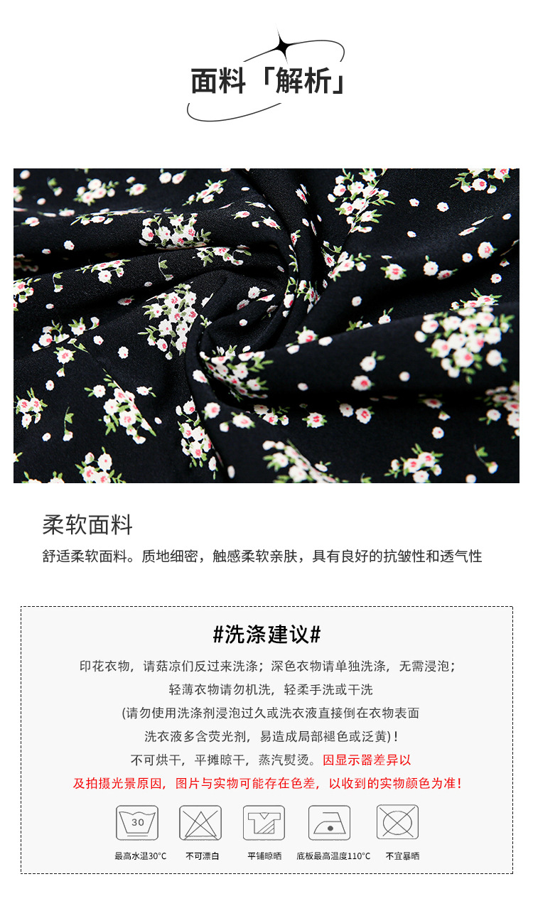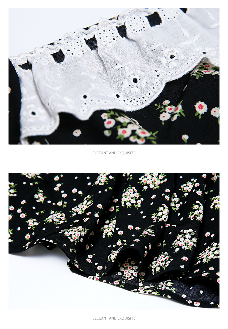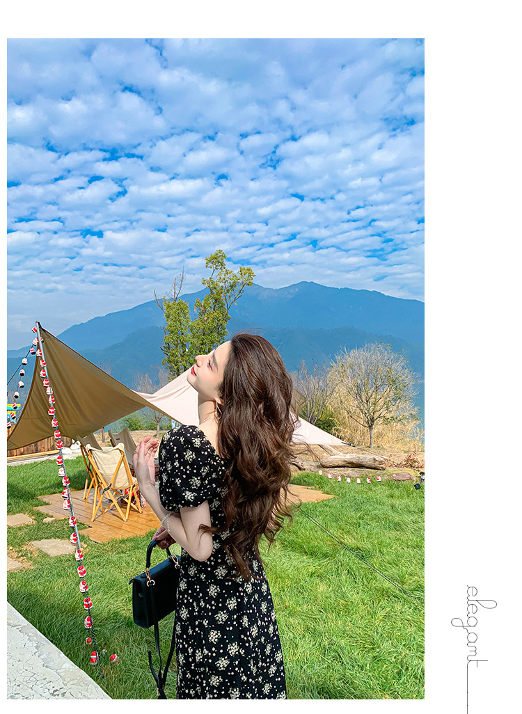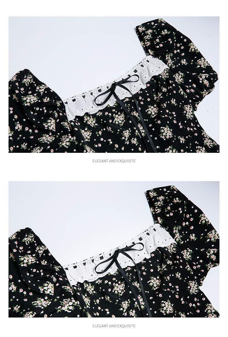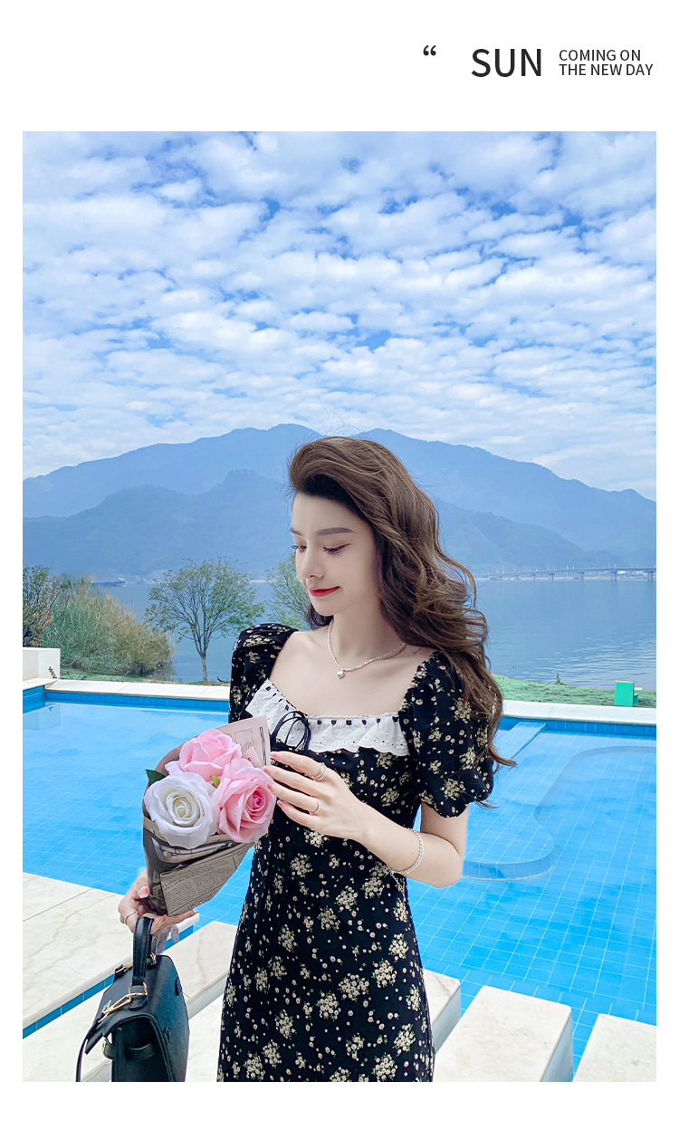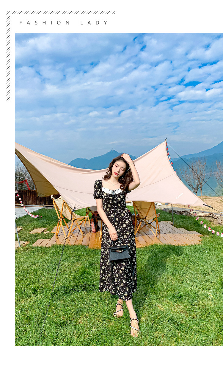 雪纺碎花连衣裙女2023夏季新款法式复古方领泡泡袖下摆开叉茶歇
