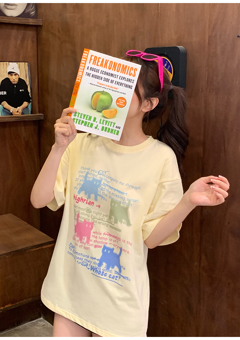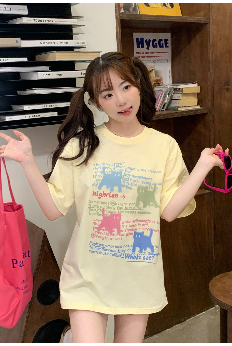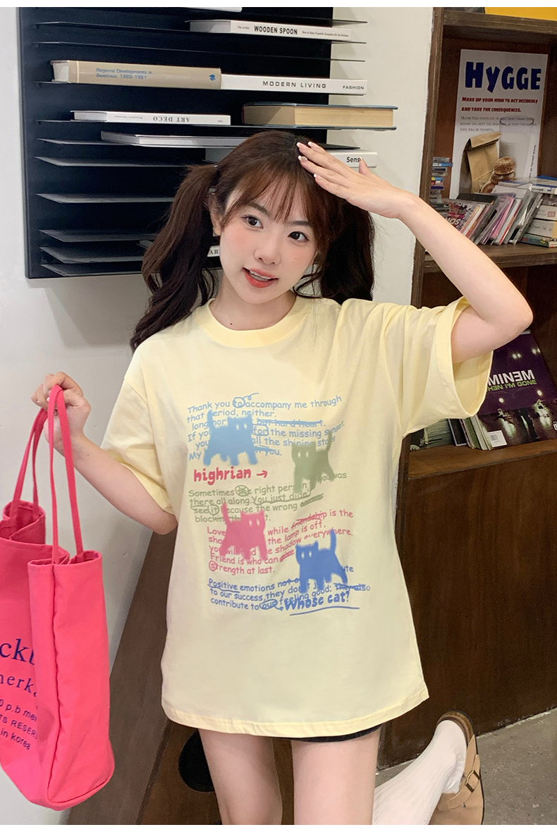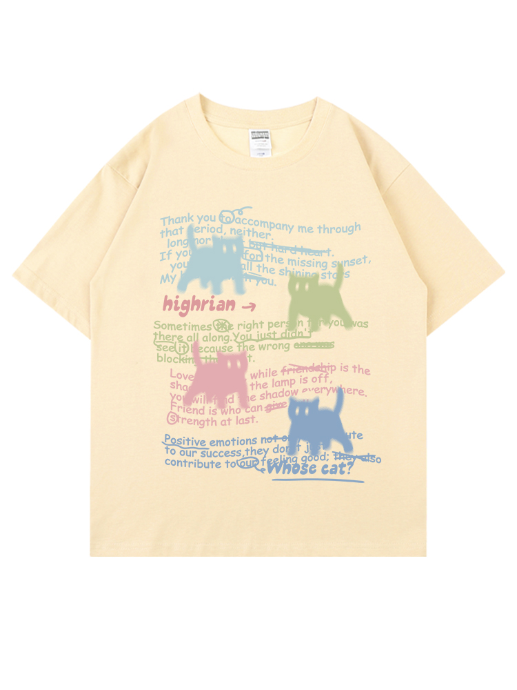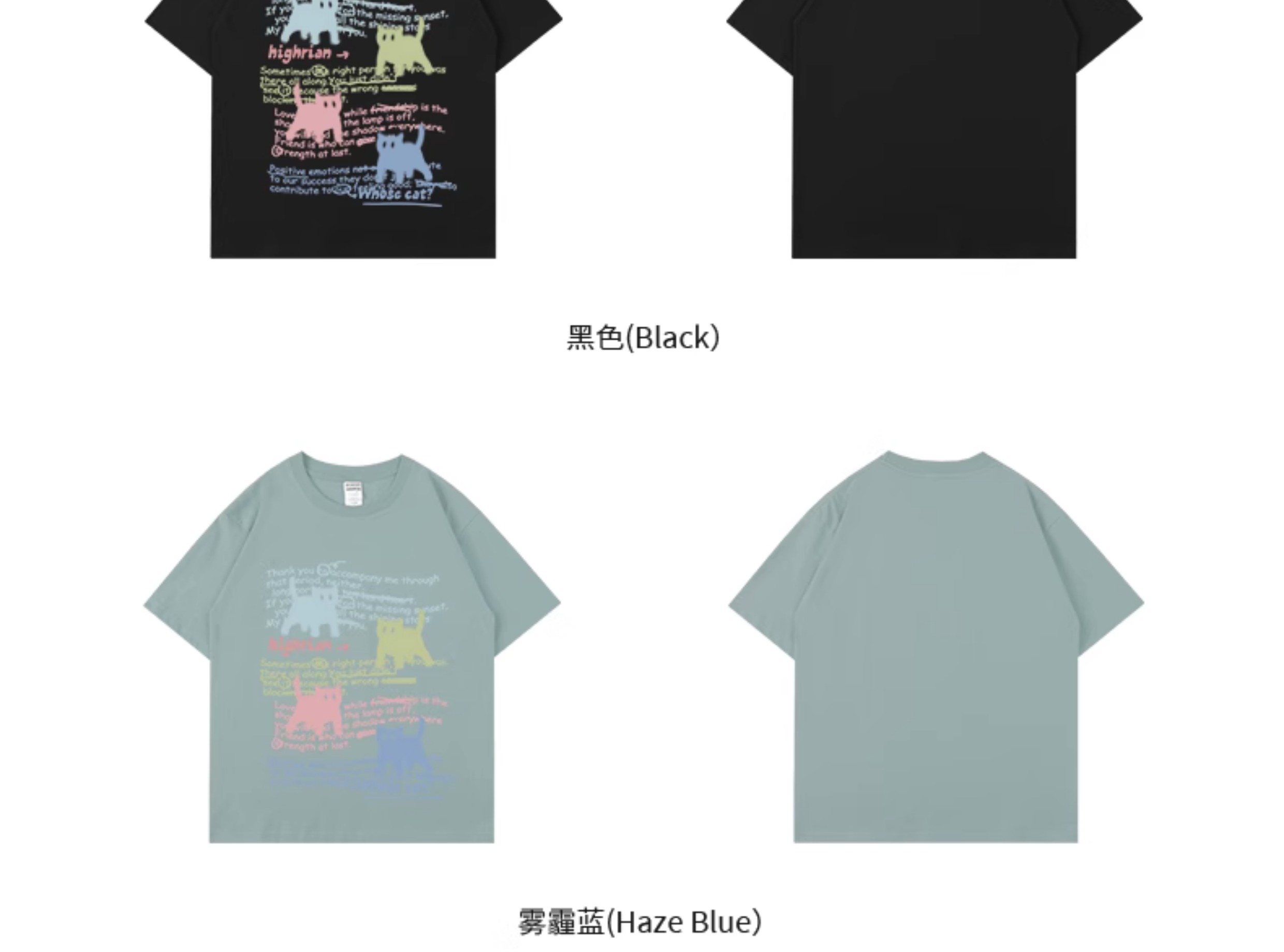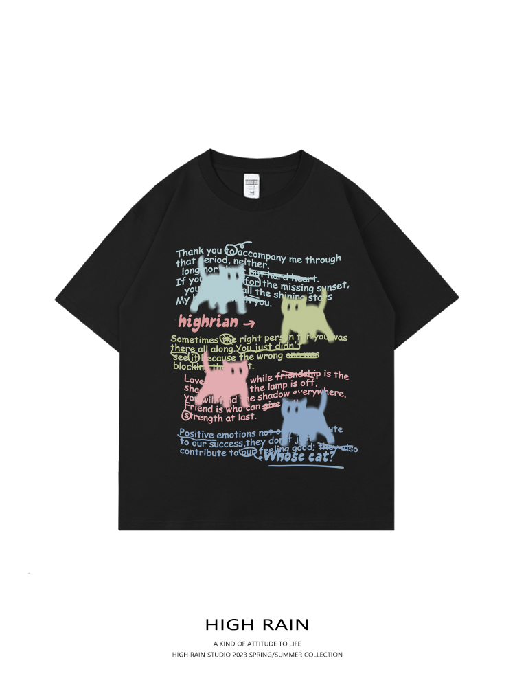 high rain 新款四隻貓貓落肩短袖女奶呼呼休閒純棉T恤情侶上衣夏