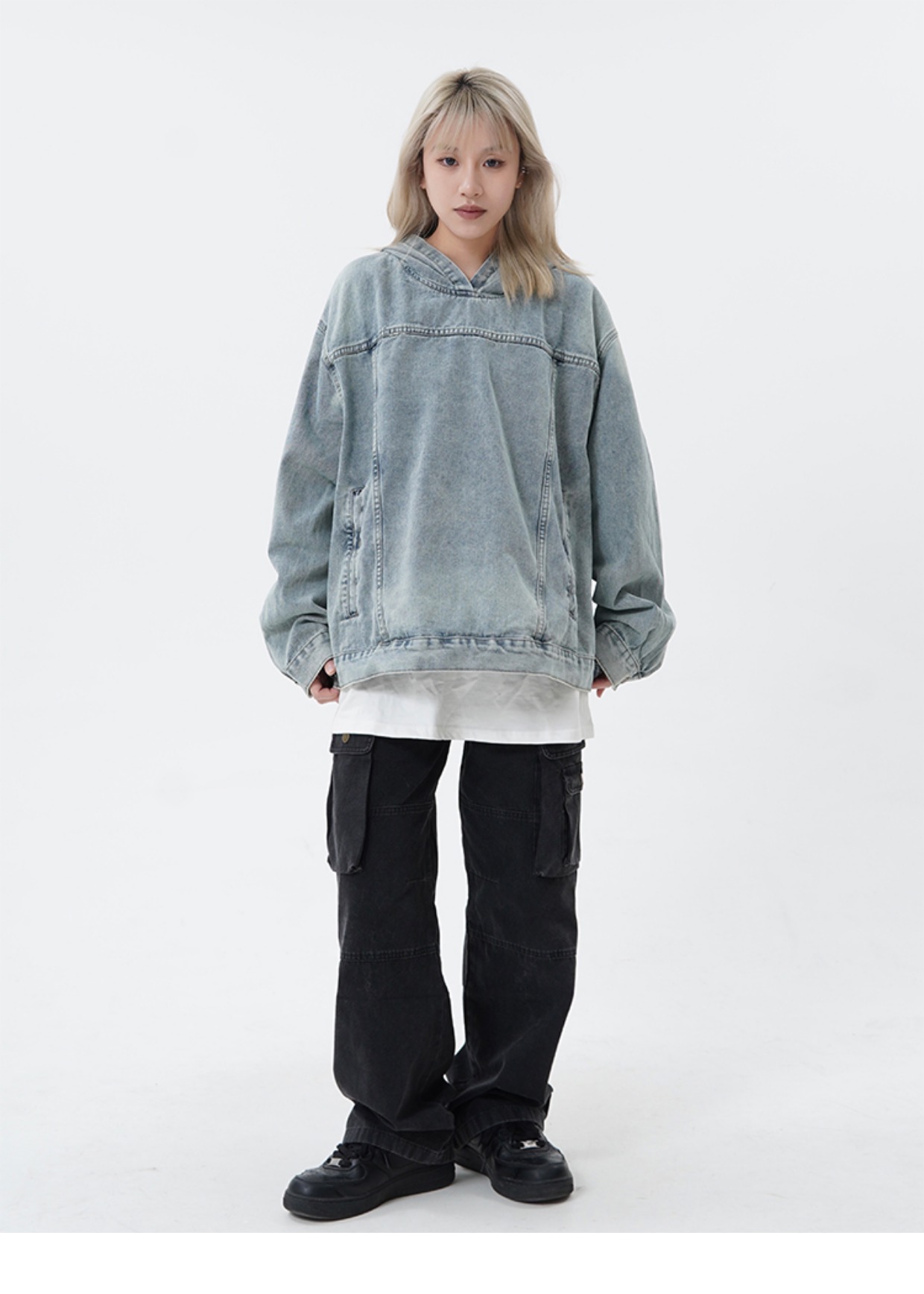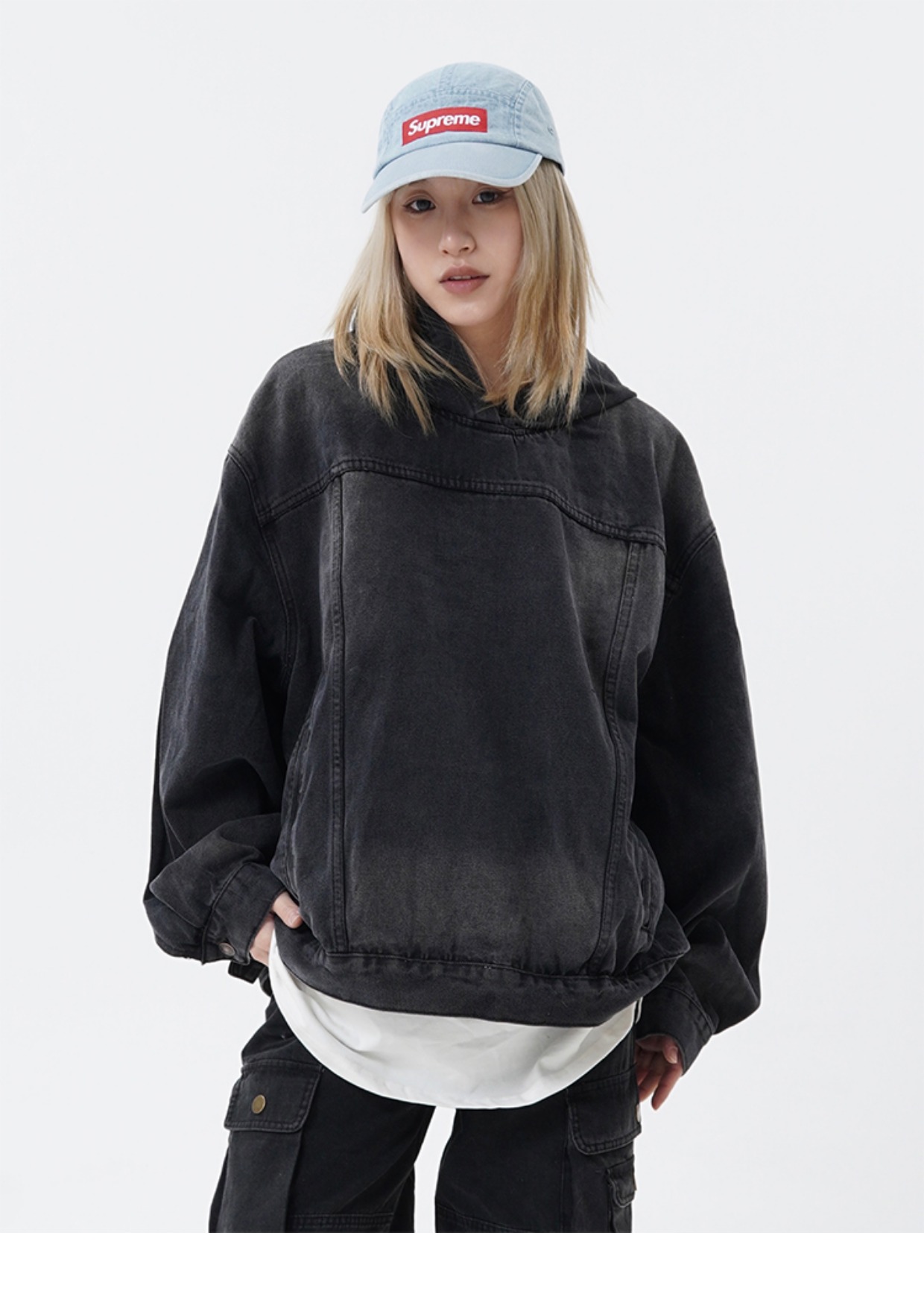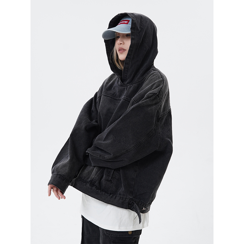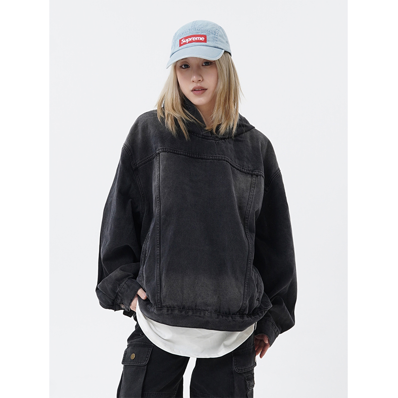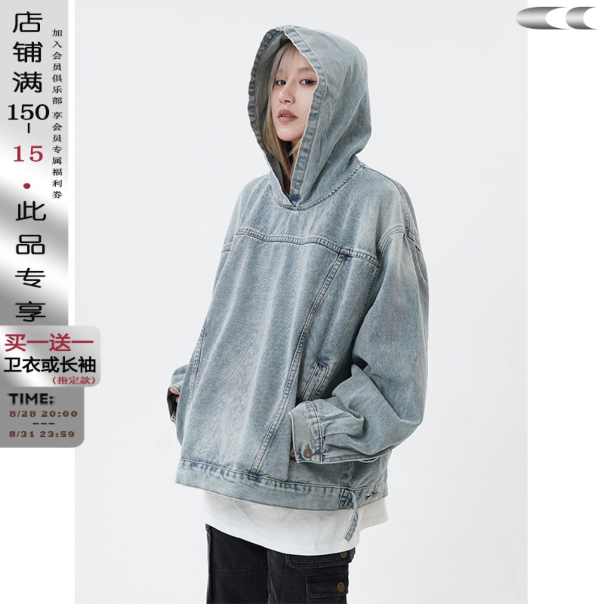 川川也家 原創設計美式高街牛仔連帽運動衫男女寬鬆情侶外套ins潮牌