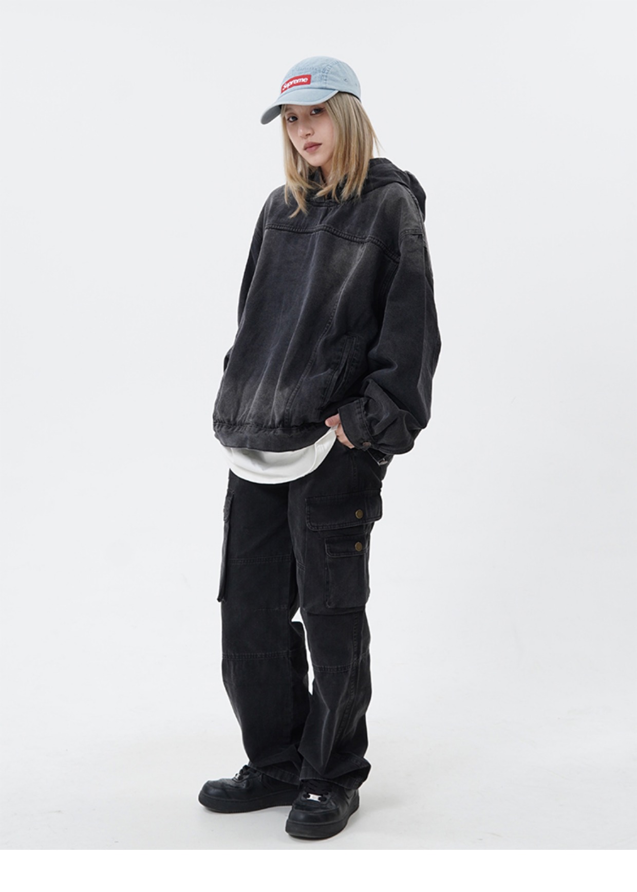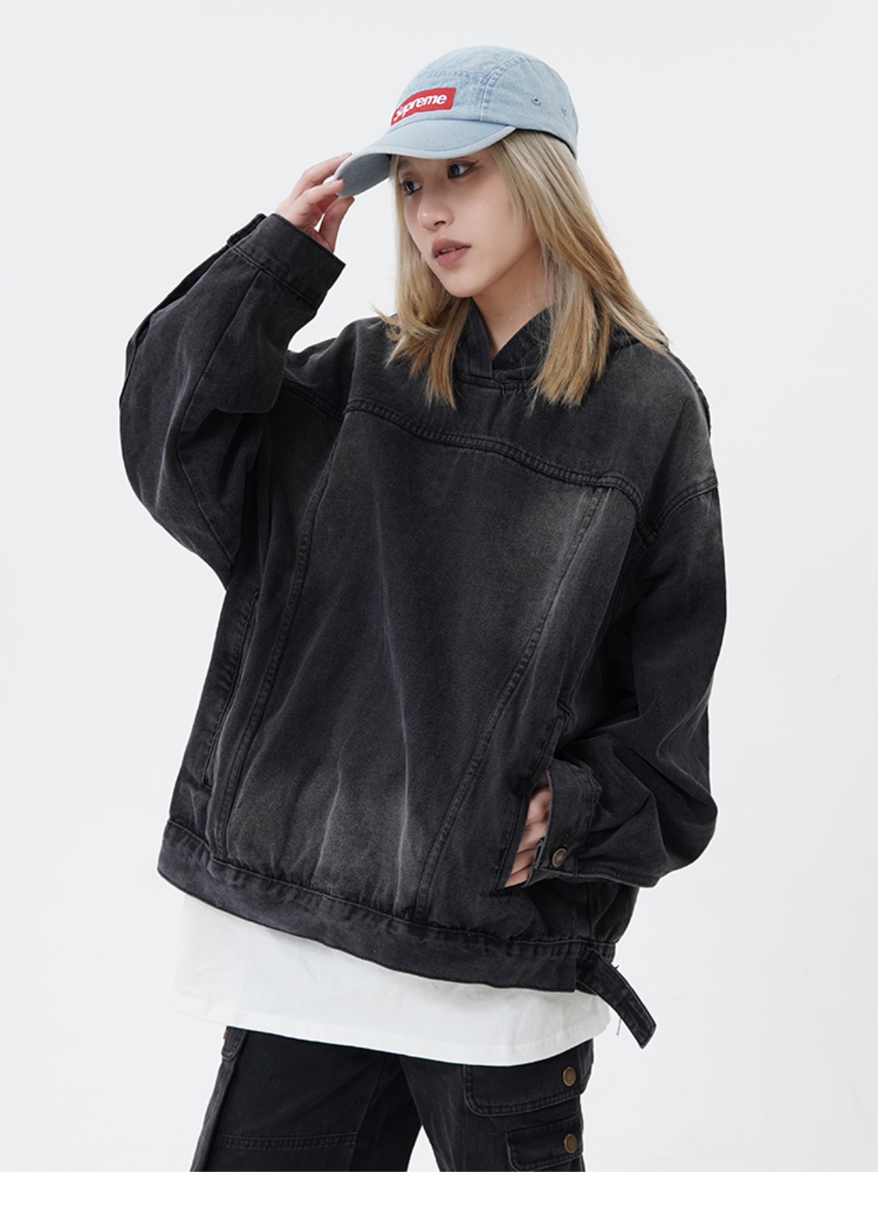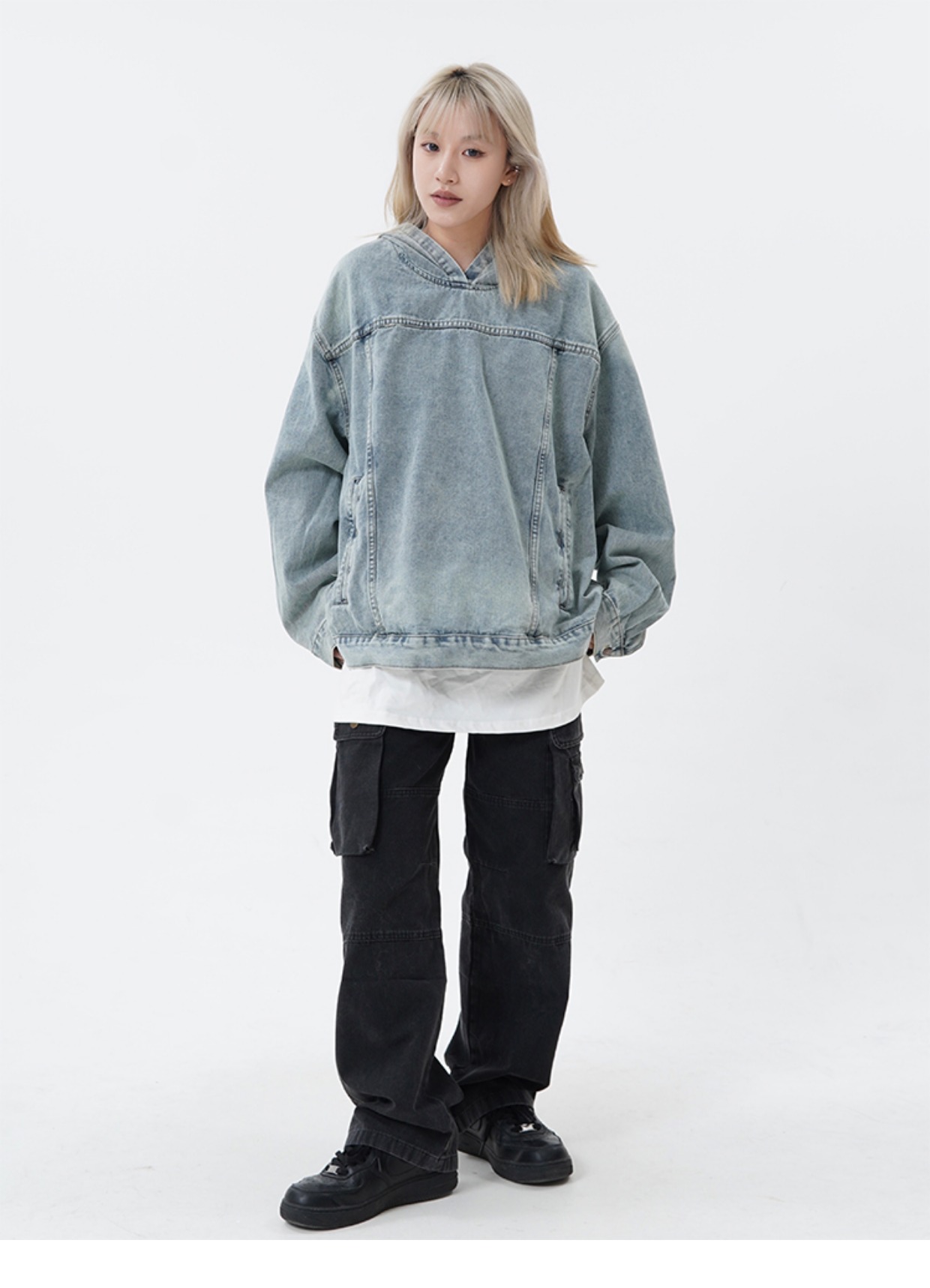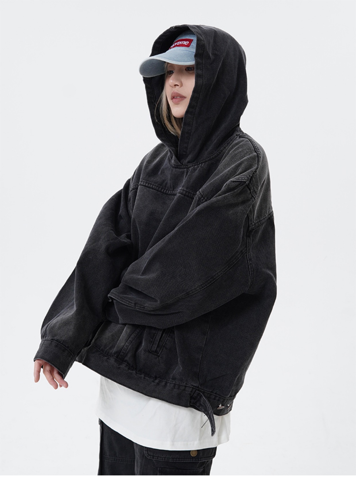 川川也家 原創設計美式高街牛仔連帽運動衫男女寬鬆情侶外套ins潮牌