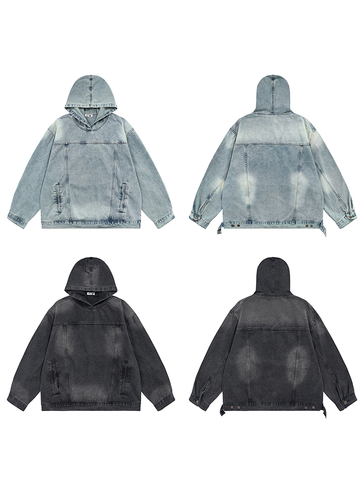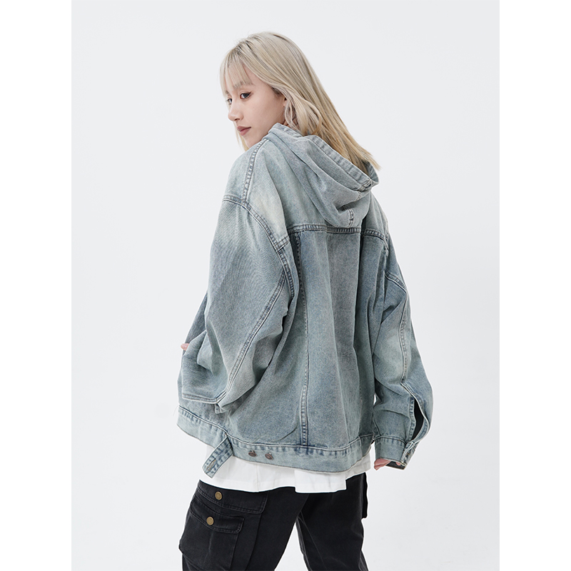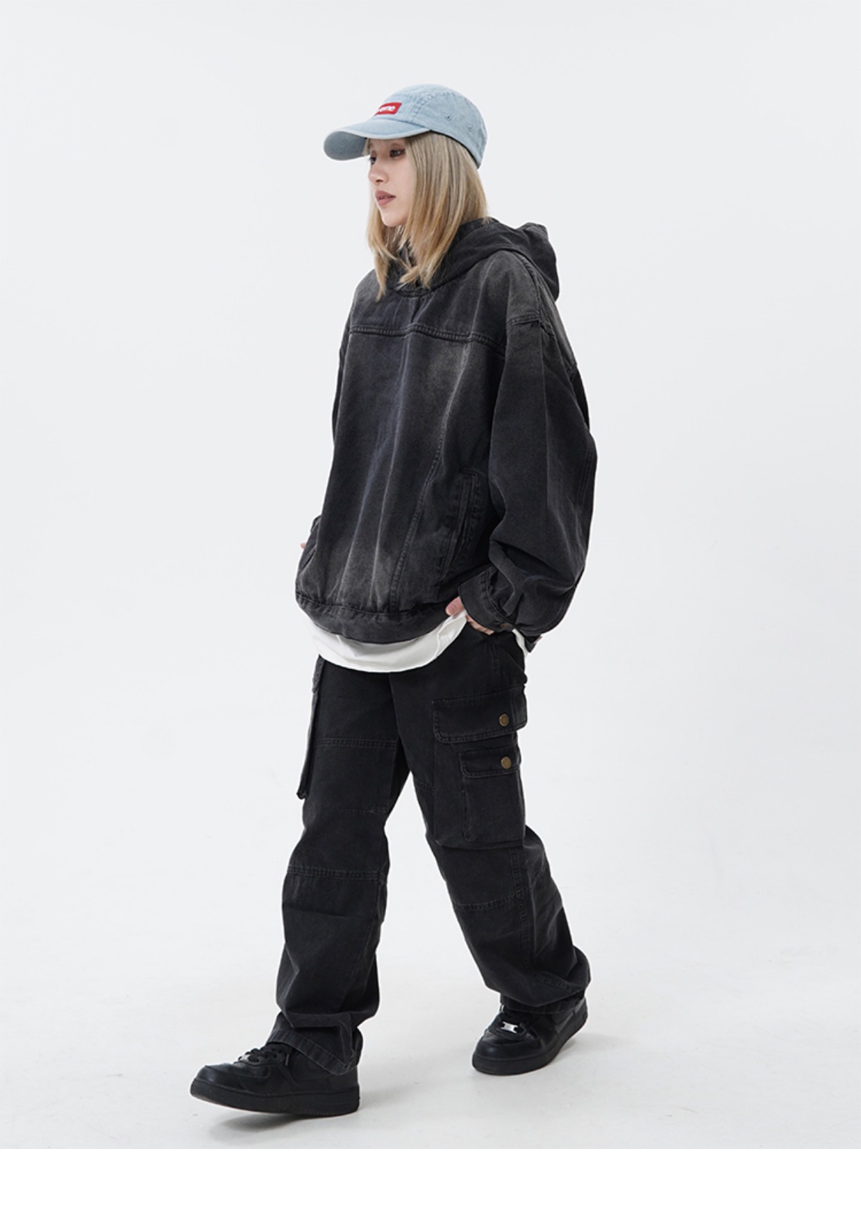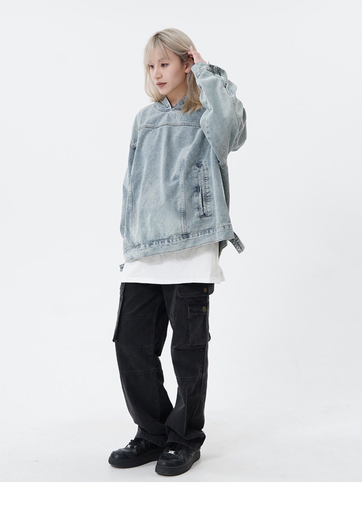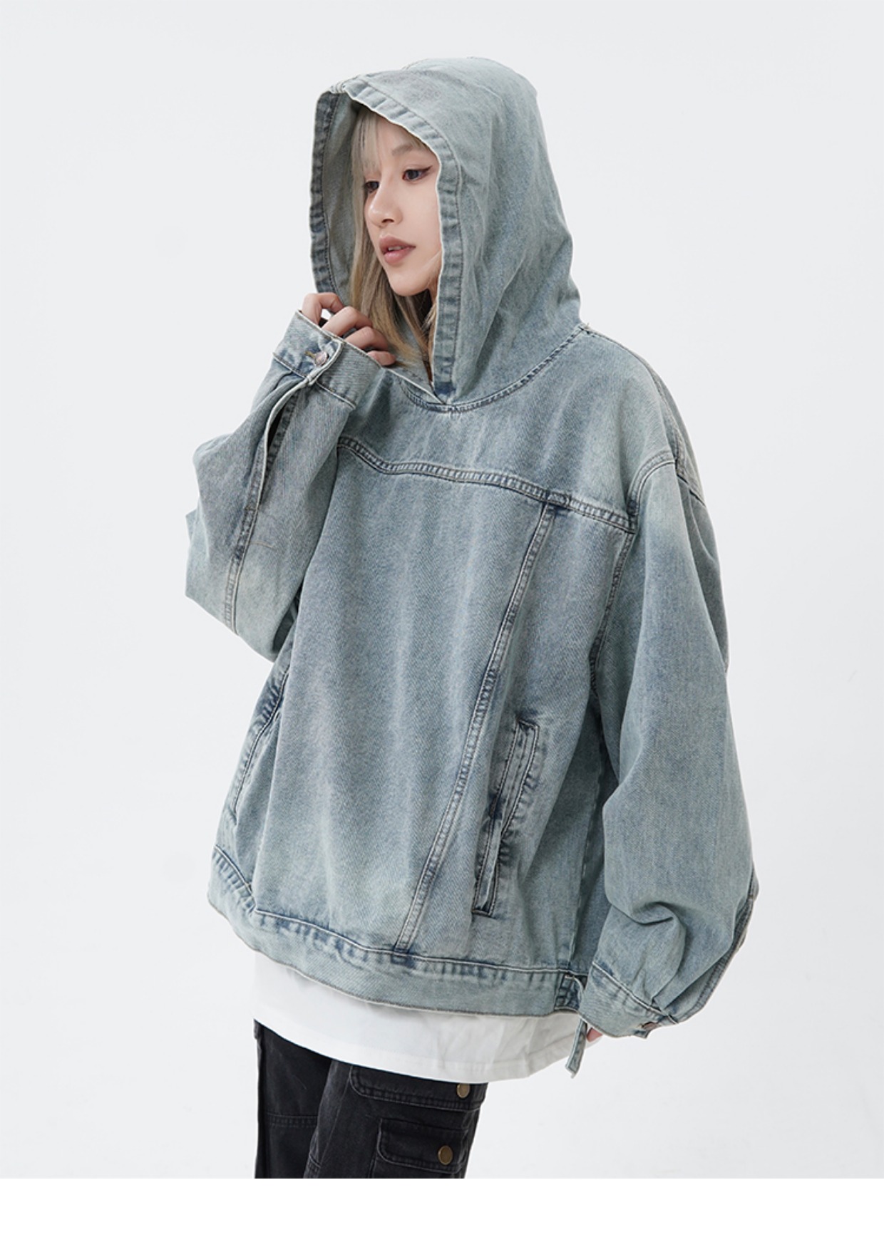 川川也家 原創設計美式高街牛仔連帽運動衫男女寬鬆情侶外套ins潮牌