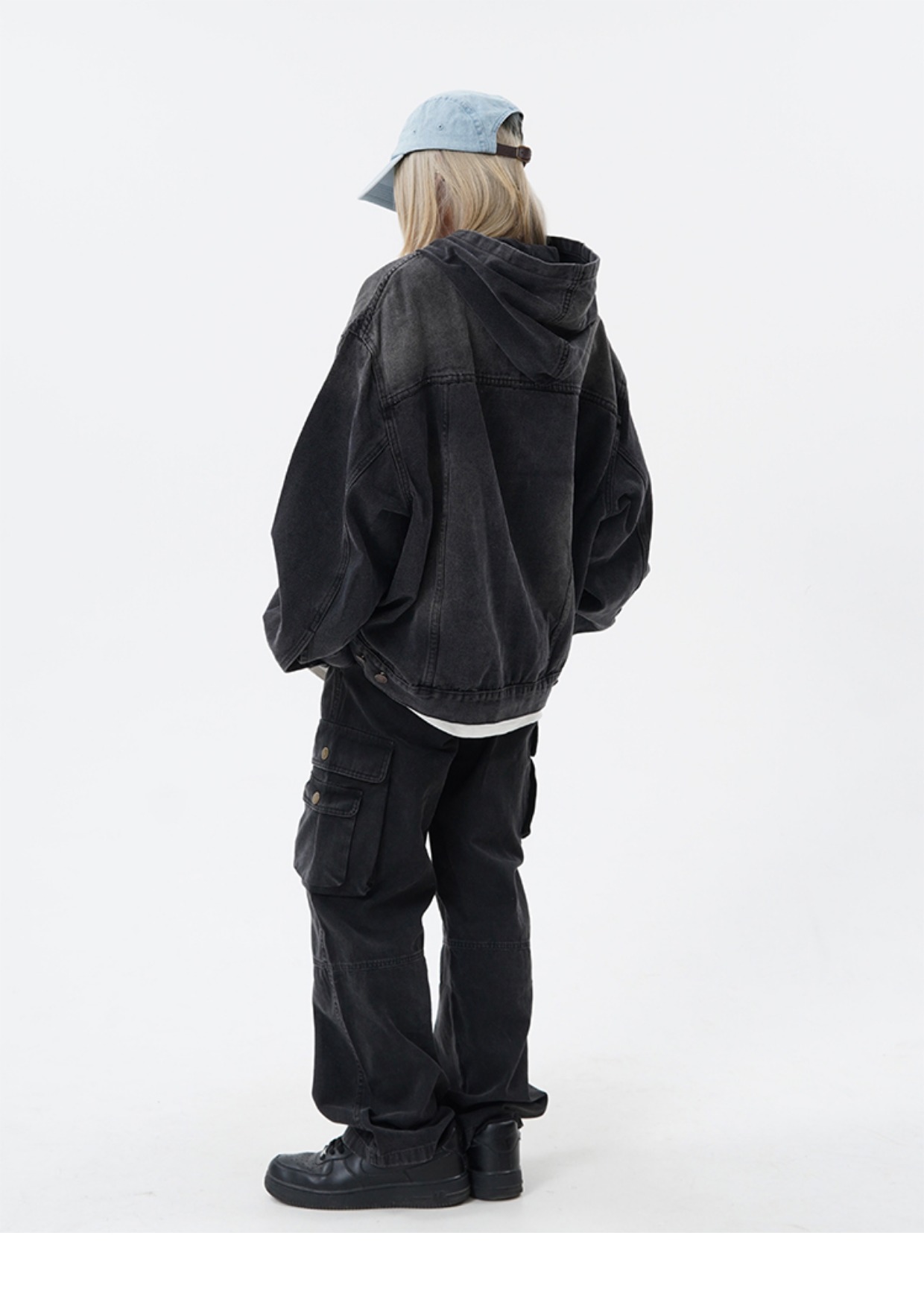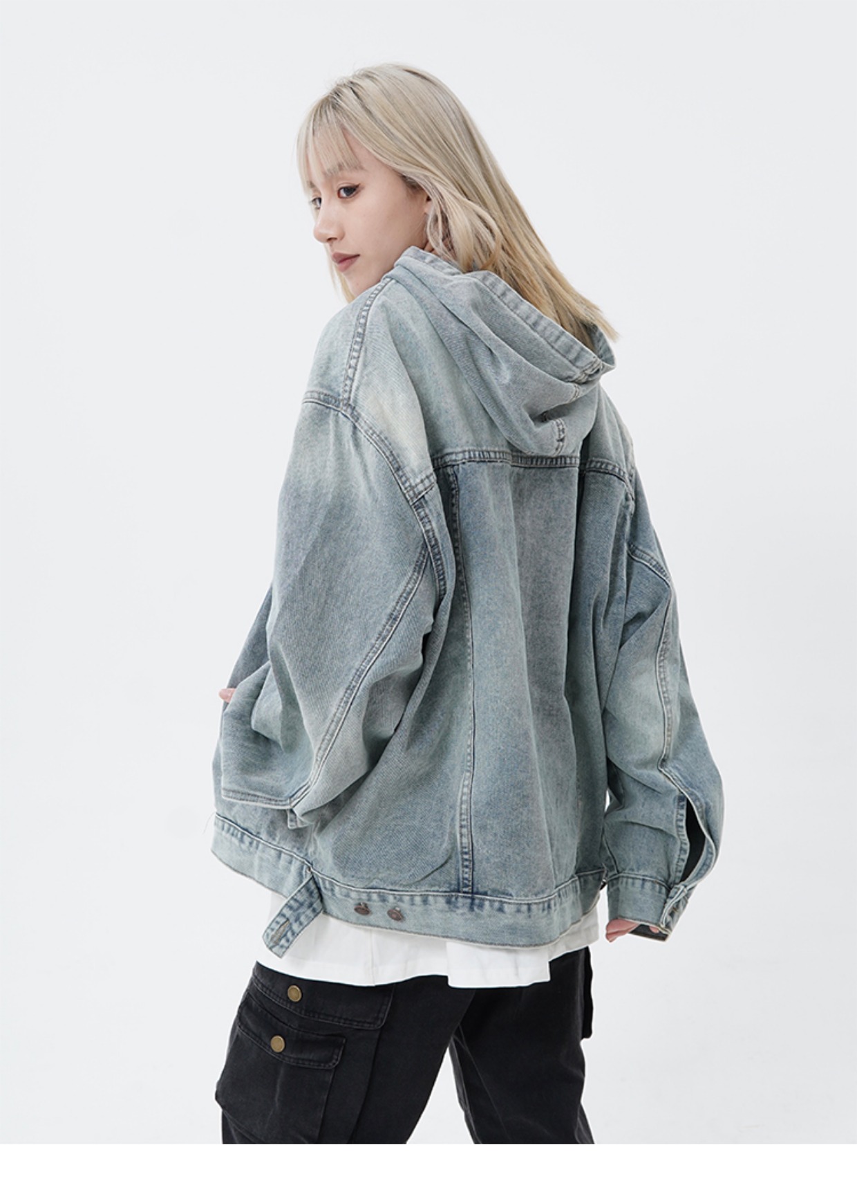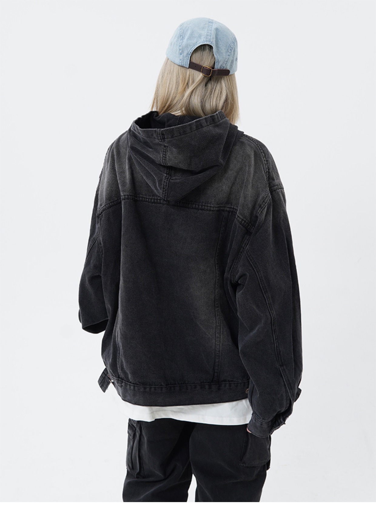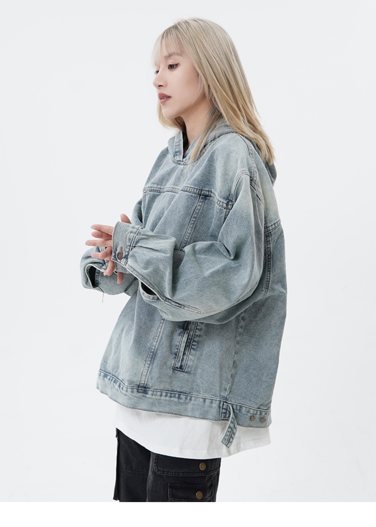 川川也家 原創設計美式高街牛仔連帽運動衫男女寬鬆情侶外套ins潮牌