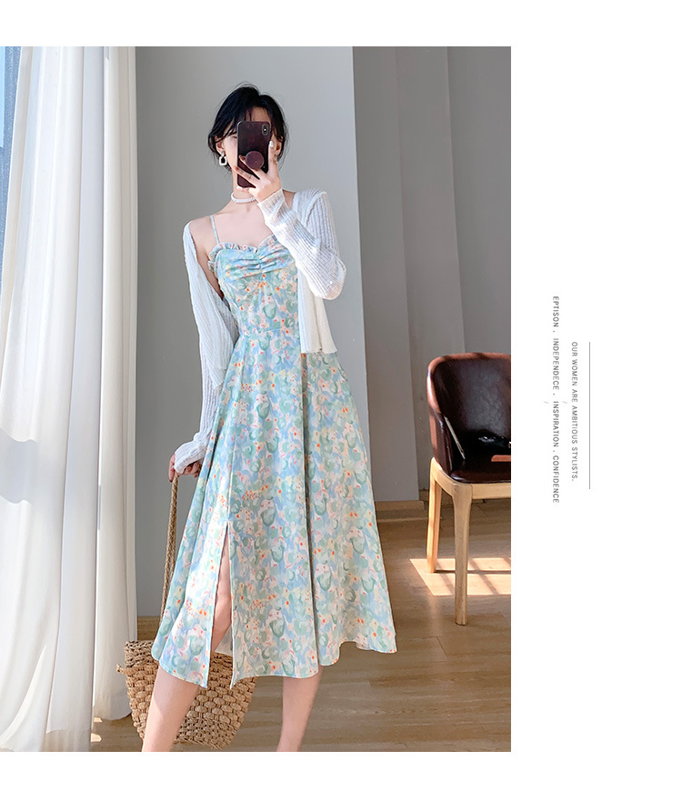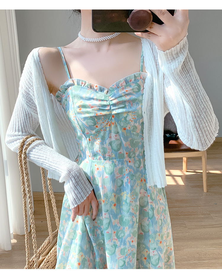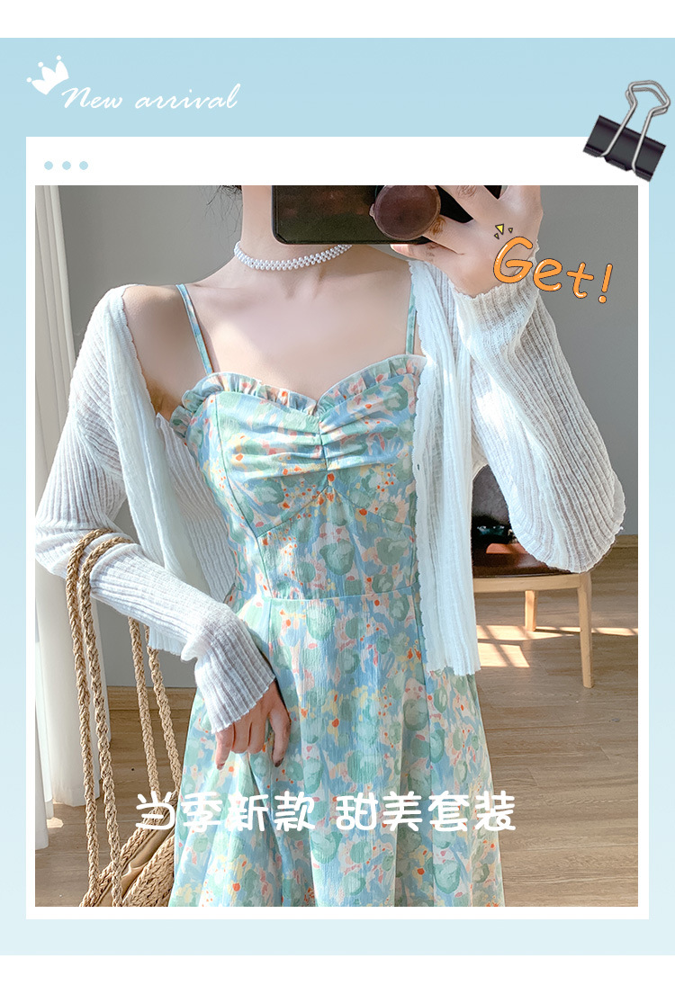 颜色 绿色碎花裙,白色针织