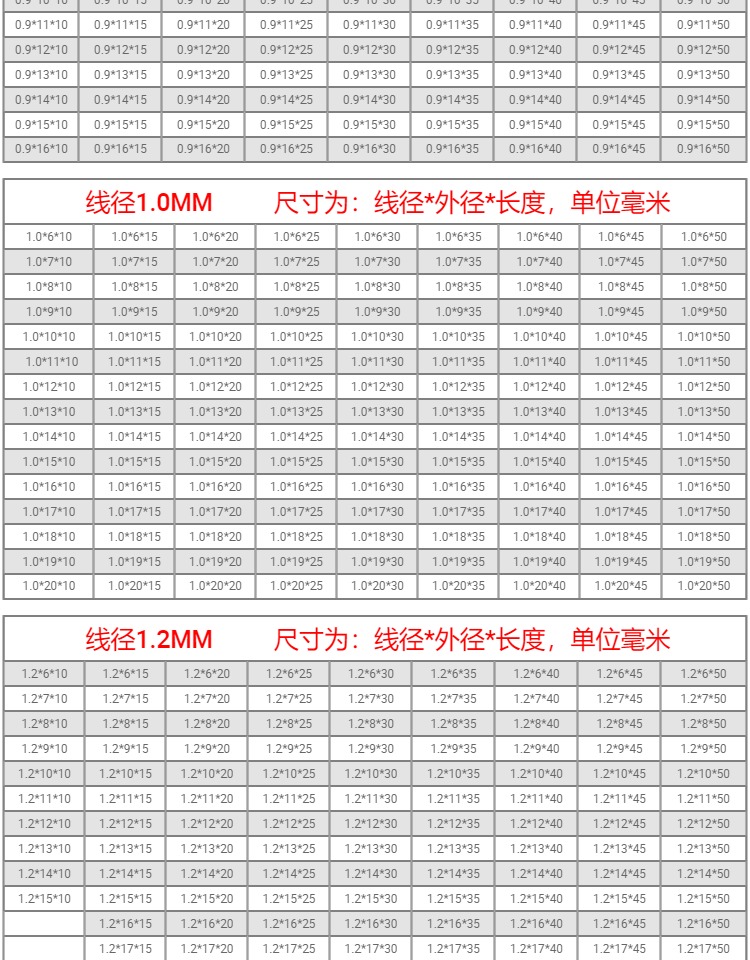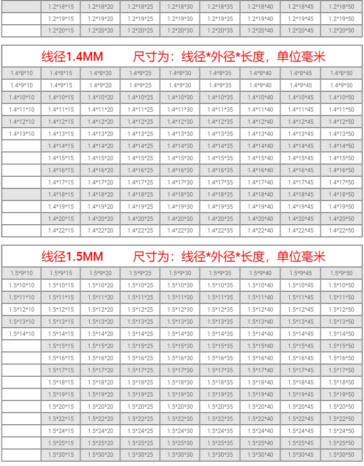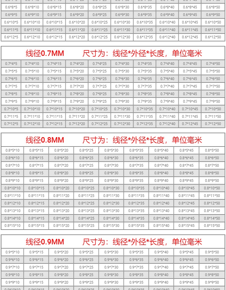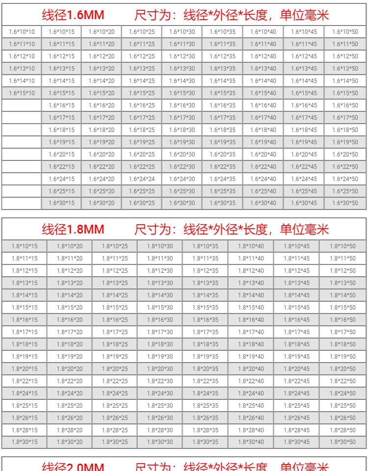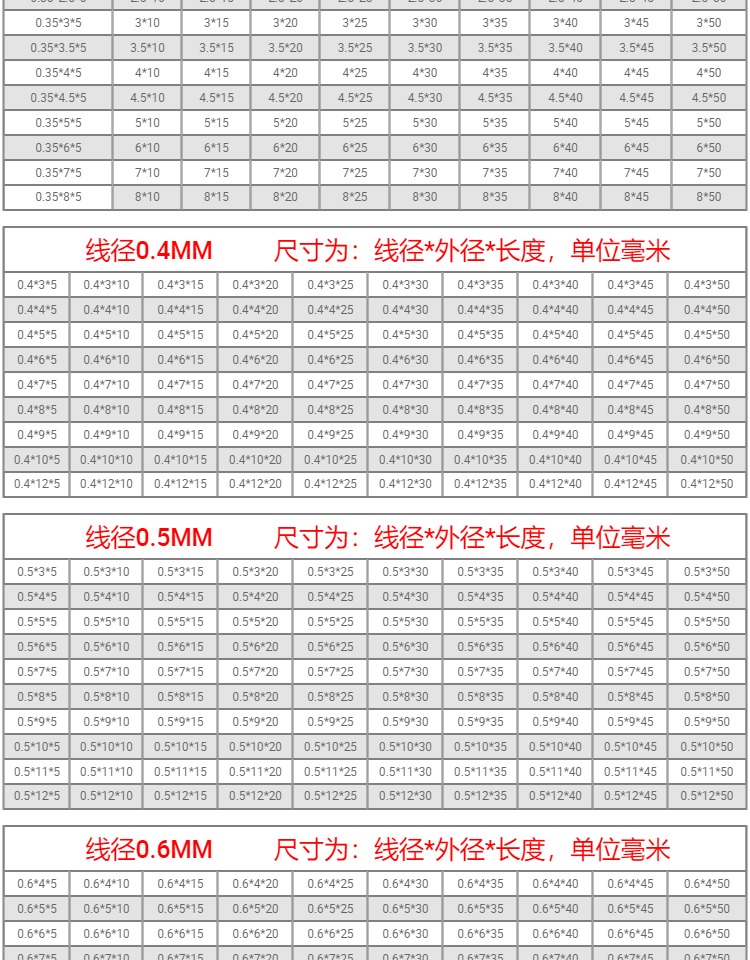 型号 线径0.2mm(一包10只),线径0.25mm(一包10只),线径0.3mm(一包10只),线径0.35mm(一包10只),线径0.4mm(一包10只),线径0.45mm(一包10只),线径0.5mm(一包10只),线径0.6mm(一包10只),线径0.7mm(一包10只),线径0.8mm(一包10只),线径0.9mm(一包10只),线径1.0mm(一包10只),线径1.2mm(一包10只),线径1.4mm(一包10只),线径1.5mm(一包10只),线径1.6mm(一包10只),线径1.8mm(一包10只),线径2.0mm(一包10只),0.2*2*10(5只),注意!!拍下请备注尺寸规格,商品详情里有规格表,其他金额||定做专拍,定做专拍(请拍总金额)