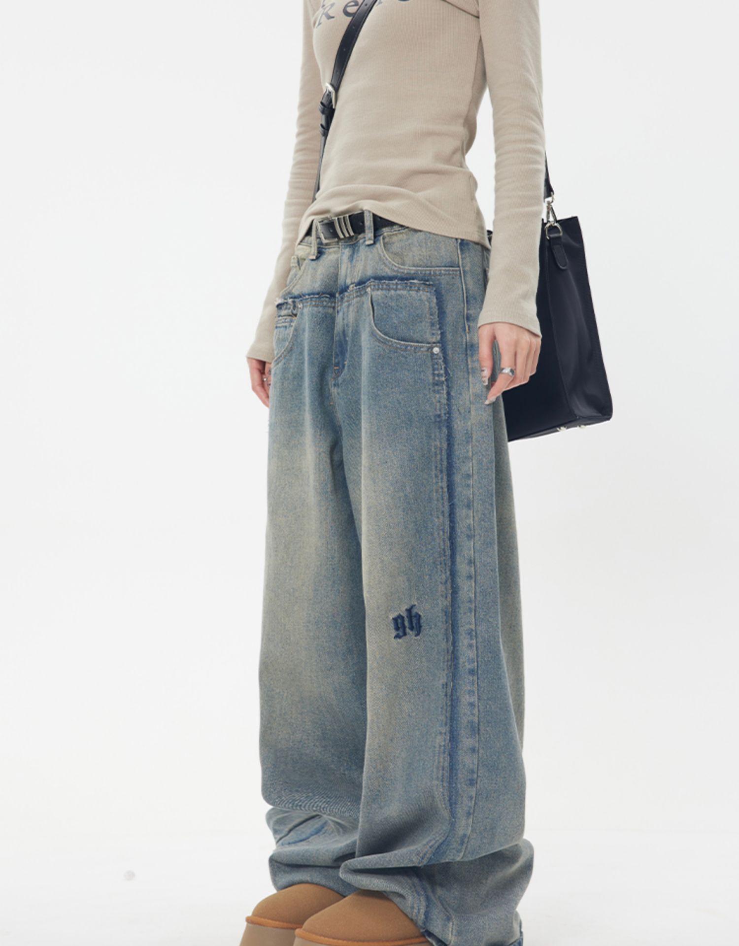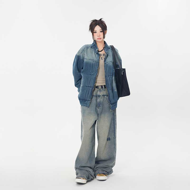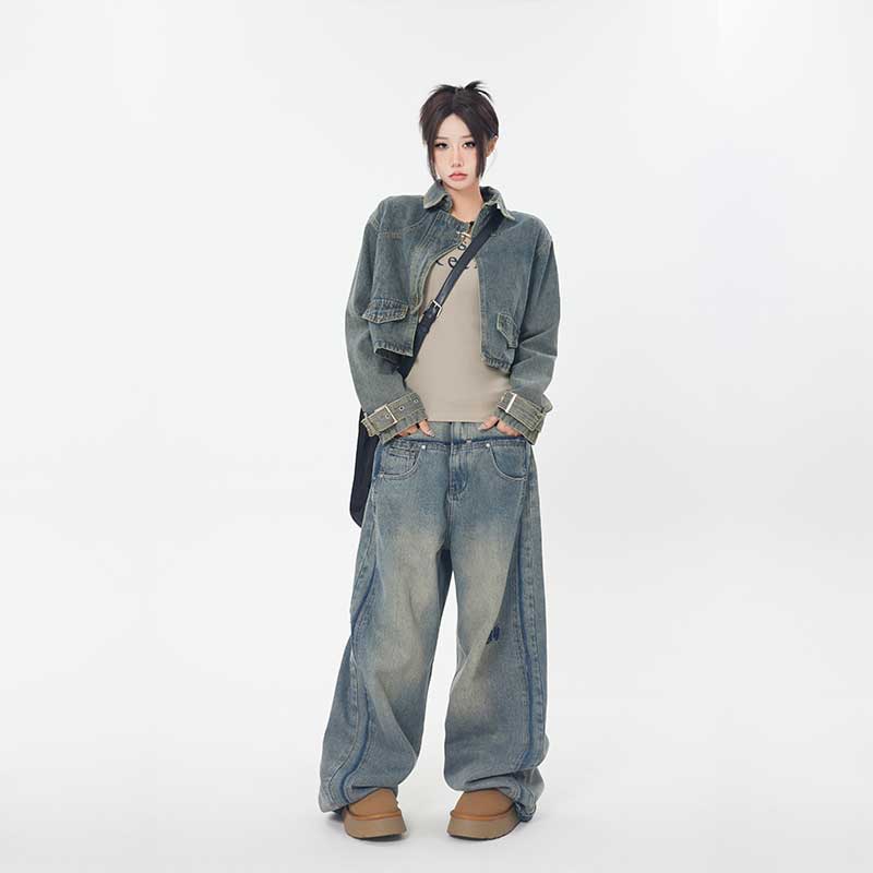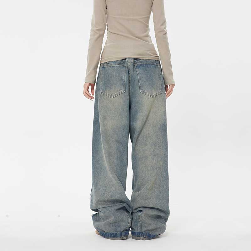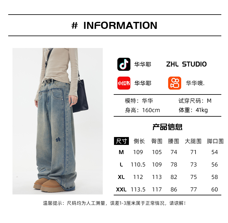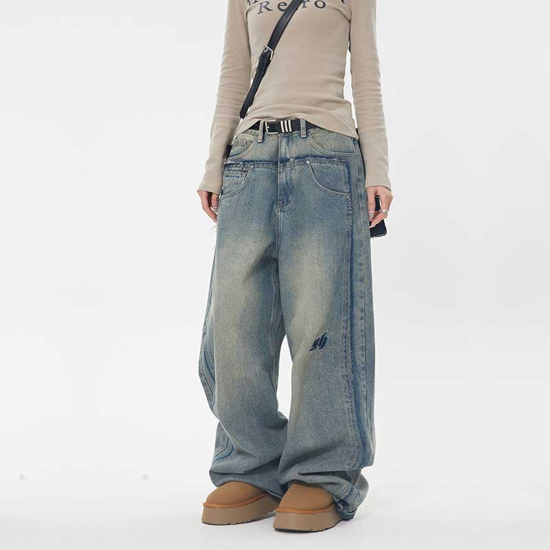 ZHL STUDIO 美式復古水洗磨白牛仔褲女春新款高腰顯瘦直筒寬褲