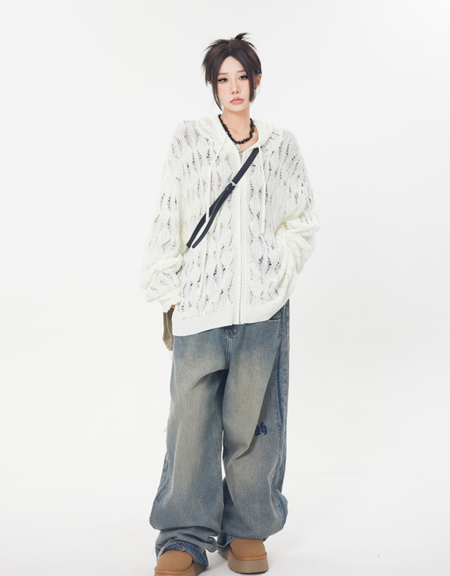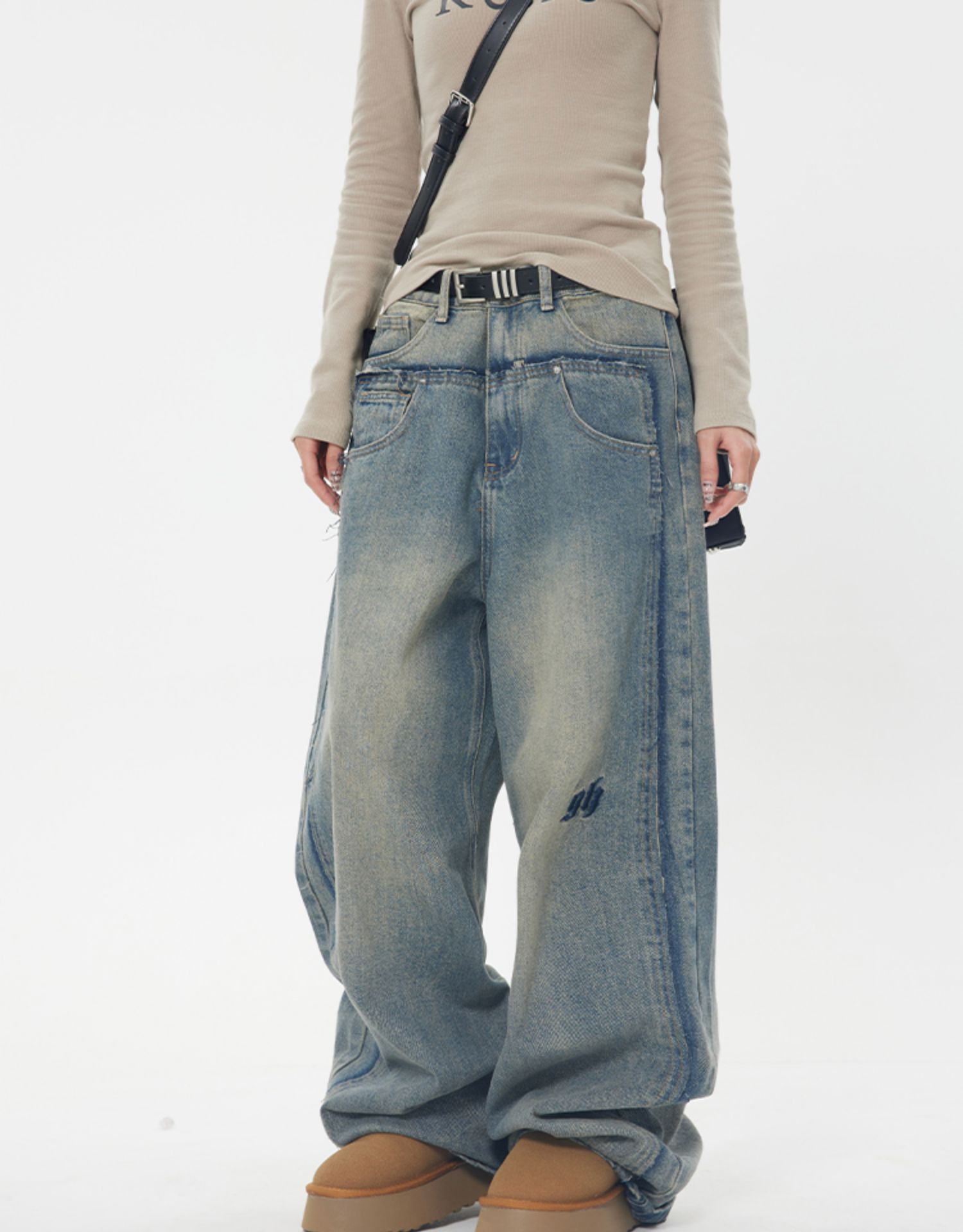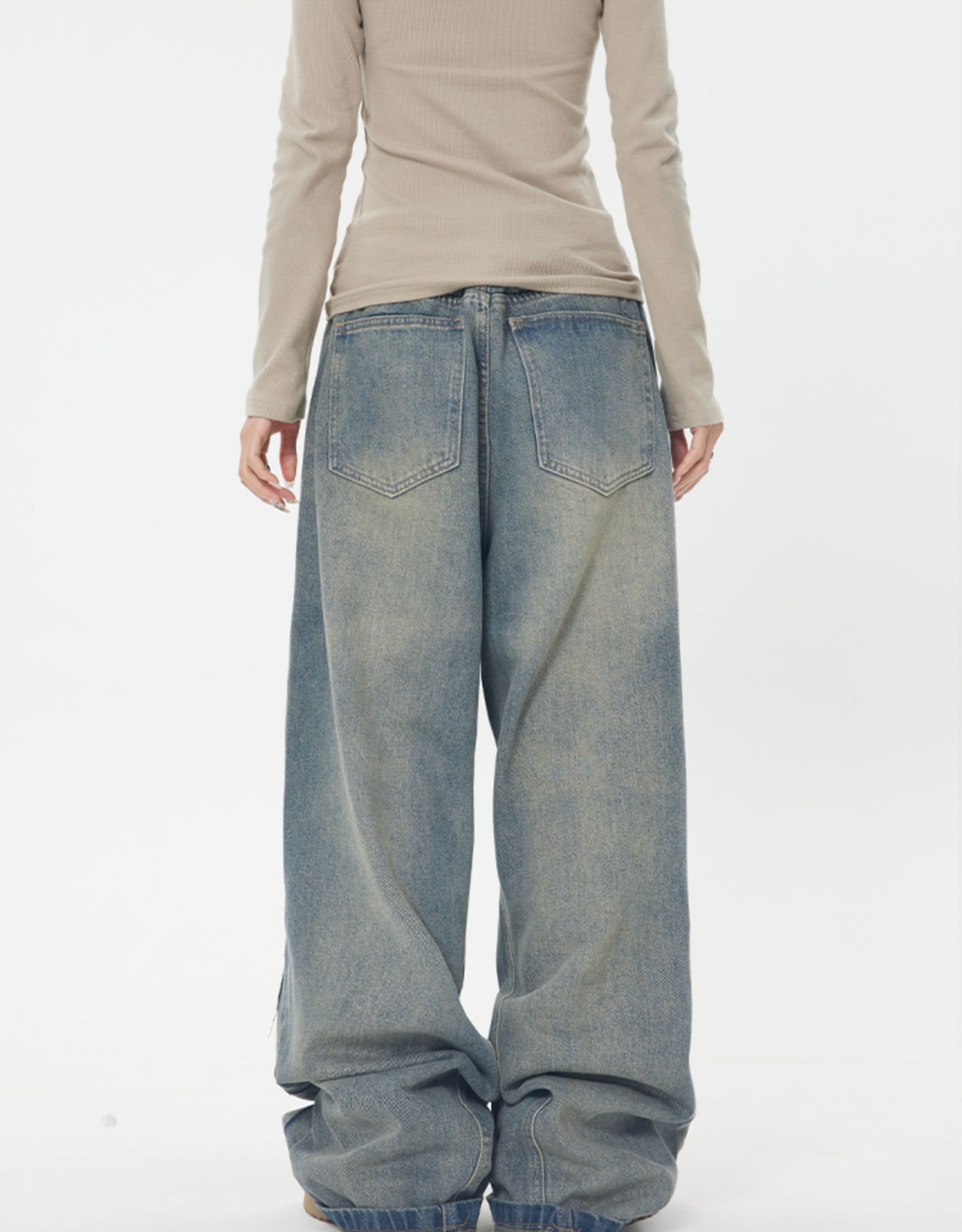 ZHL STUDIO 美式復古水洗磨白牛仔褲女春新款高腰顯瘦直筒寬褲