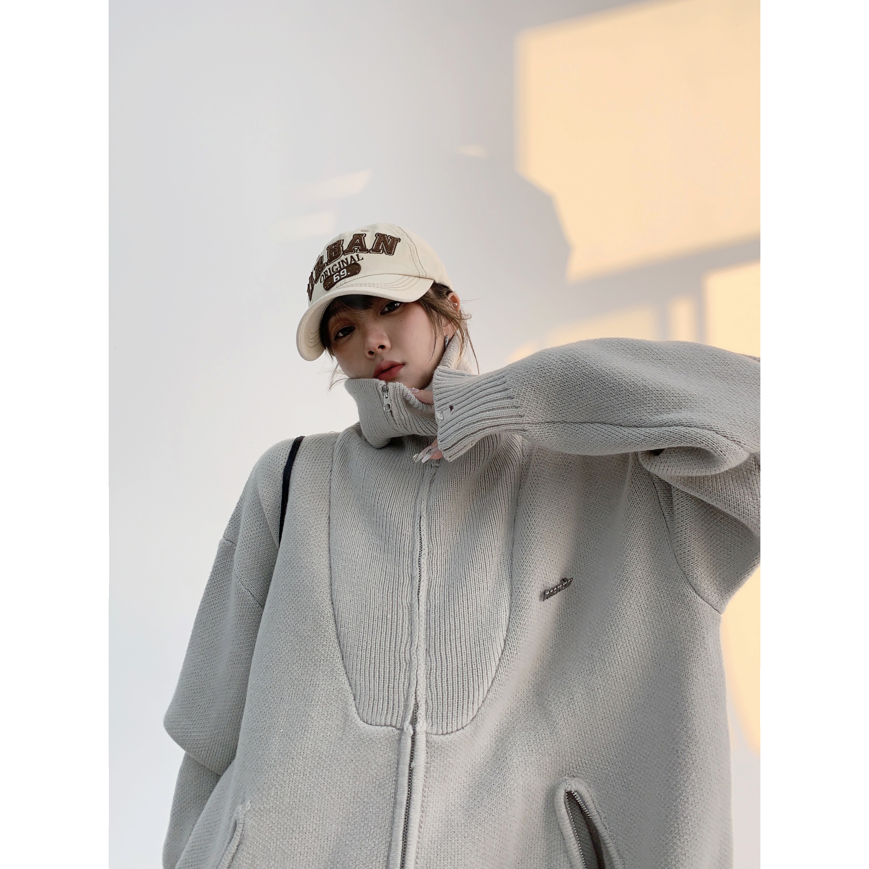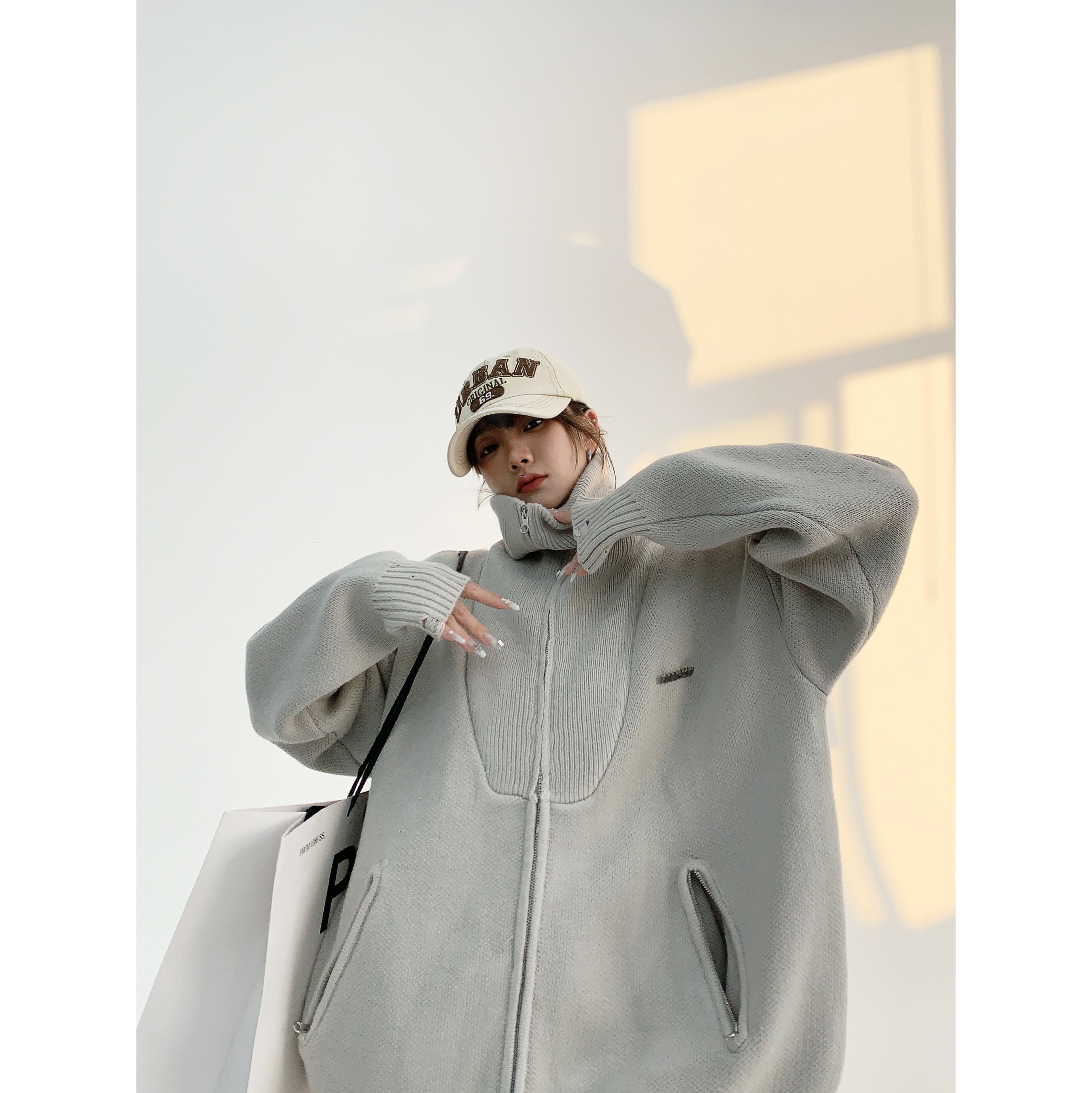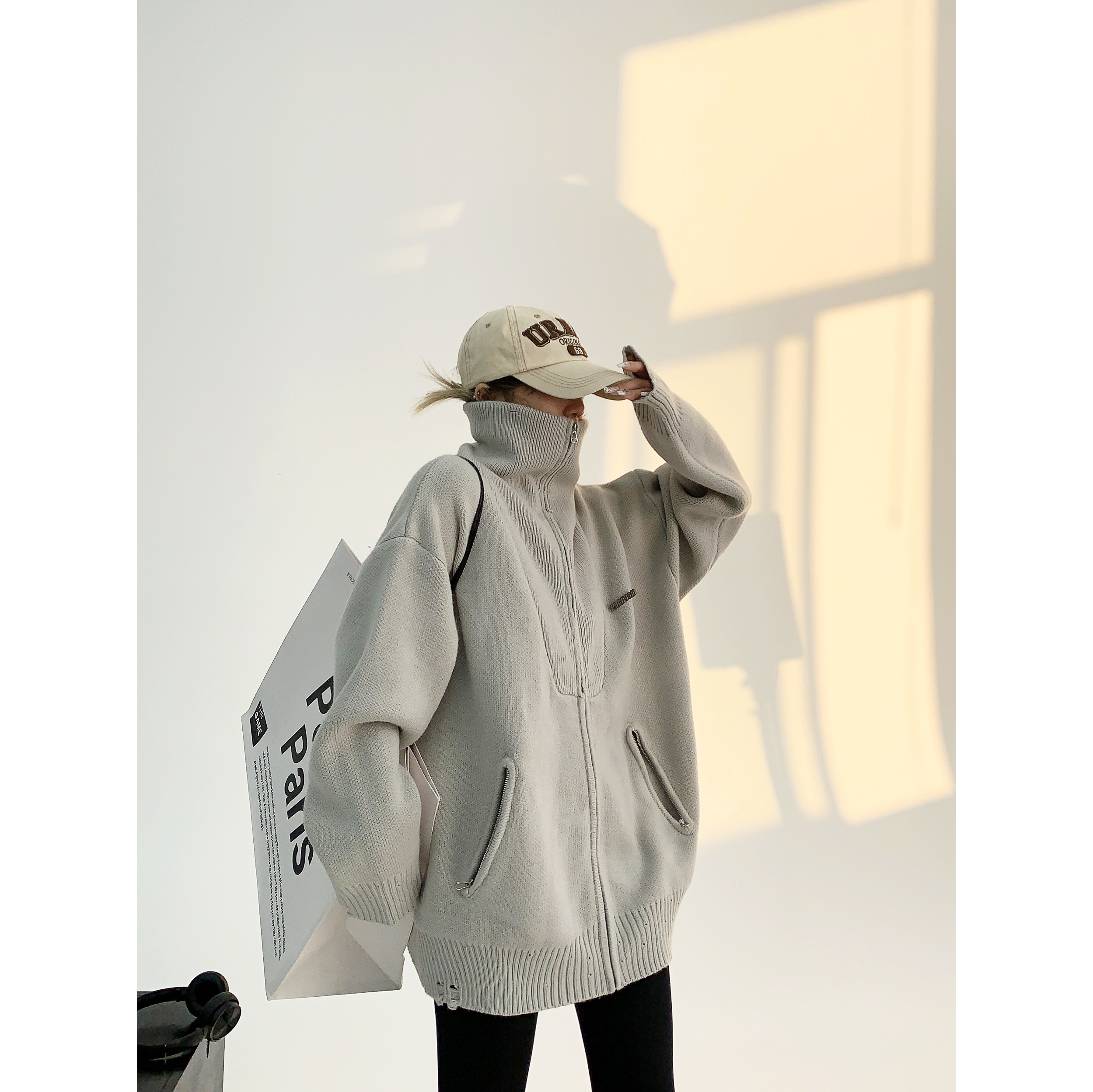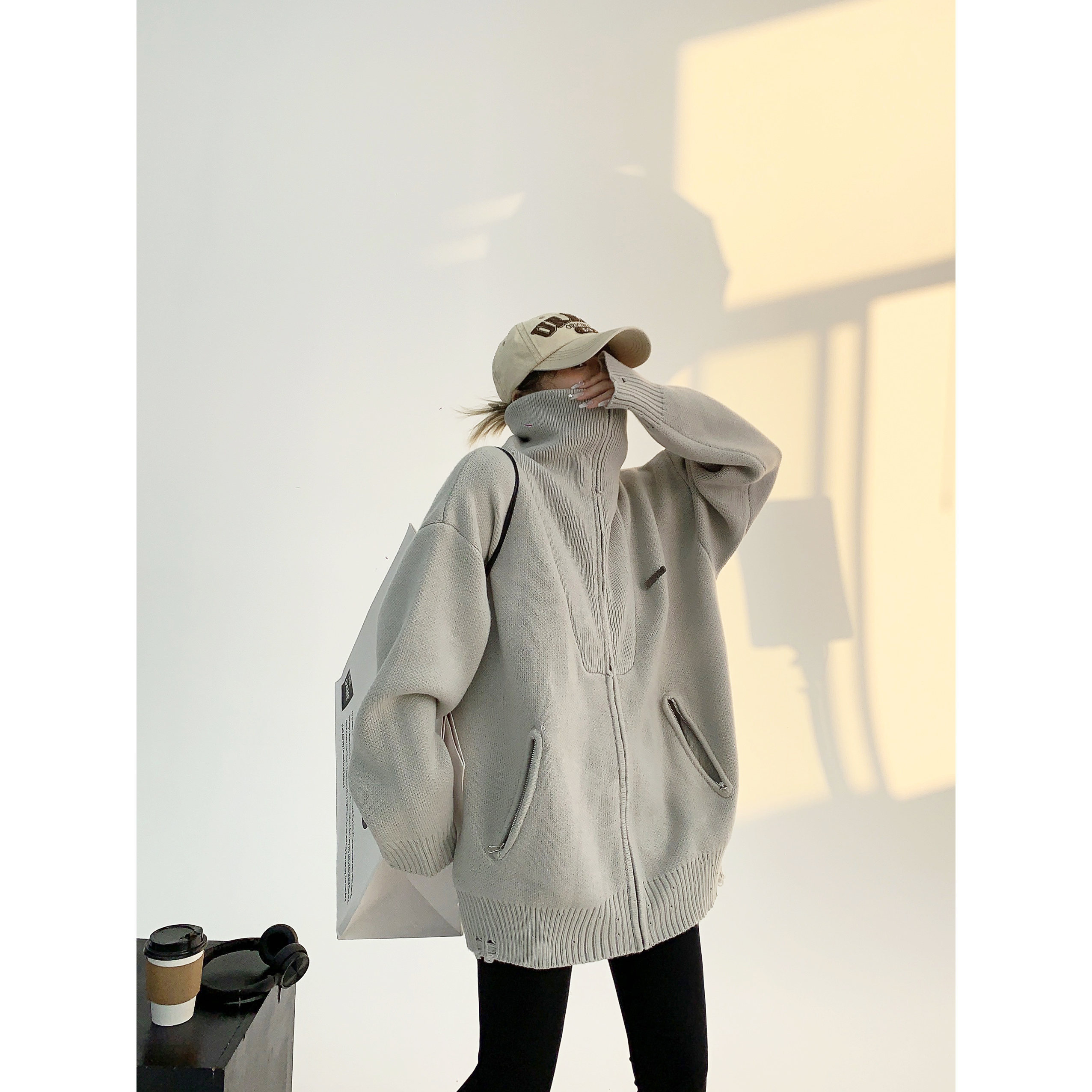 廢柴冬季美式高級感加厚高領毛衣外套寬鬆設計感重磅拉鍊開衫女潮