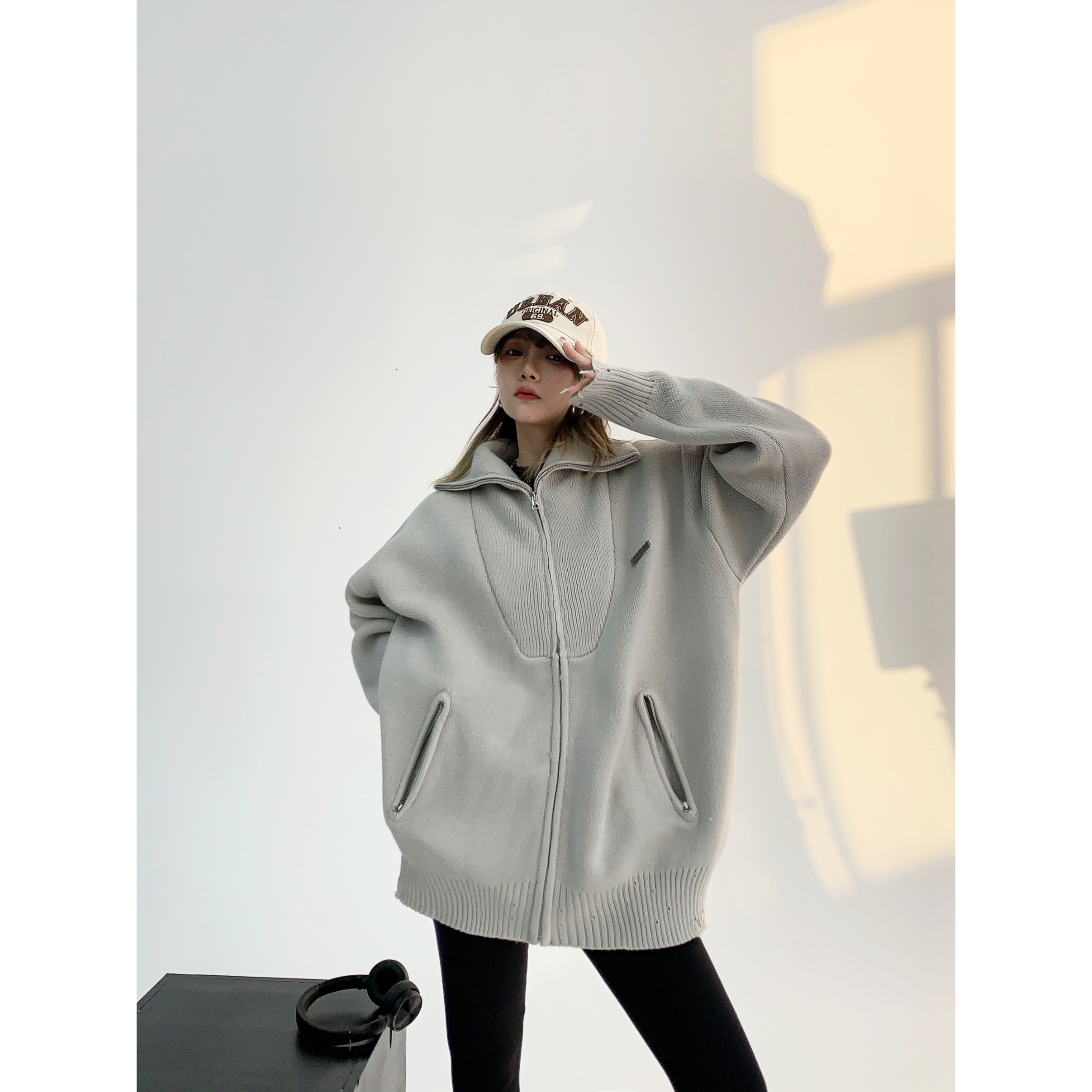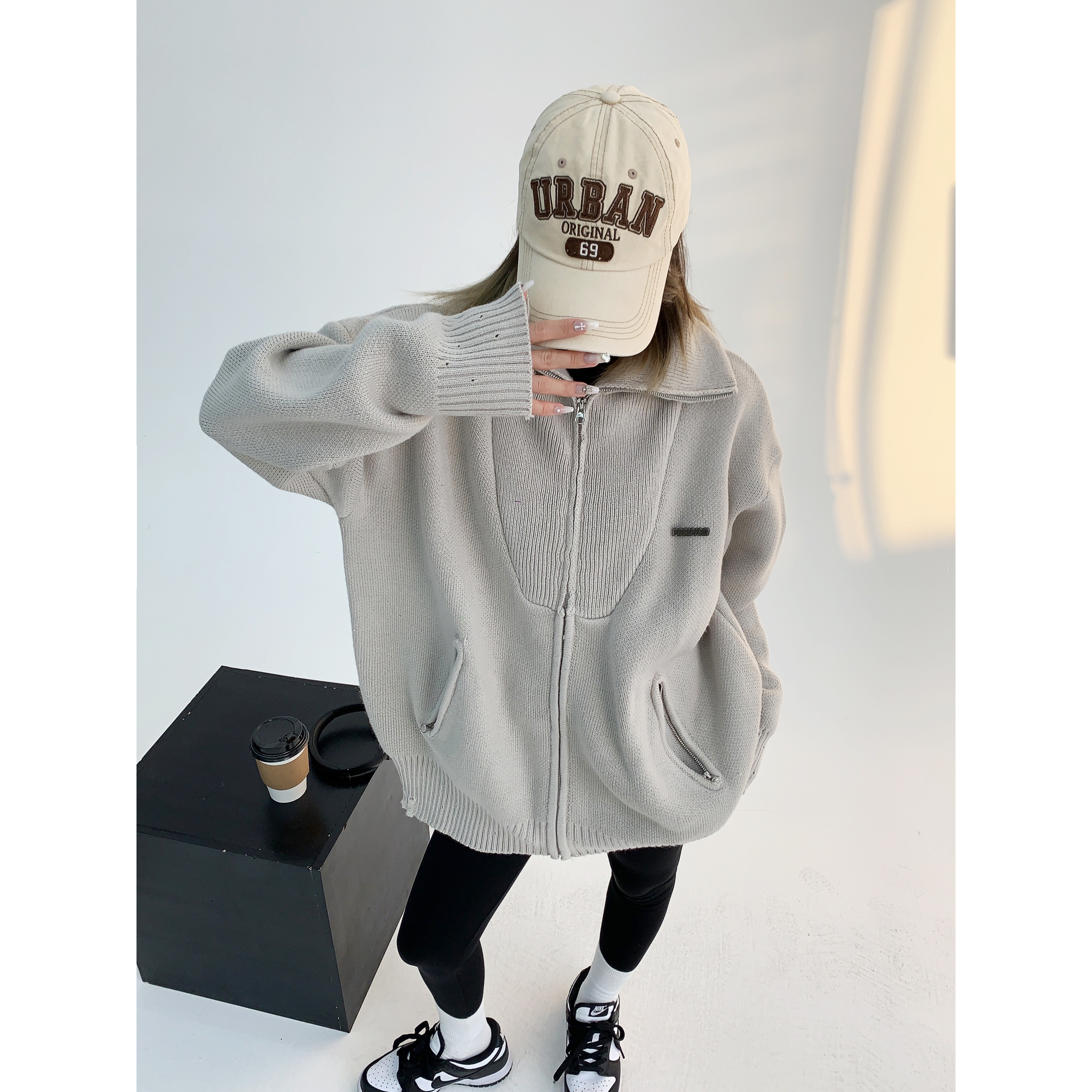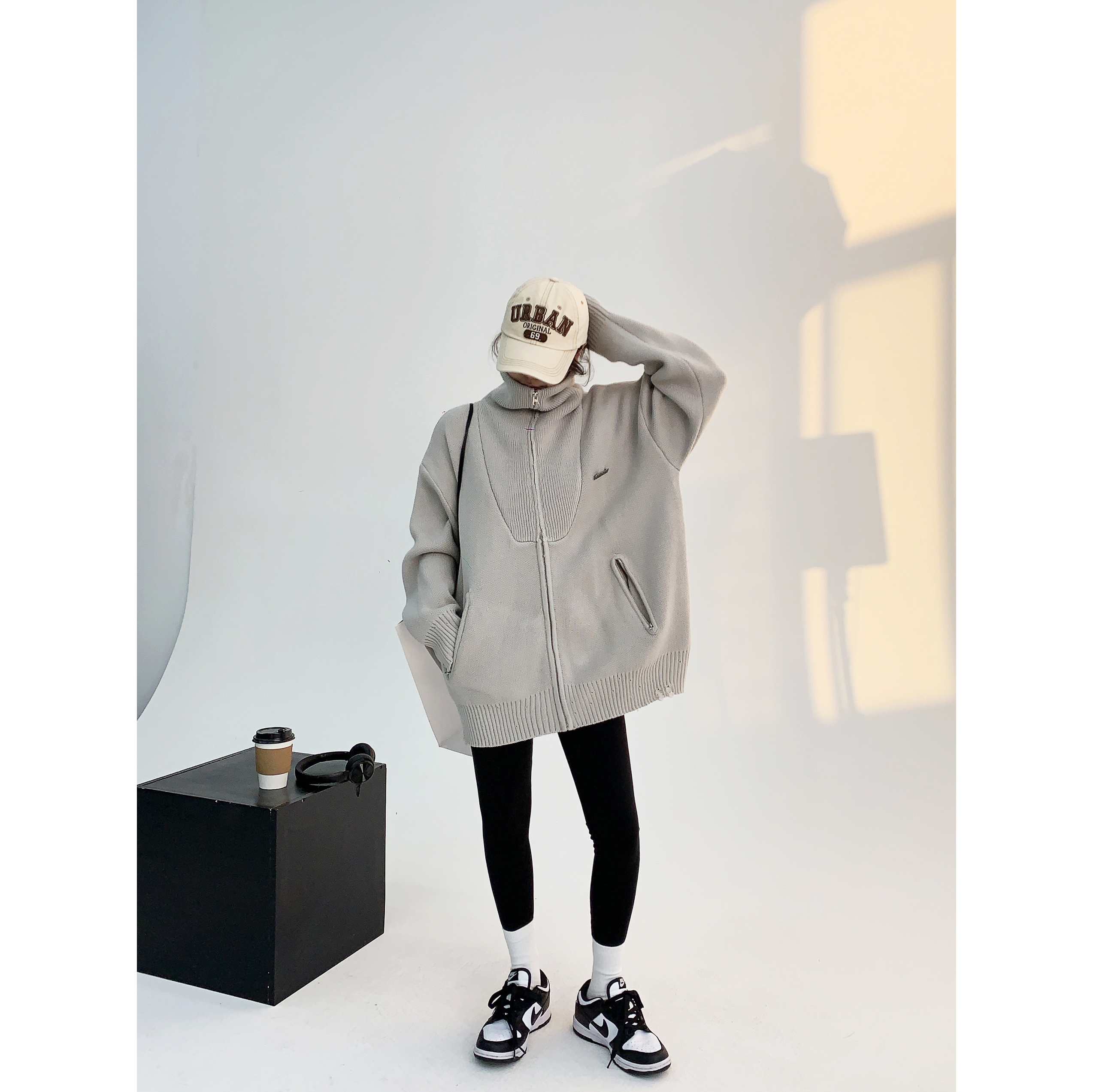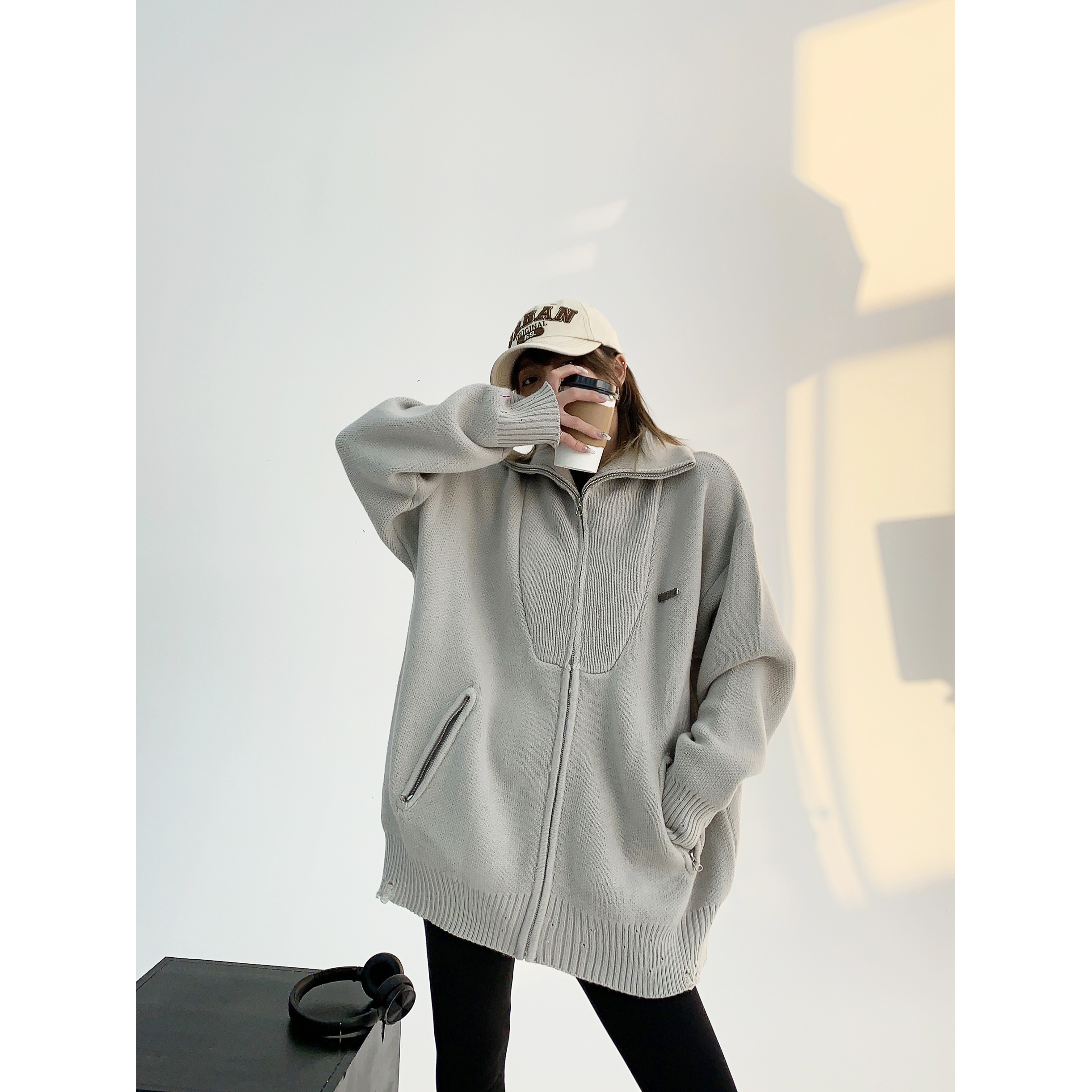廢柴冬季美式高級感加厚高領毛衣外套寬鬆設計感重磅拉鍊開衫女潮