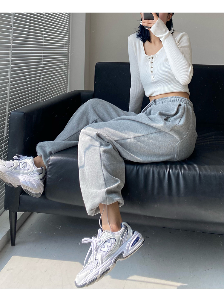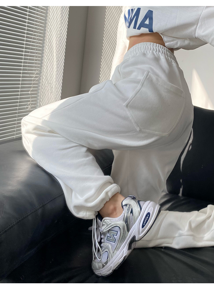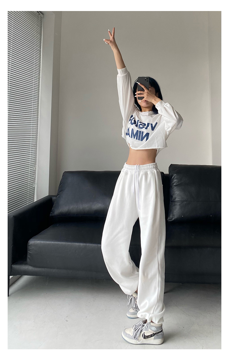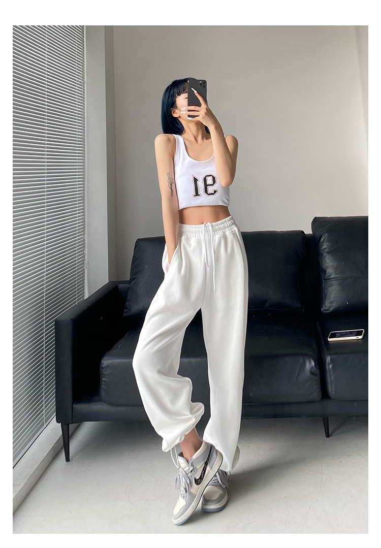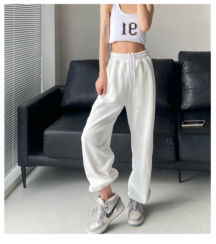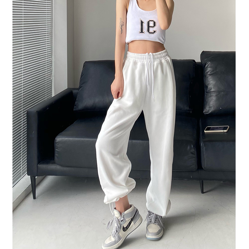 春秋季束腳運動褲女高腰寬鬆顯瘦闊腿直筒休閒美式白色衛褲夏