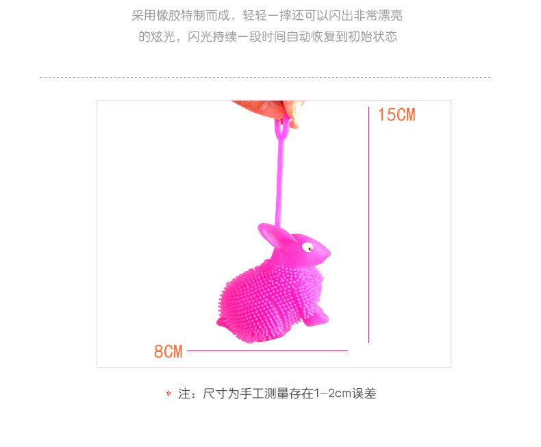 轻轻一摔还可以闪出非常漂亮的炫光,闪光持续一段时间自动恢复到初始状态。球身带着一条弹力小绳子,绳子的终端还有一个圆圈,正好可以套到宝宝得小手腕上(或手指),或者拿在手里也方便哦,用力把小球甩出去,不但很快能弹回来,而且还能闪七彩光,真是炫极了!