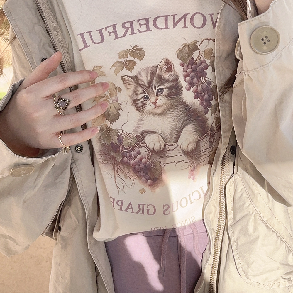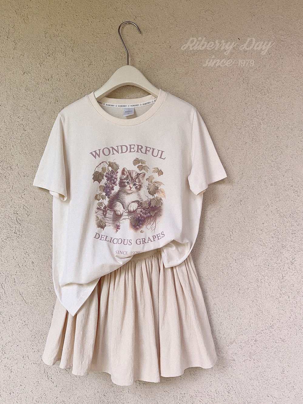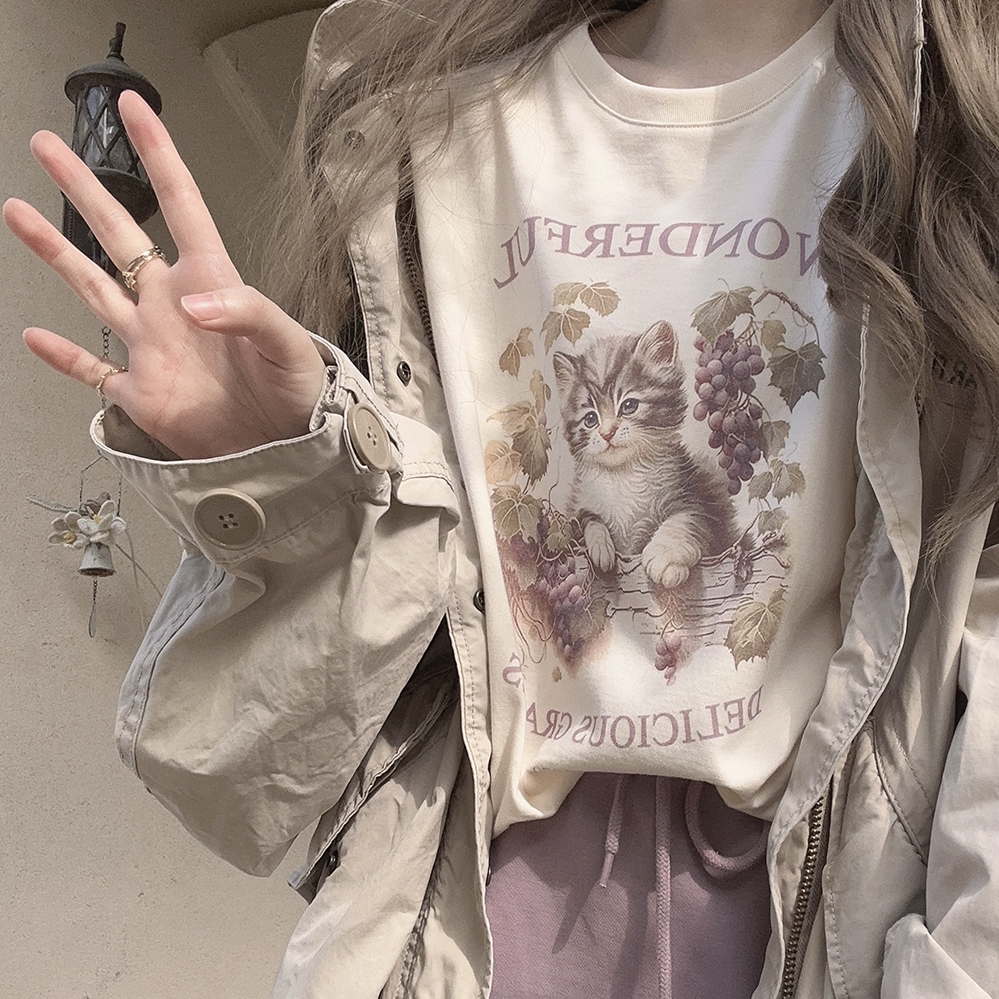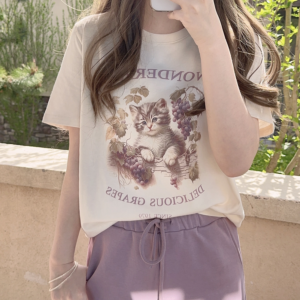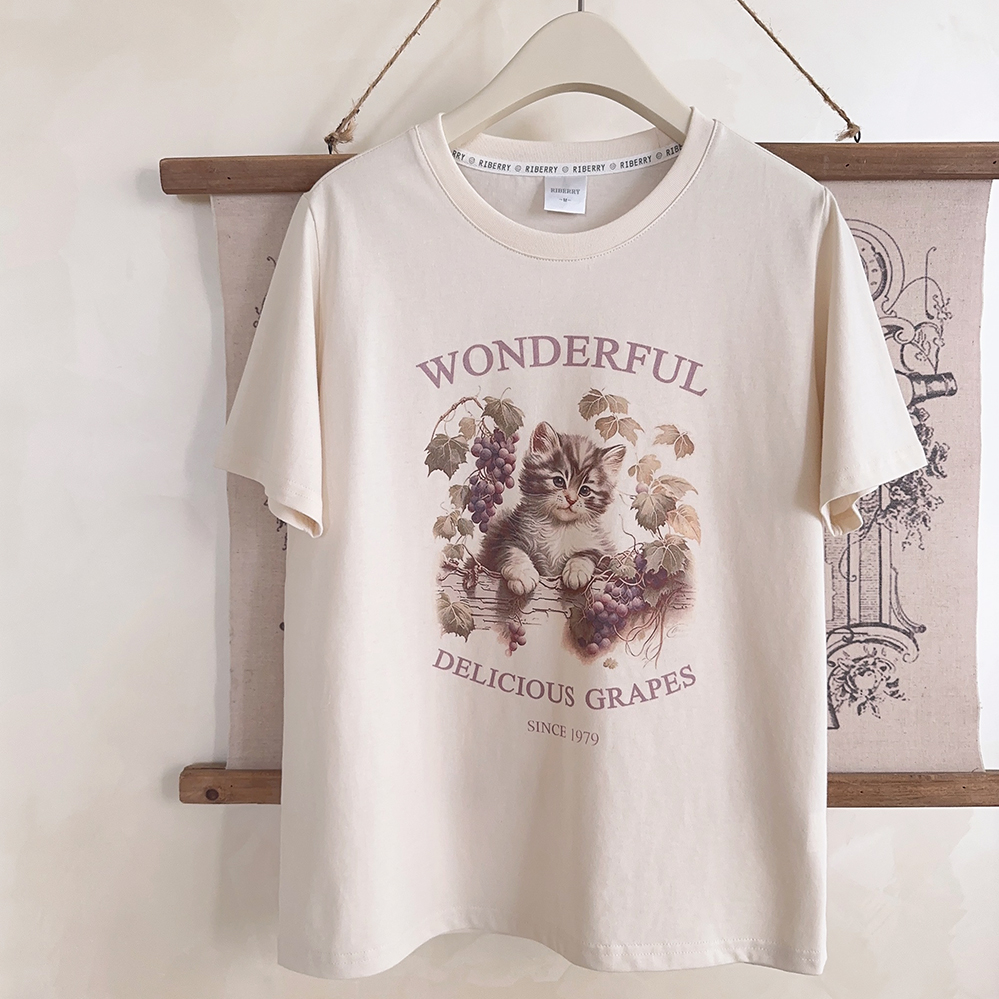 復古田園 葡萄貓咪 米色 顯瘦正肩 圓領 短袖T恤 U