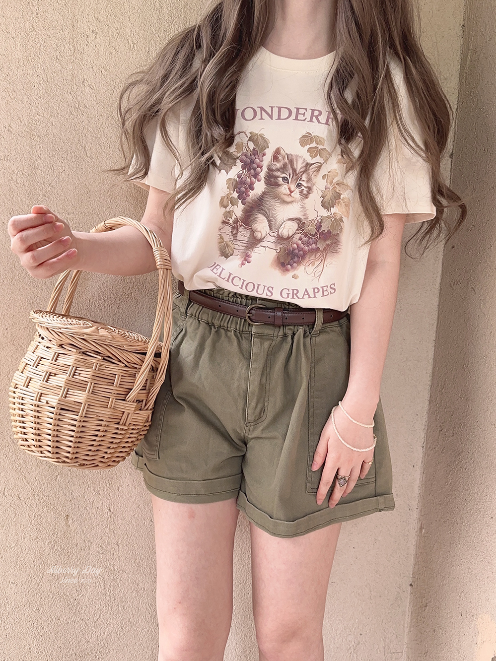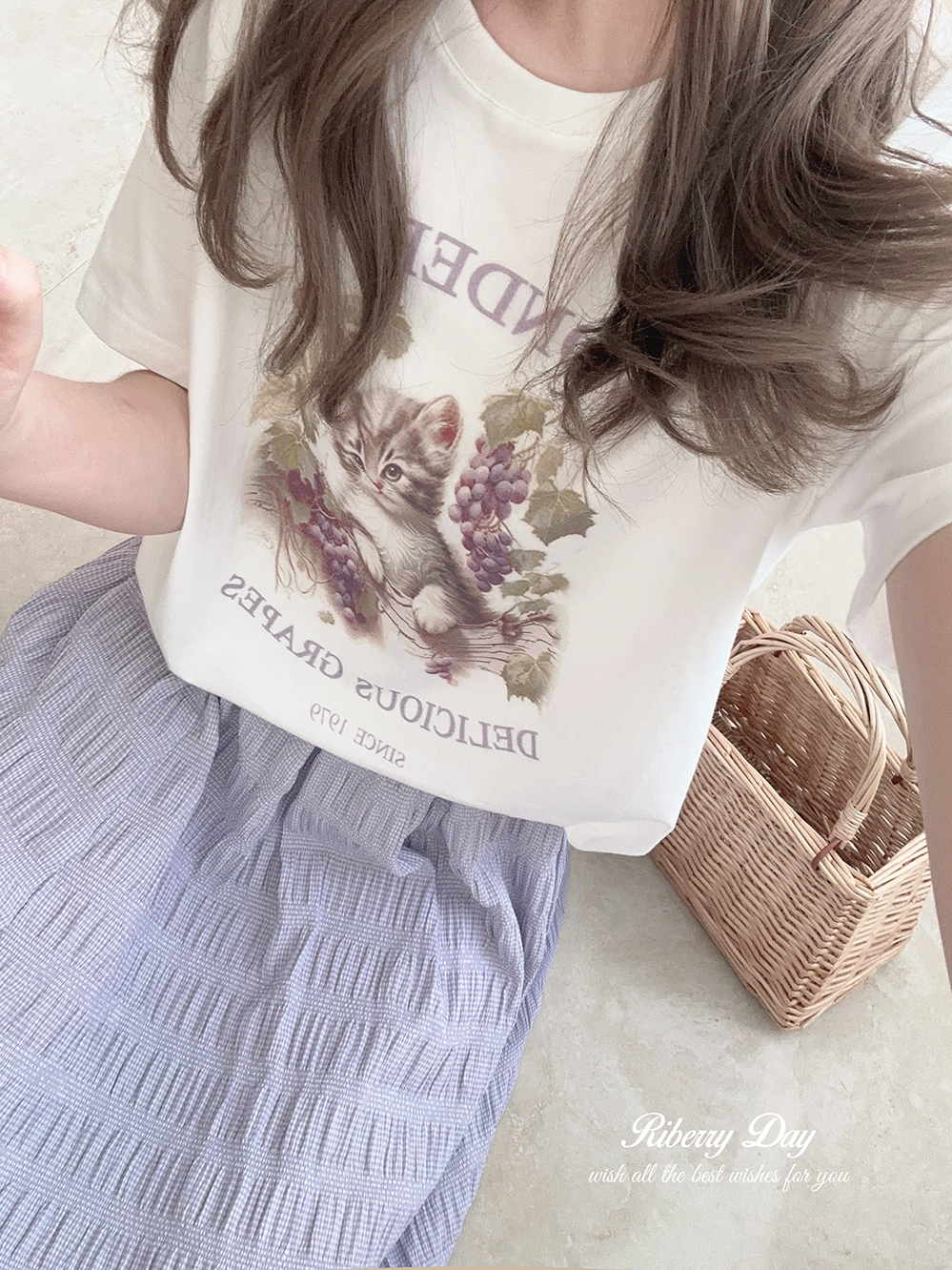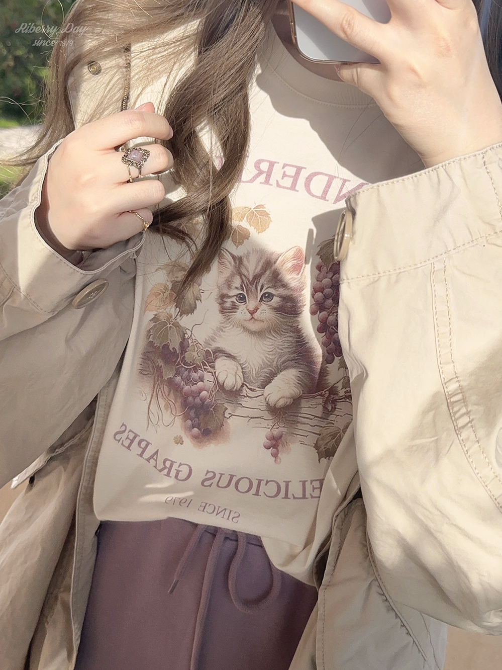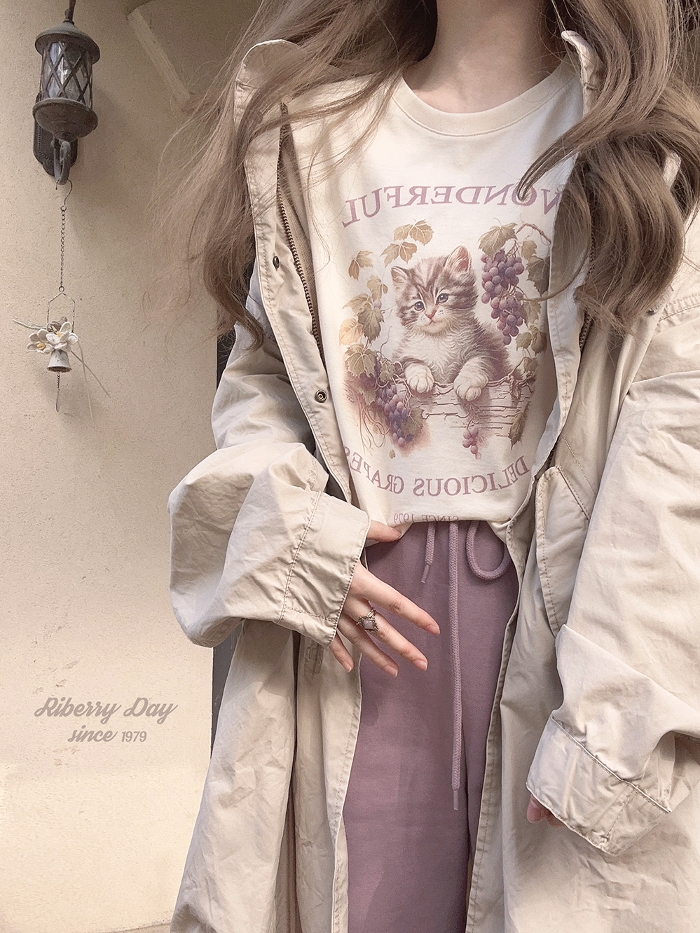 復古田園 葡萄貓咪 米色 顯瘦正肩 圓領 短袖T恤 U