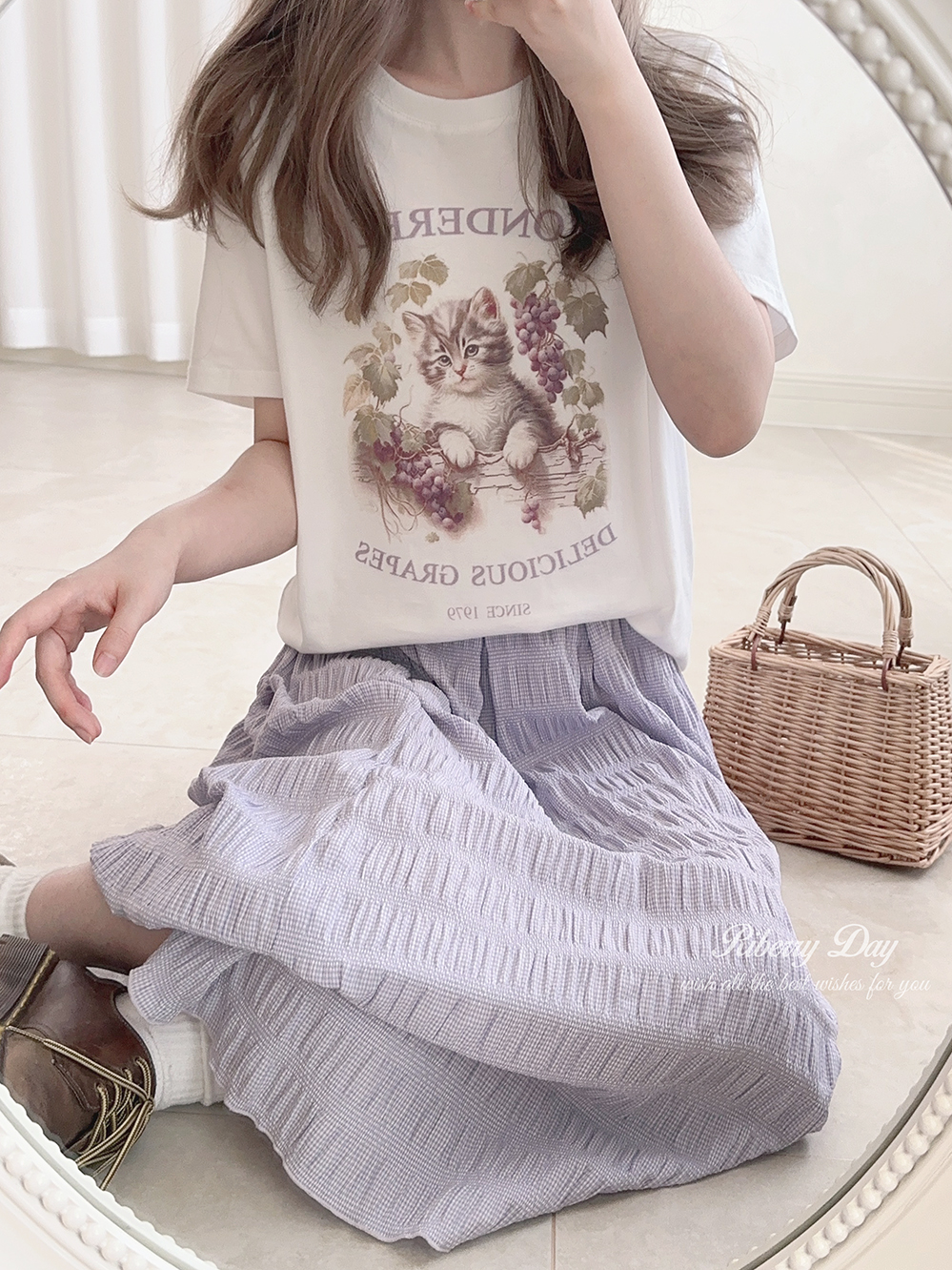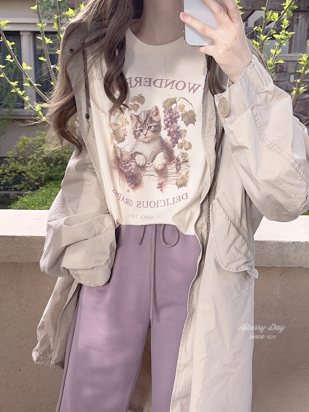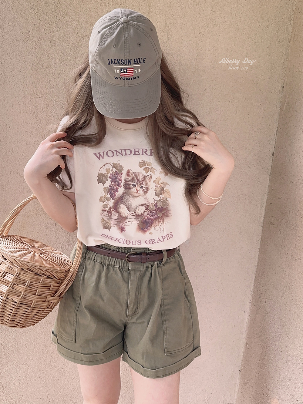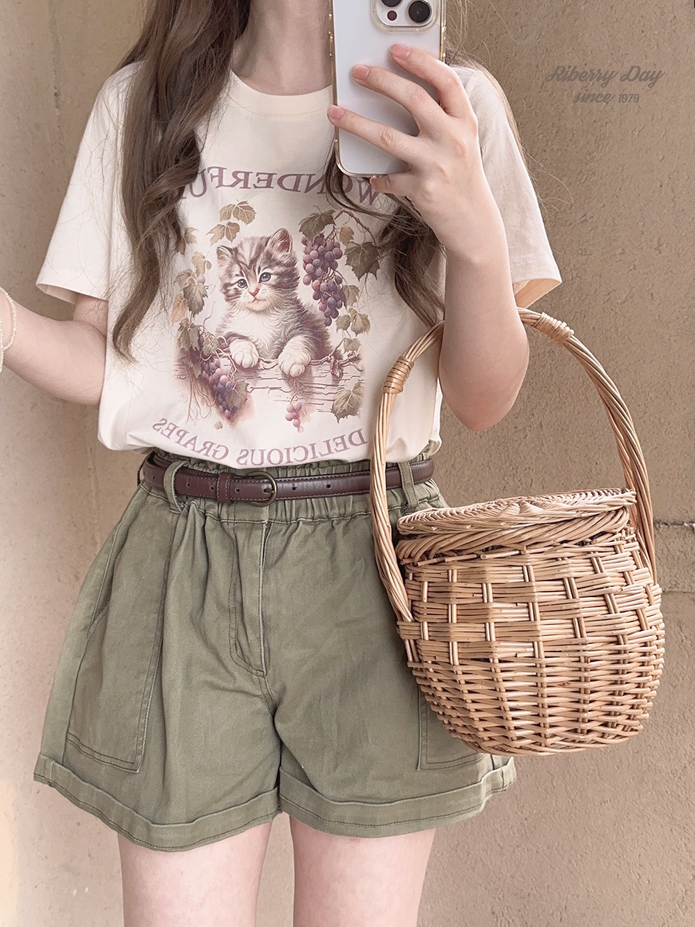 復古田園 葡萄貓咪 米色 顯瘦正肩 圓領 短袖T恤 U