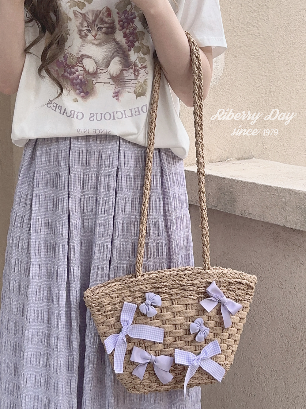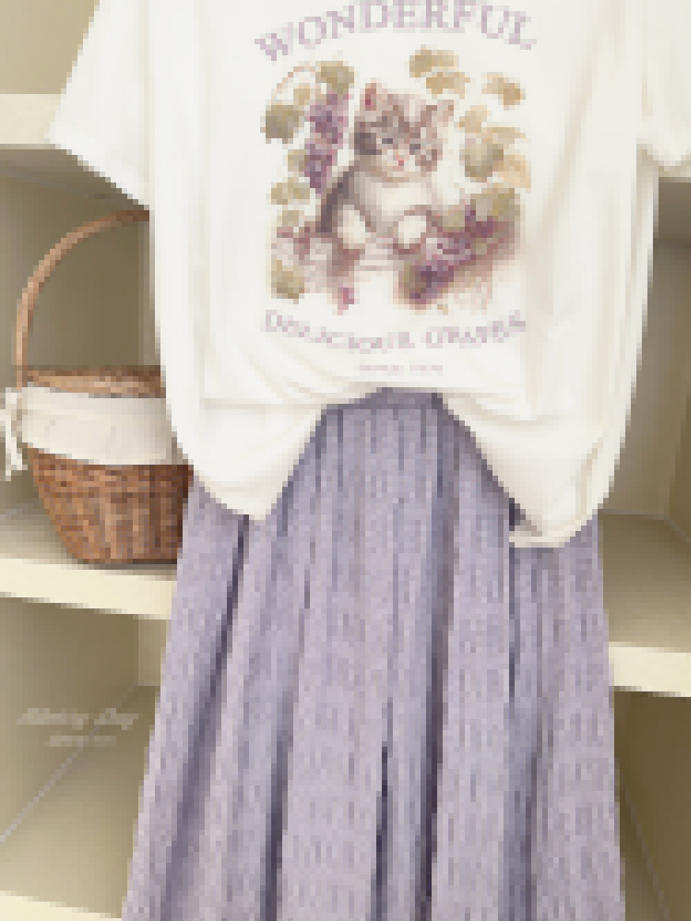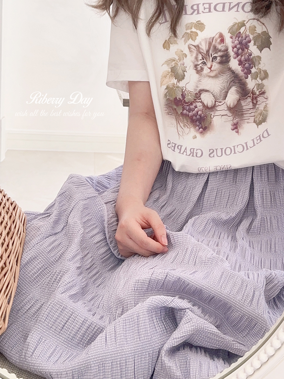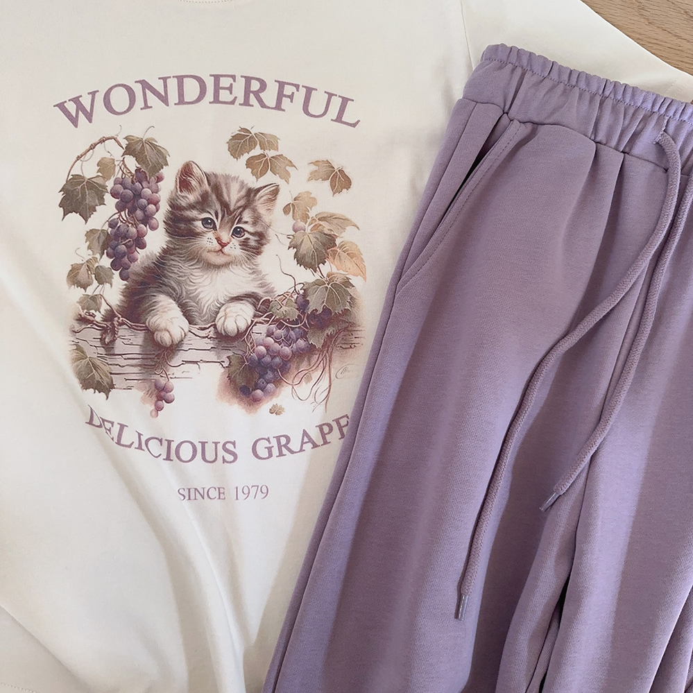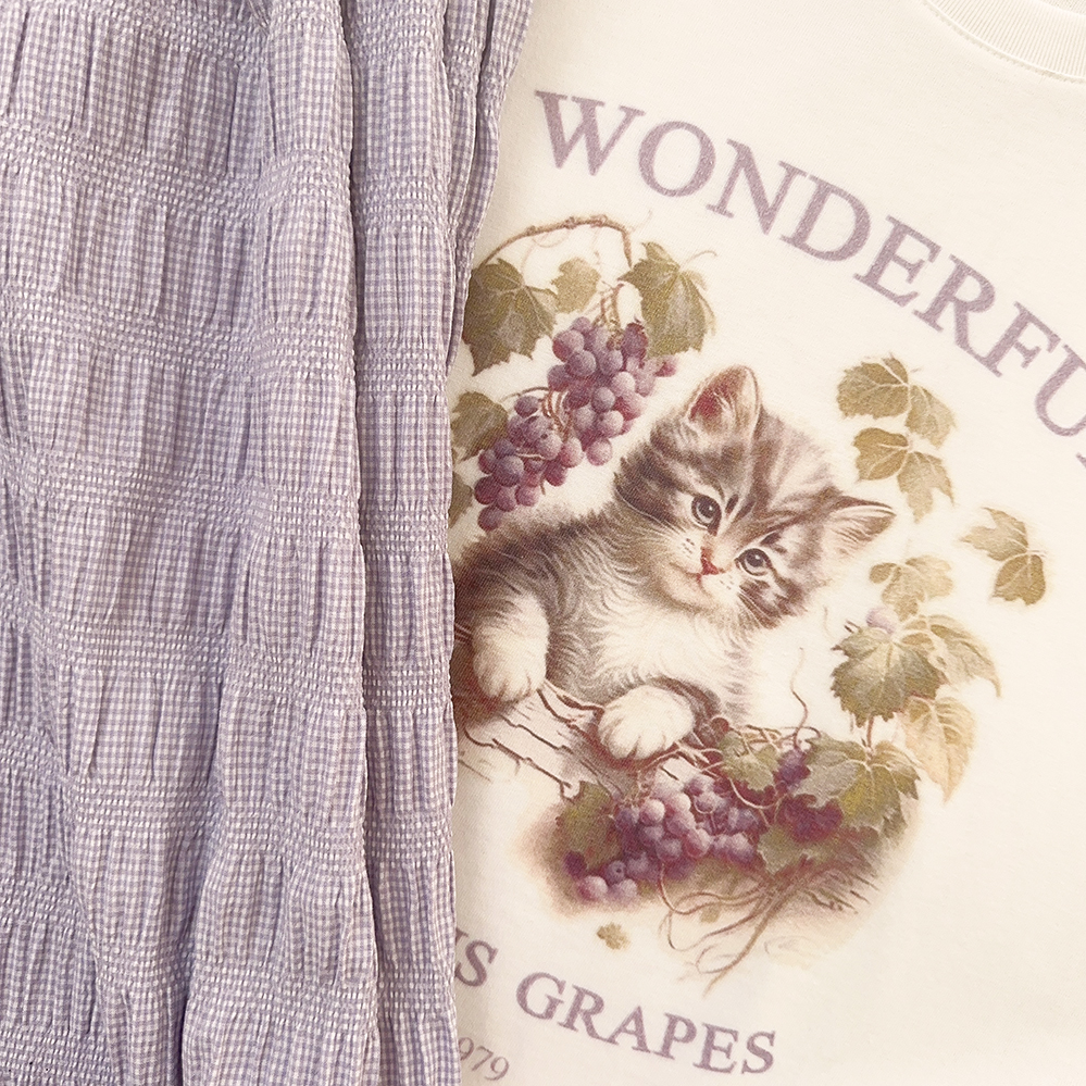 復古田園 葡萄貓咪 米色 顯瘦正肩 圓領 短袖T恤 U