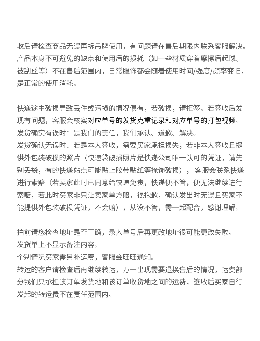 针织品忌热水洗,不可用力拉扯搓,洗后需脱水(针织品吸足水会被重力一直拉扯,人类皮肤也会被重力影响从紧致变得松弛,何况针织结构),若用洗衣机,请务必使用洗衣袋,以免强力机甩把针织品甩变形。需平铺晾晒,以免垂直悬挂后重力作用导致的拉长。很多洗涤产品为追求速净效果,含漂白成分(有的还不标明),久泡/浓度大/直接接触等不当操作会对衣物造成伤害,可能导致局部或整体脱色/串色/被漂白/被腐蚀等,请斟酌使用。卖家不对使用及洗晾导致的产品损耗负责。
