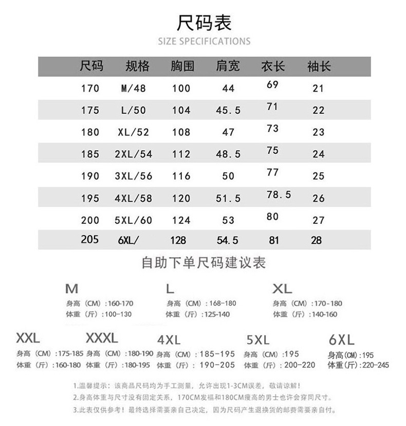 尺碼 170/M 175/L 180/XL 185/2XL 190/3XL 195/4XL 200/5XL 205/6XL