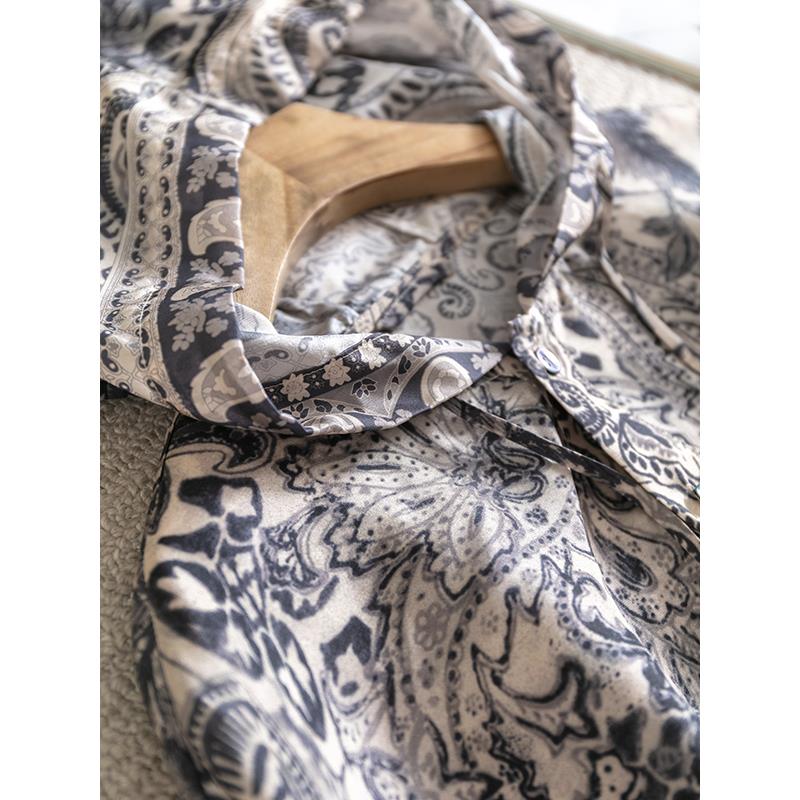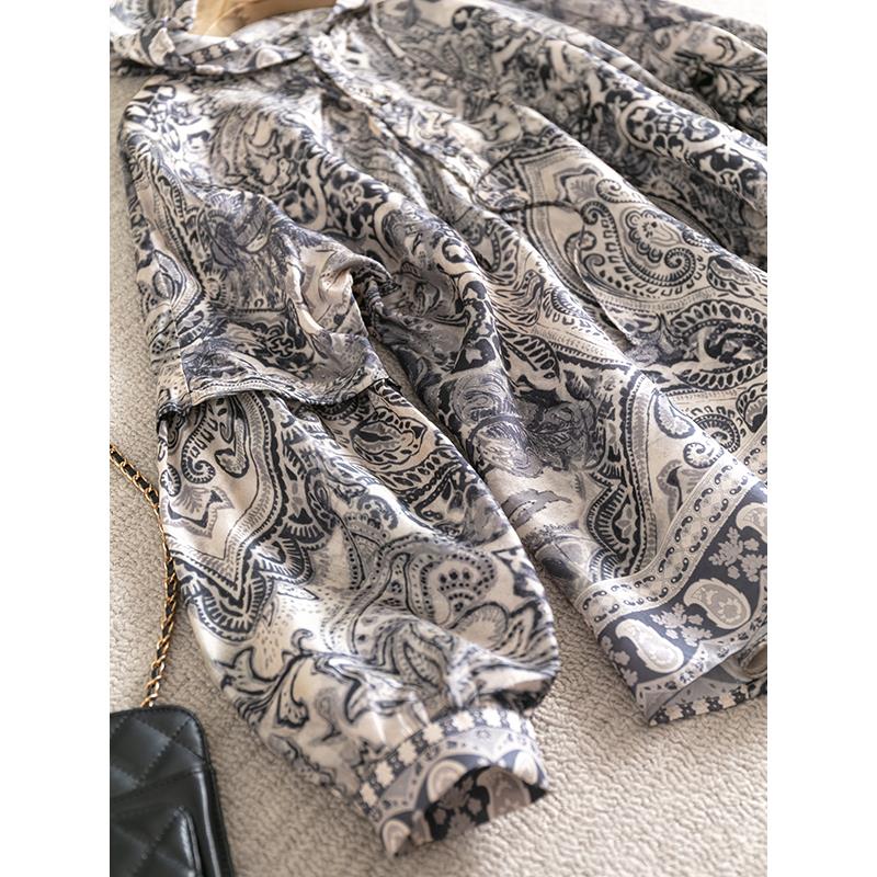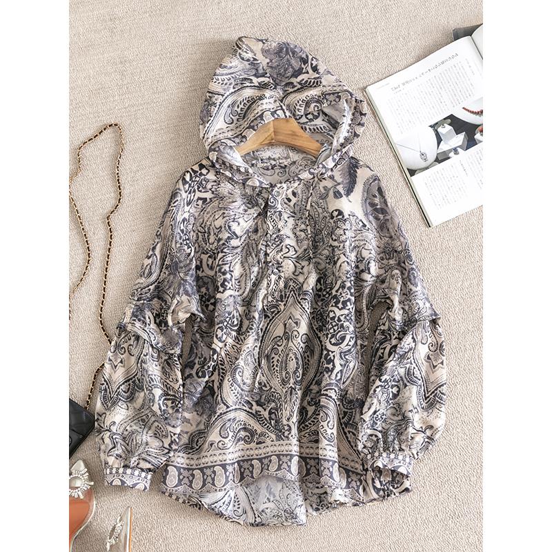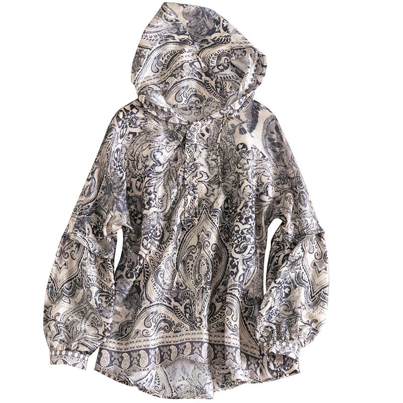 意國復古暗花真絲定位歐式印花寬鬆長袖連帽桑蠶絲上衣女[2023]